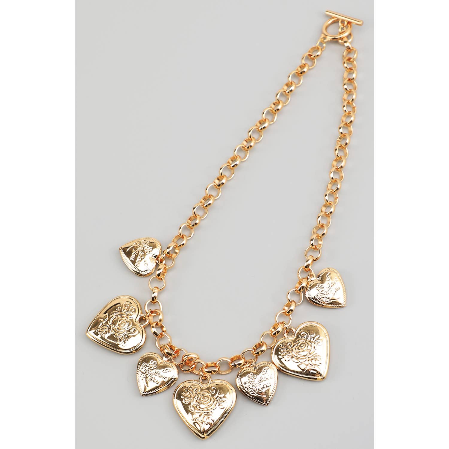 A stylish chunky toggle necklace featuring multi-heart locket charms. Perfect for adding a bold, romantic touch to any outfit with its eye-catching design and playful charm accents. LENGTH 15.5".