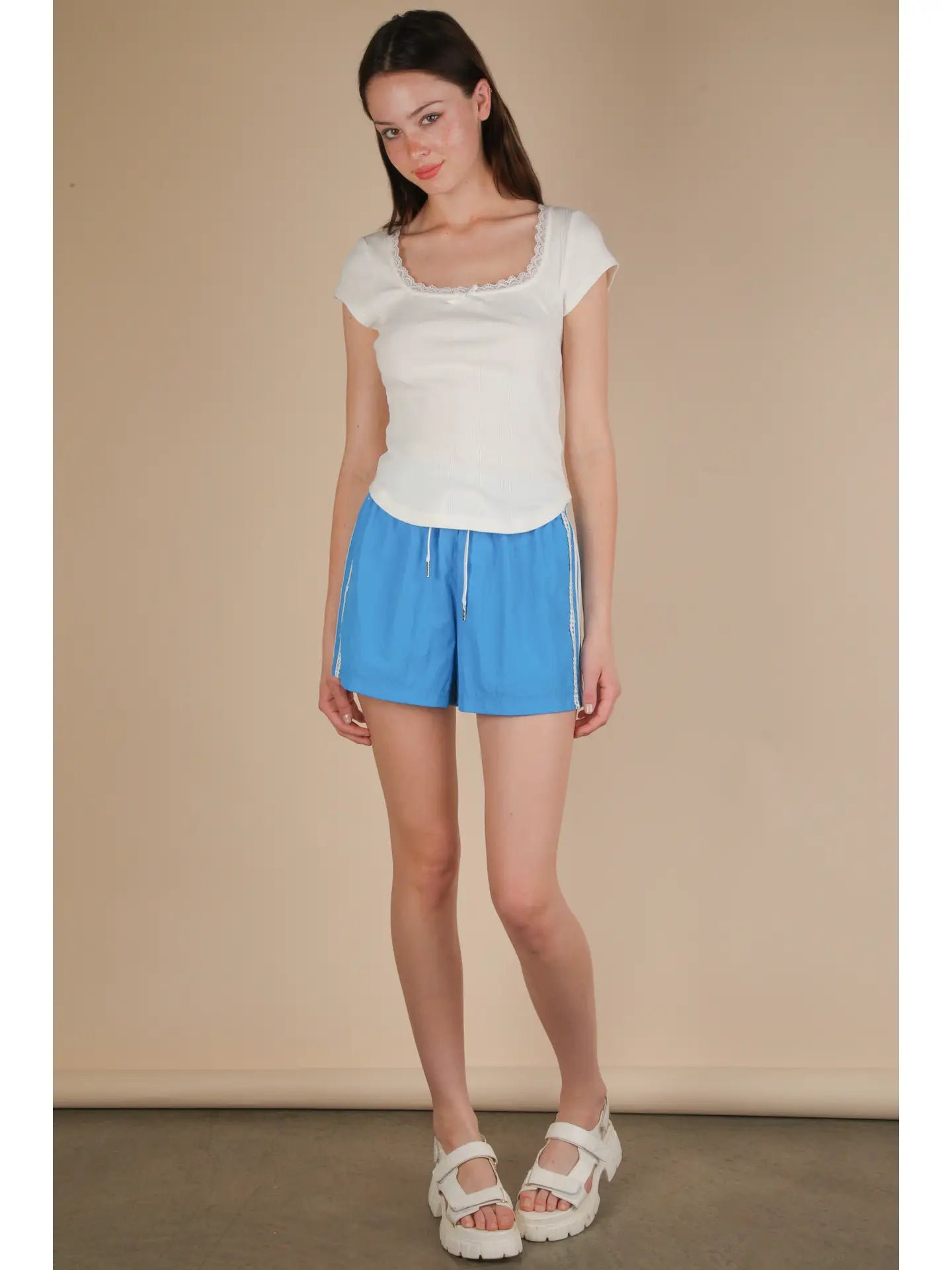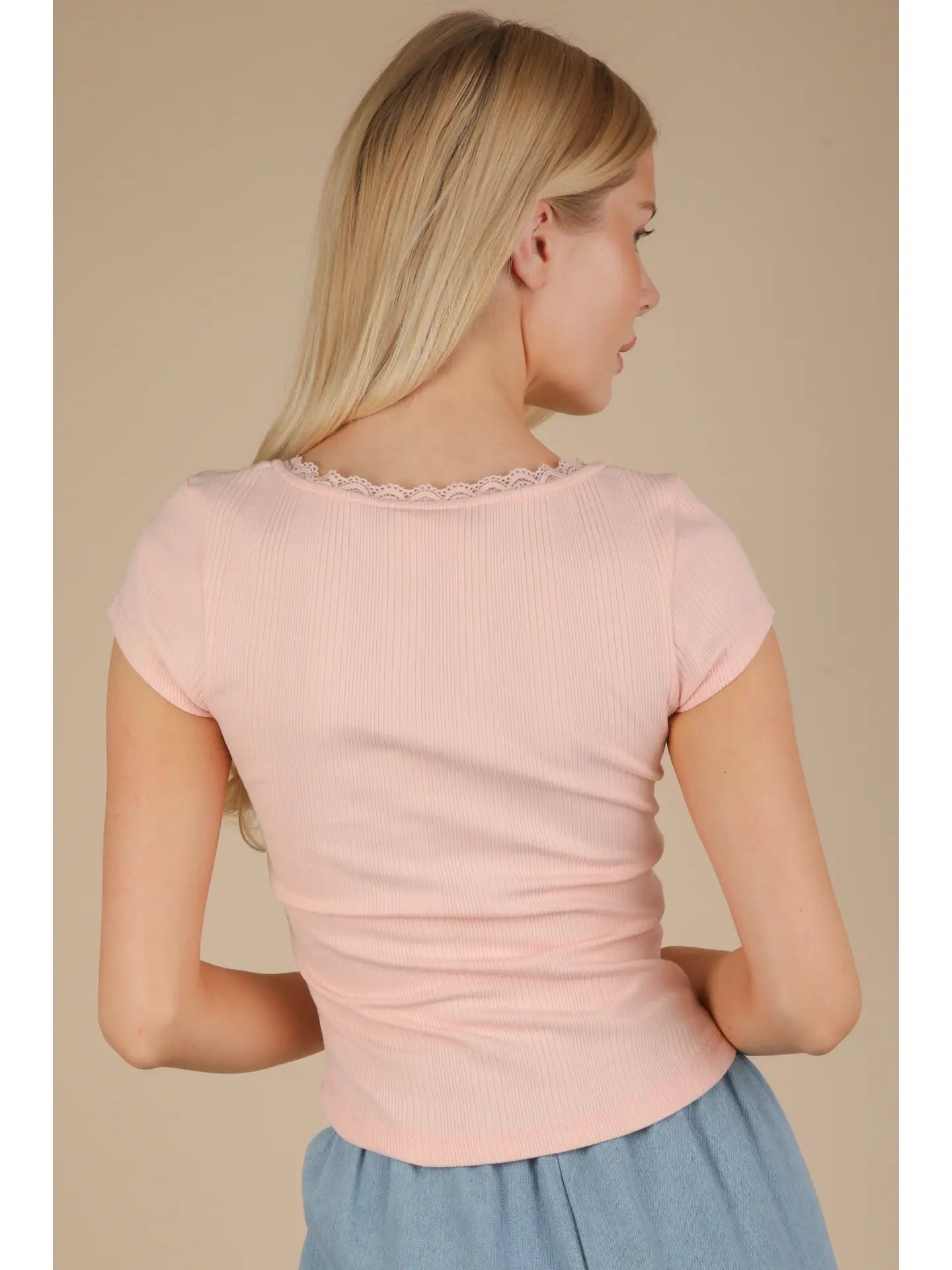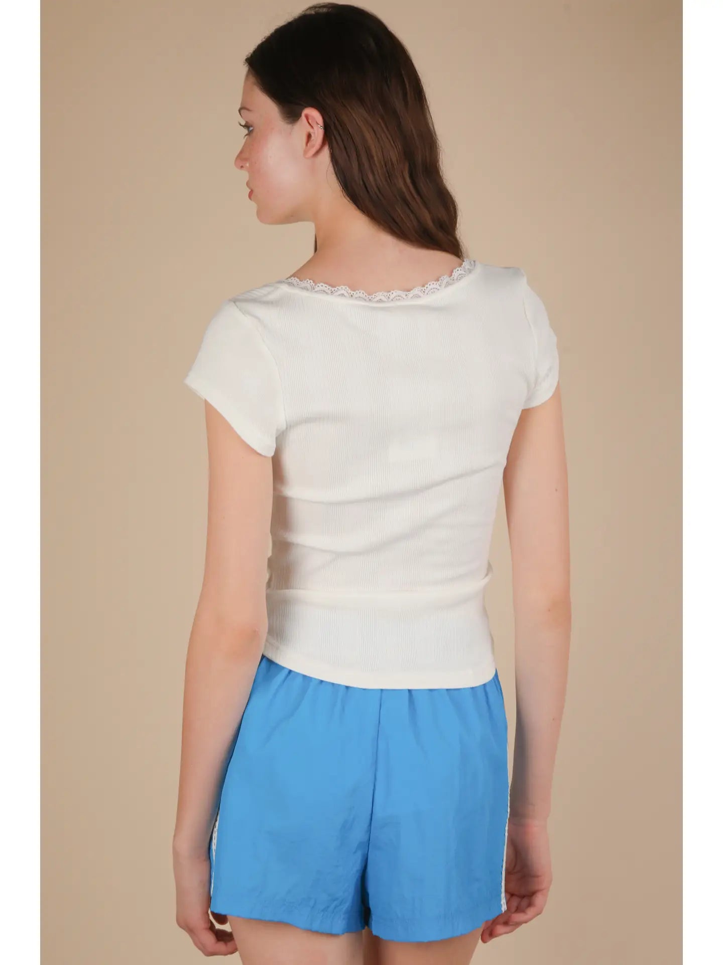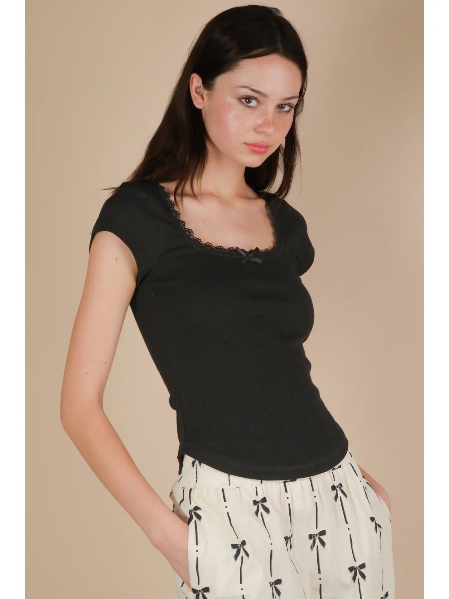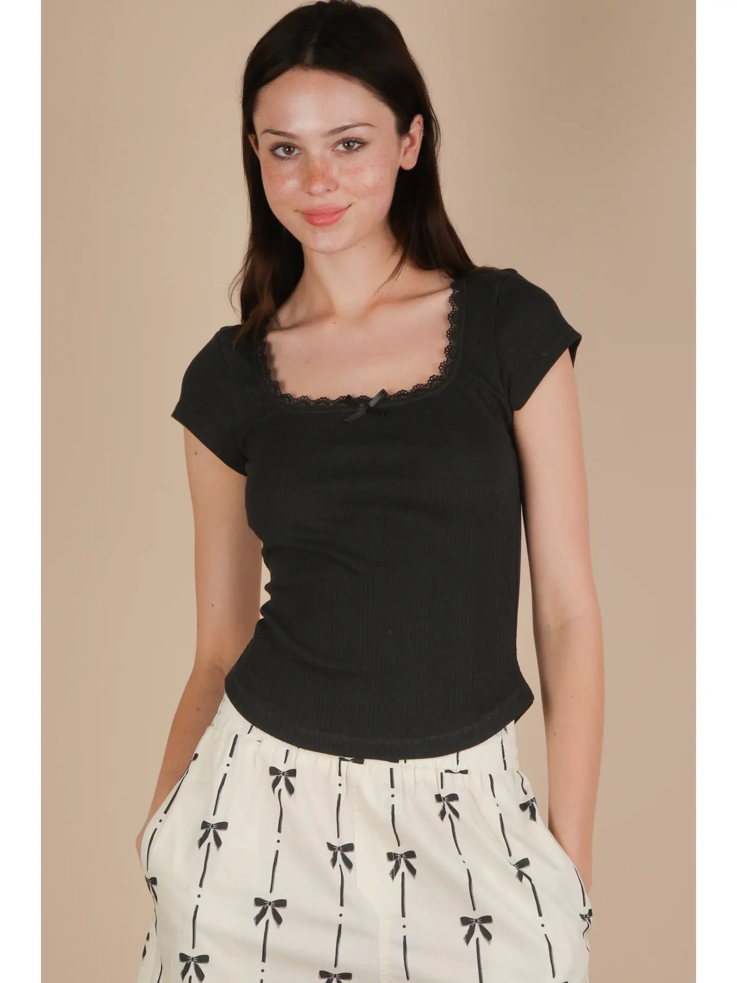 Sweet with a little edge, the Emma Top is a flirty essential for any season. Designed in a soft ribbed knit with delicate lace and bow trim, she features a deep round neckline, short sleeves, and a rounded hem for the perfect feminine finish. Pair Colette with denim, skirts, or layered under a blazer for that effortlessly chic vibe.