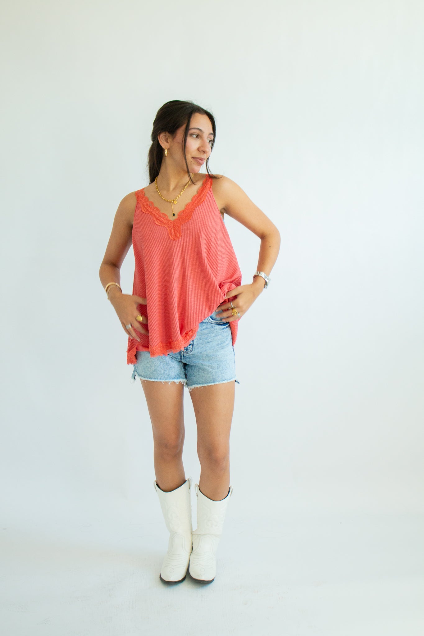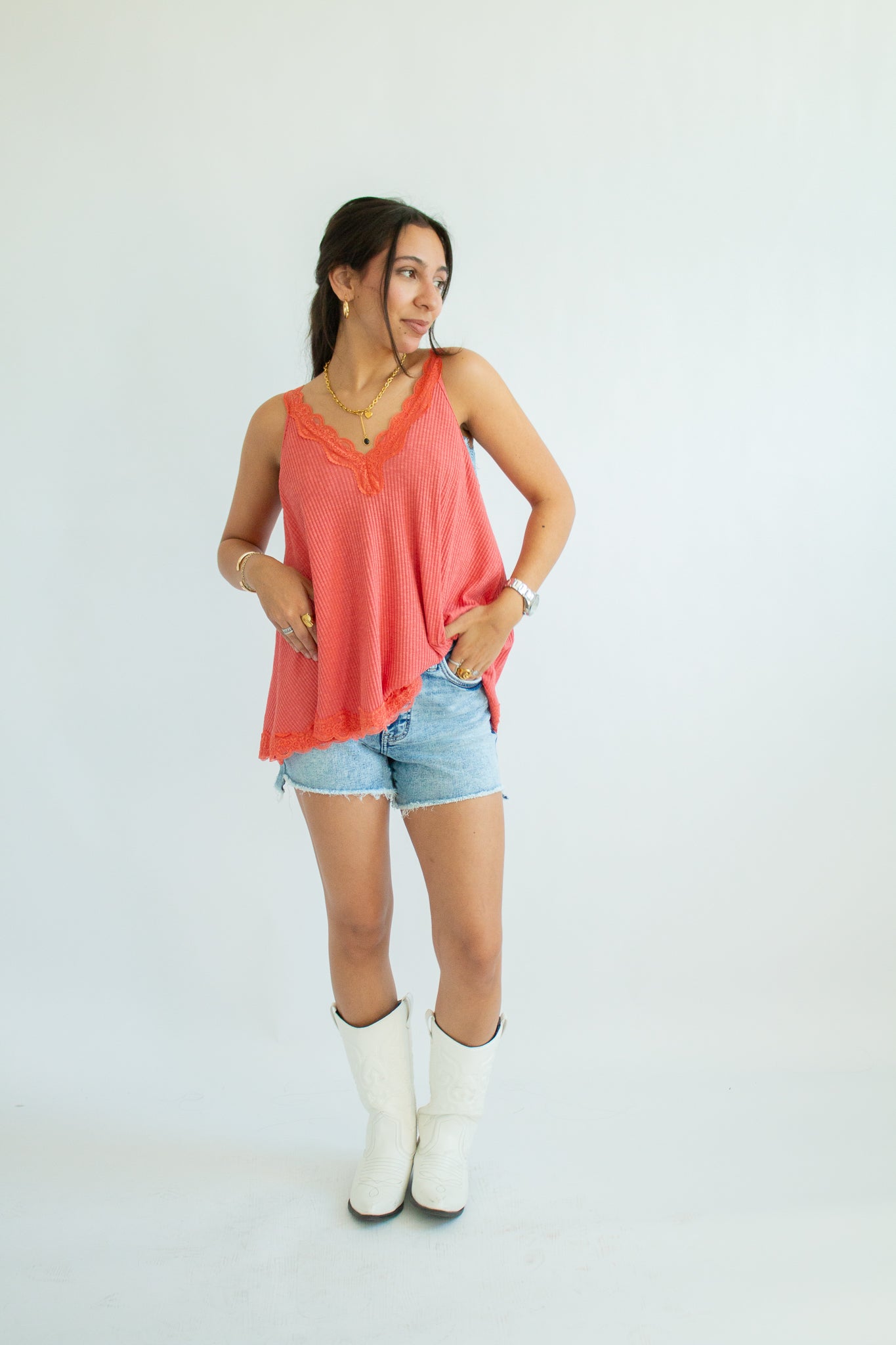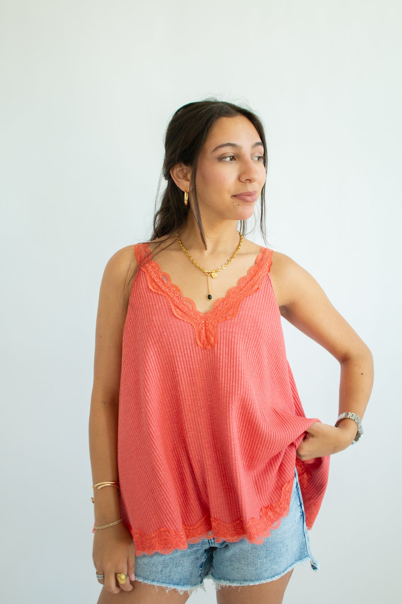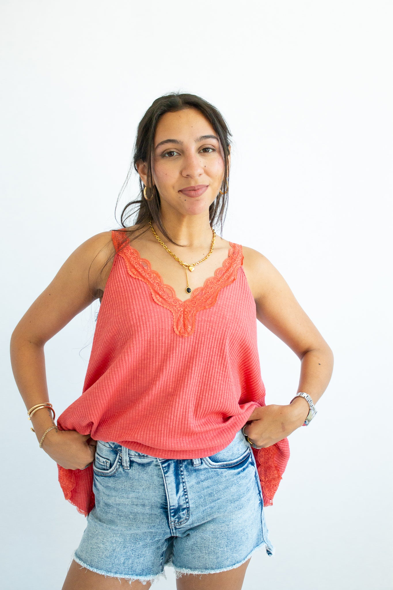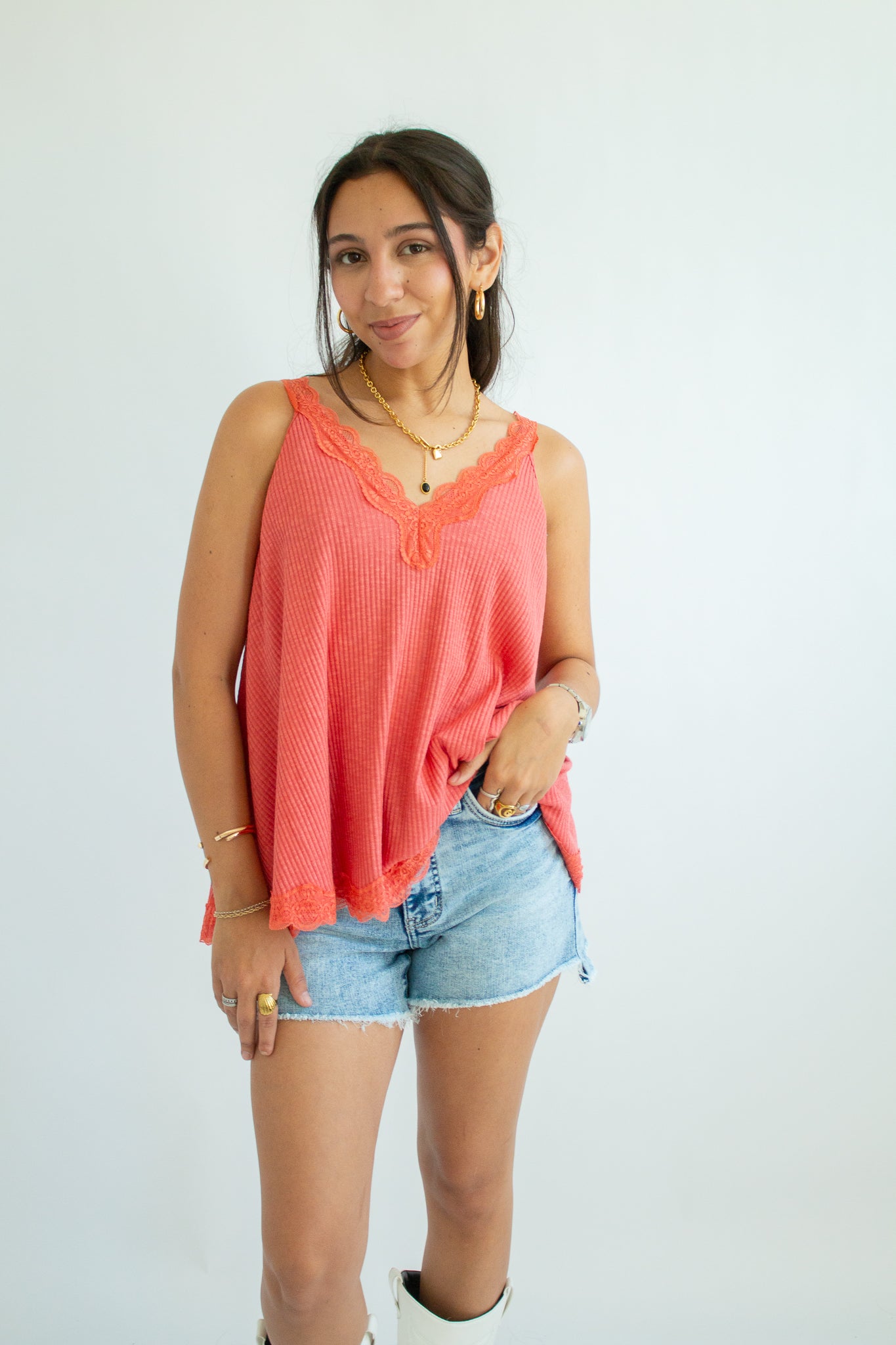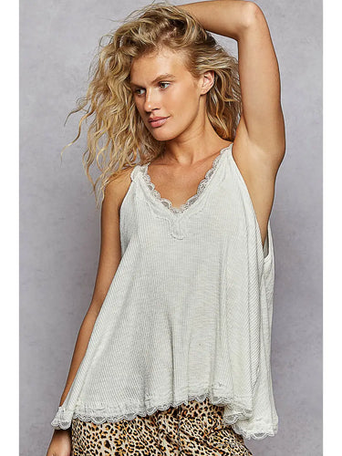 The Maisie Tank – a flirty, feminine staple with an effortlessly elevated vibe. Designed with a flattering V-neckline and delicate lace trim, this sleeveless top pairs a soft ribbed fabric with an A-line fit that drapes beautifully on every shape. Perfect for layering under cardigans or wearing solo for that subtle touch of romance.
