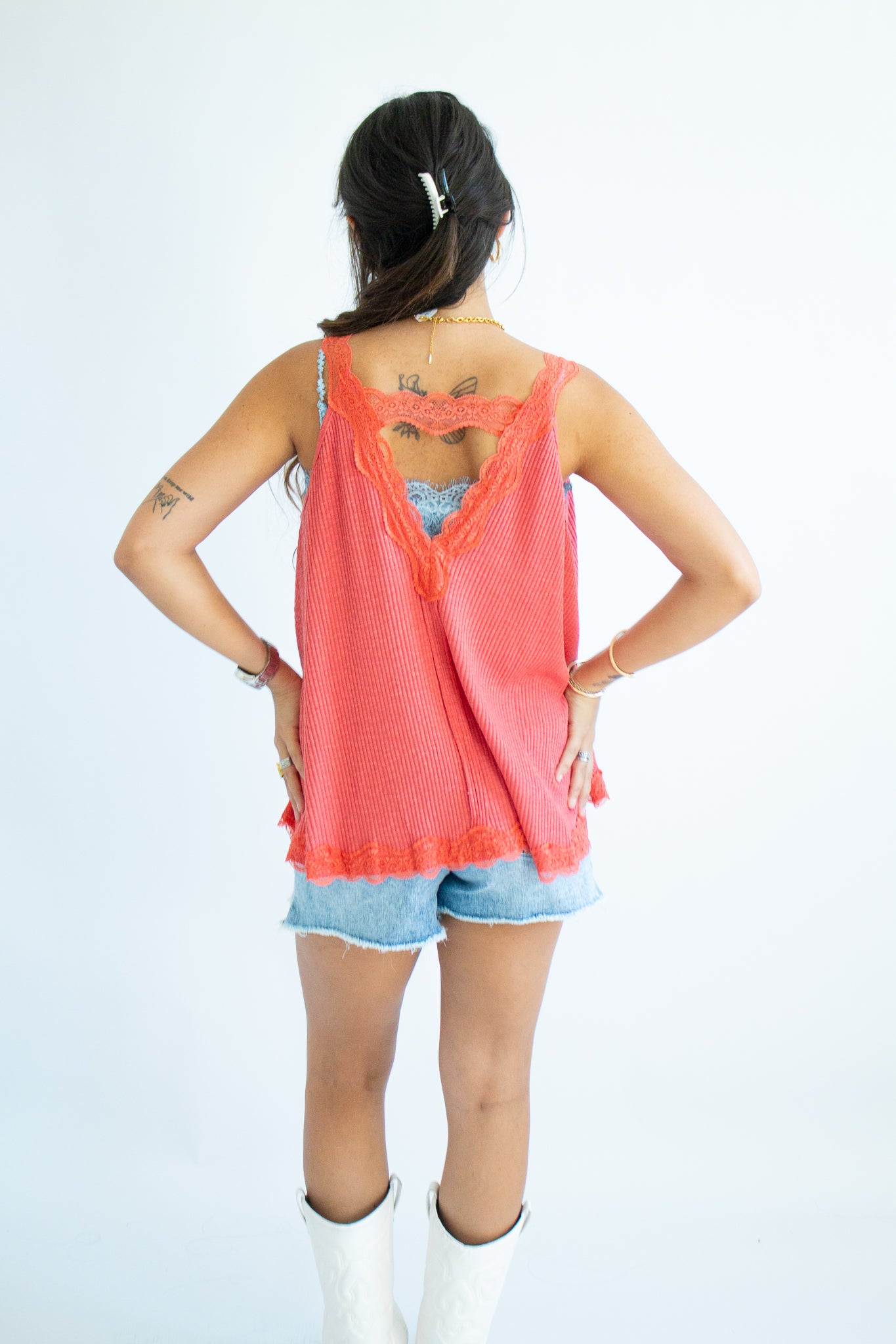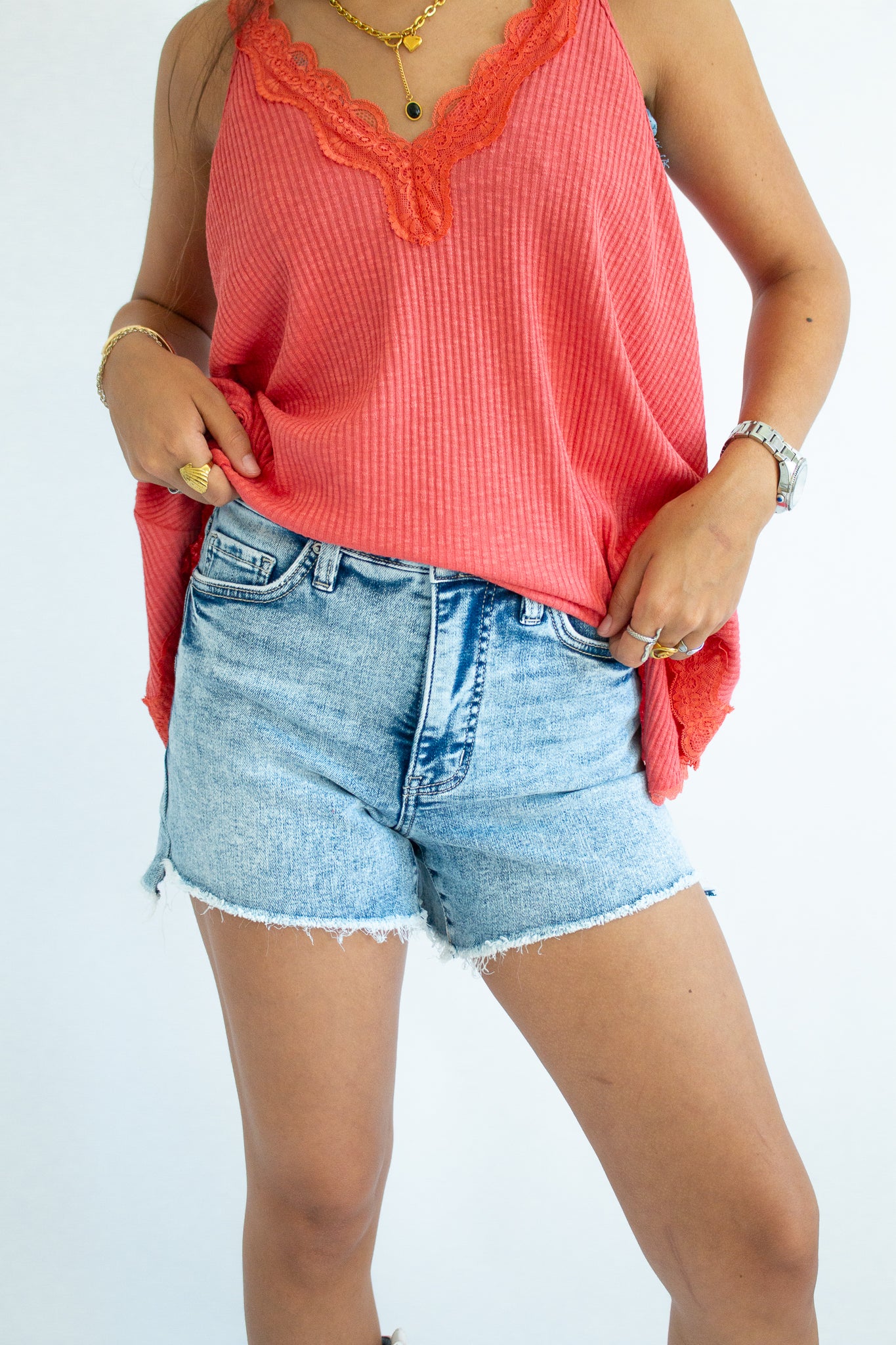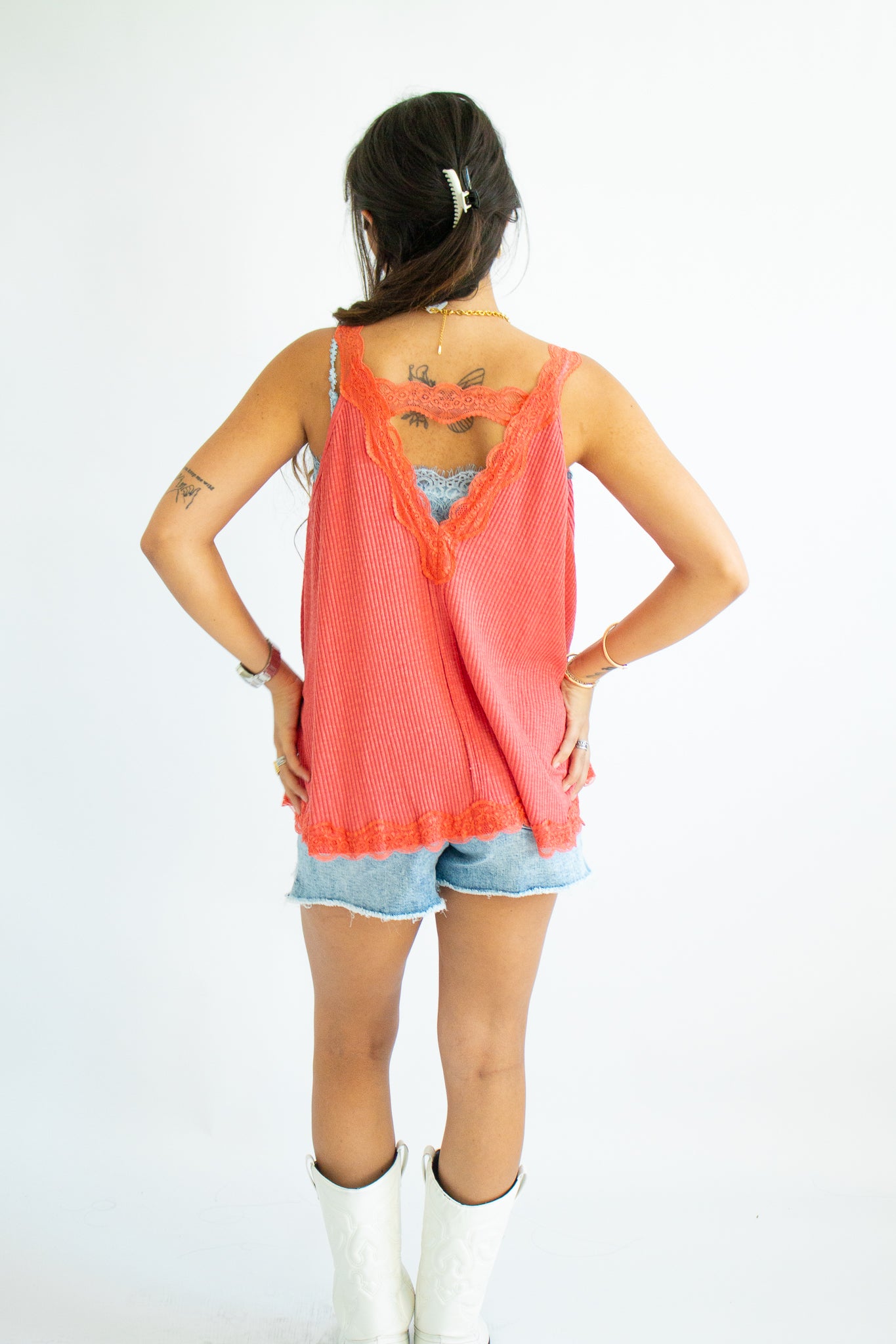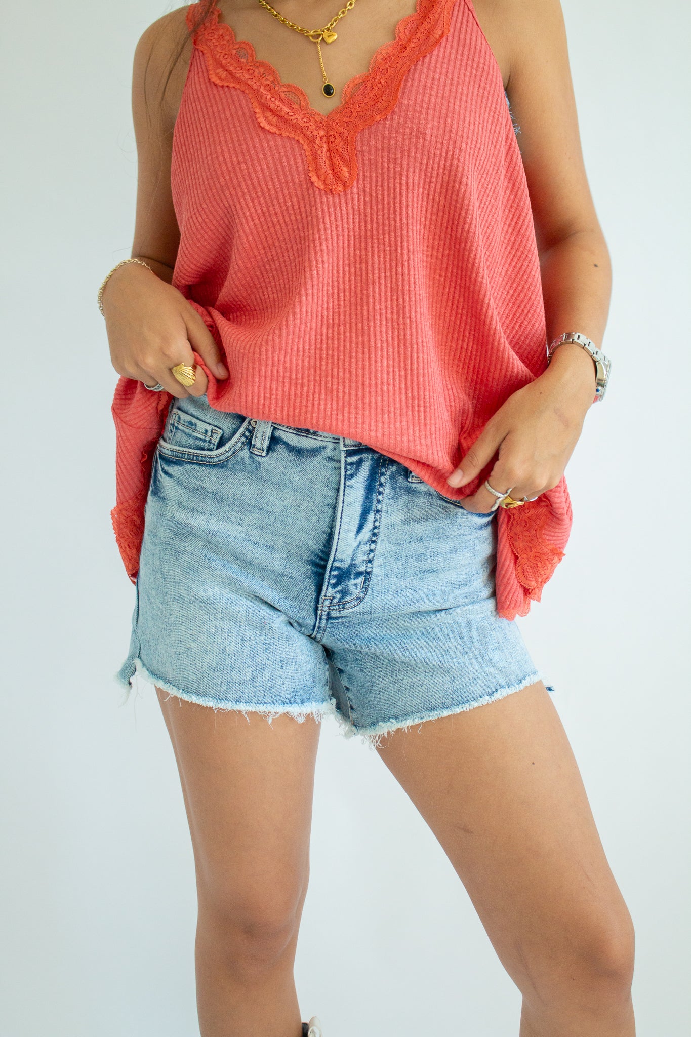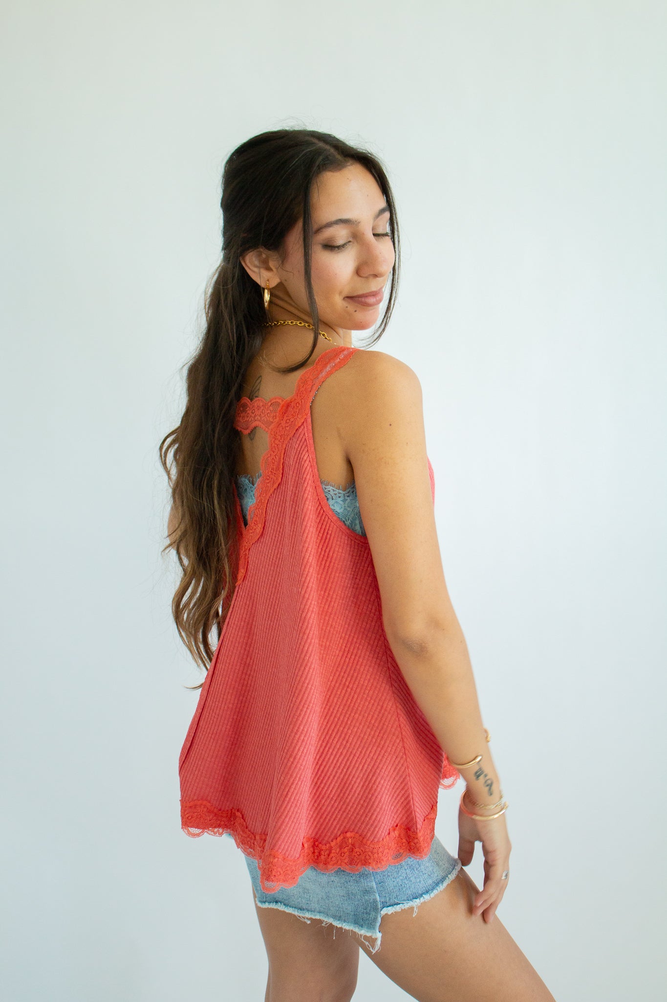 The Maisie Tank – a flirty, feminine staple with an effortlessly elevated vibe. Designed with a flattering V-neckline and delicate lace trim, this sleeveless top pairs a soft ribbed fabric with an A-line fit that drapes beautifully on every shape. Perfect for layering under cardigans or wearing solo for that subtle touch of romance.