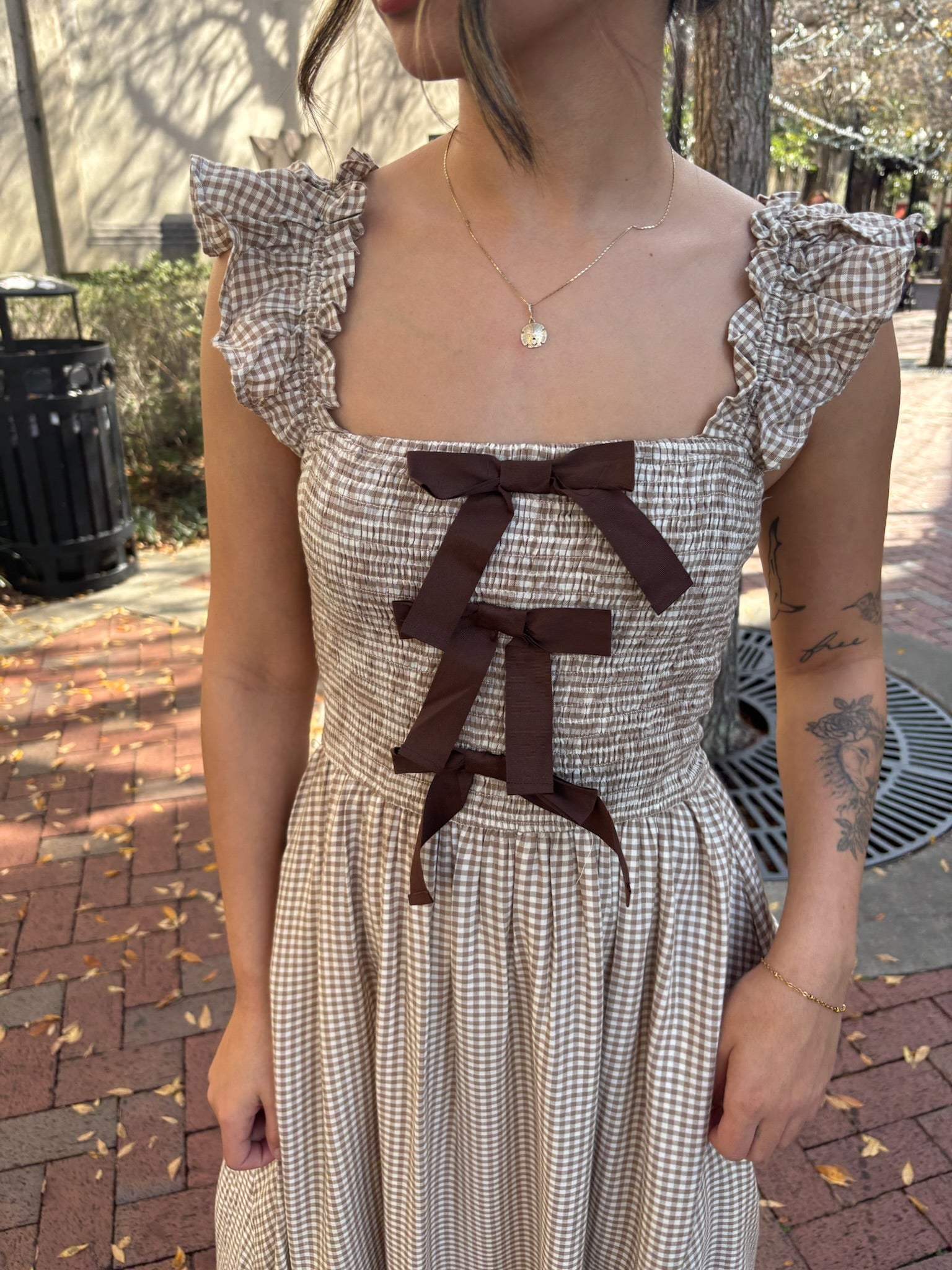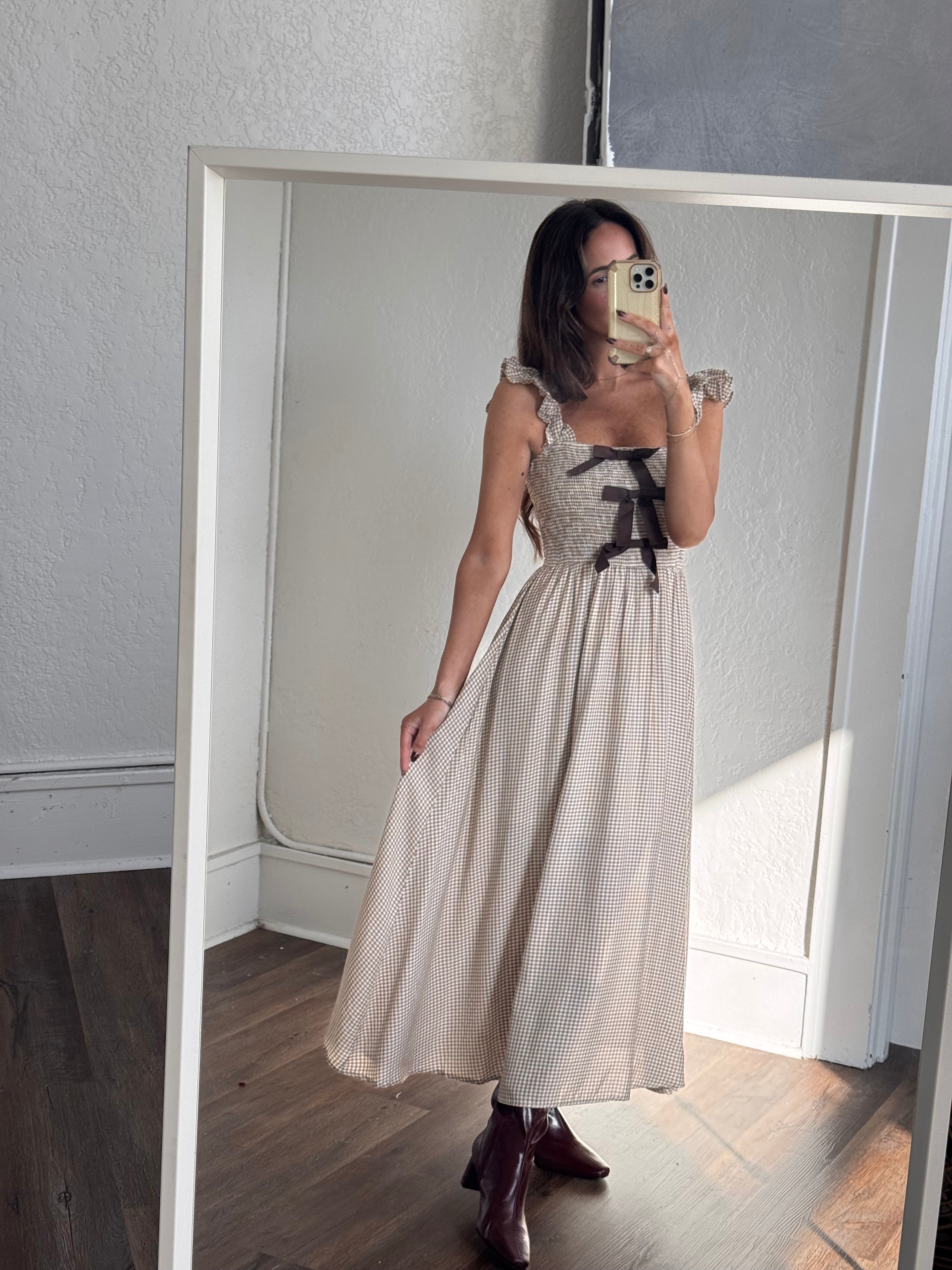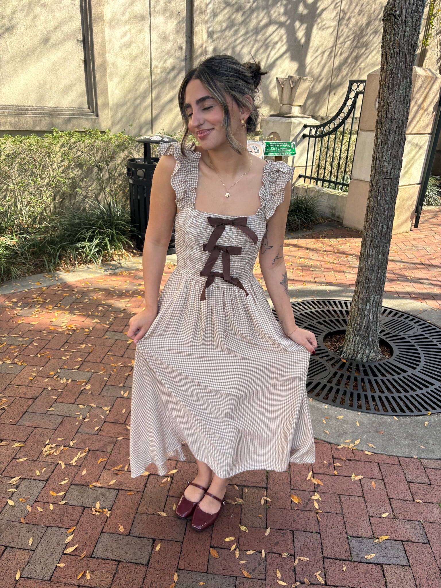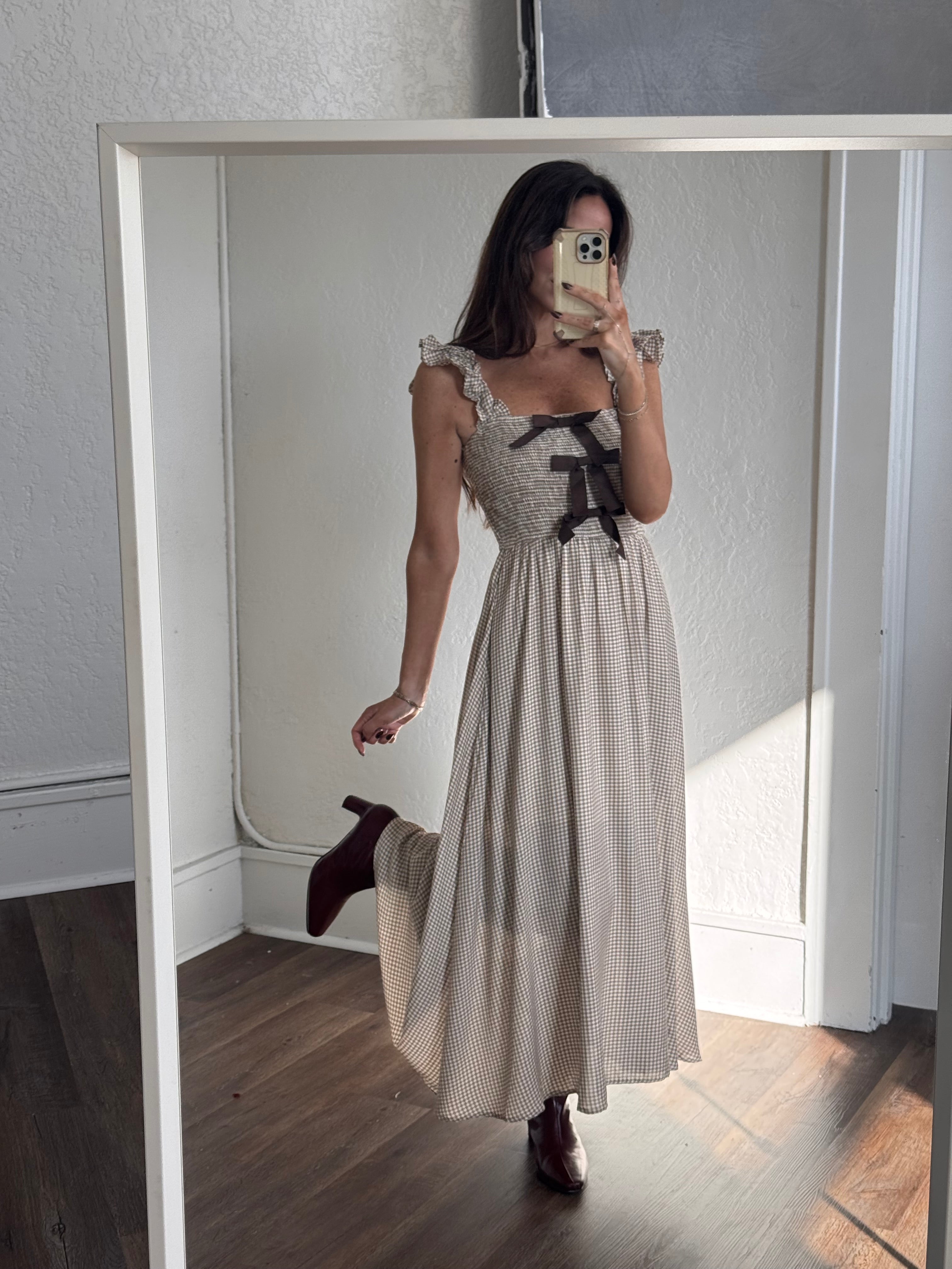 Sweet, feminine, and perfect for chilly-season charm, the Marietta Frostfall Midi Dress features a classic square neckline, short ruffle sleeves, and a fully smocked bodice for a flattering, comfortable fit. The front bow detail adds a soft romantic touch, while the A-line silhouette flows effortlessly in a timeless plaid pattern. Fully lined with stretch for ease, it’s a dreamy pick for brunch, gatherings, or cozy winter outings.
