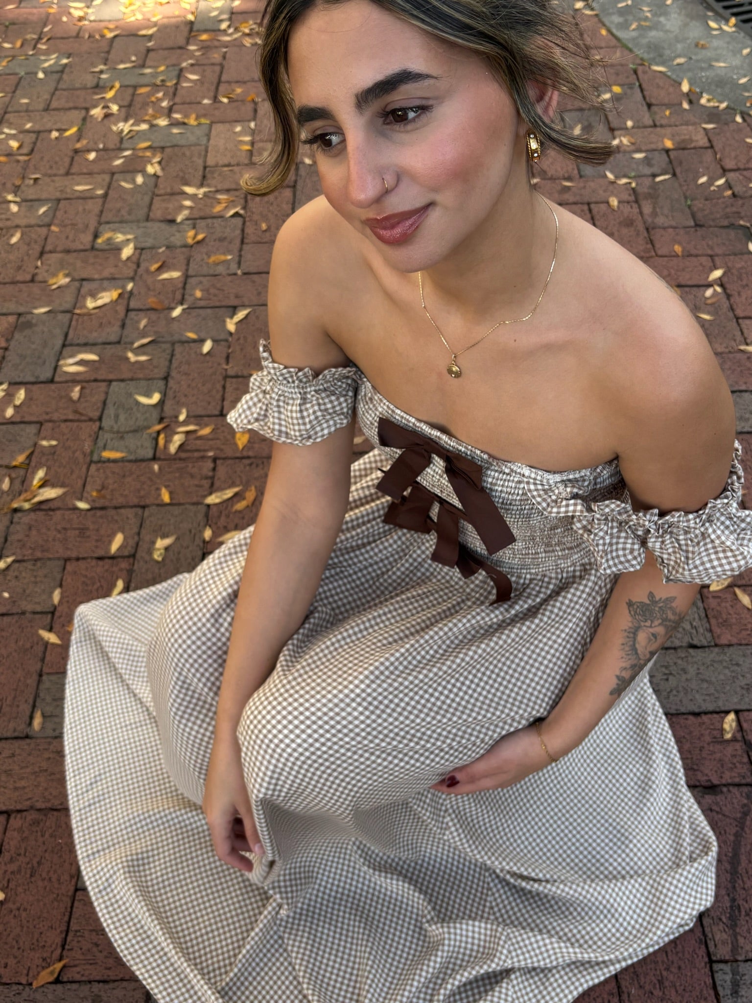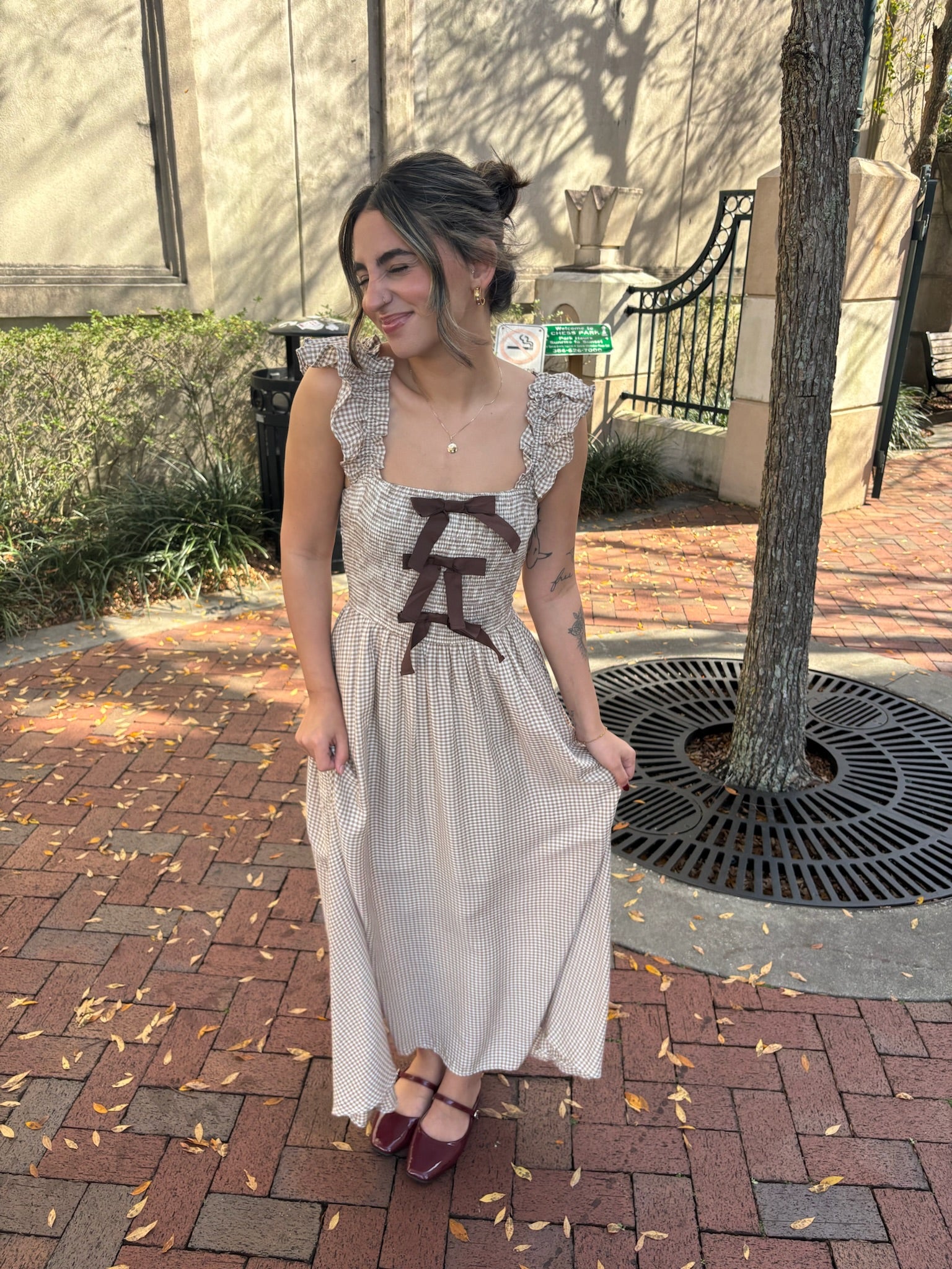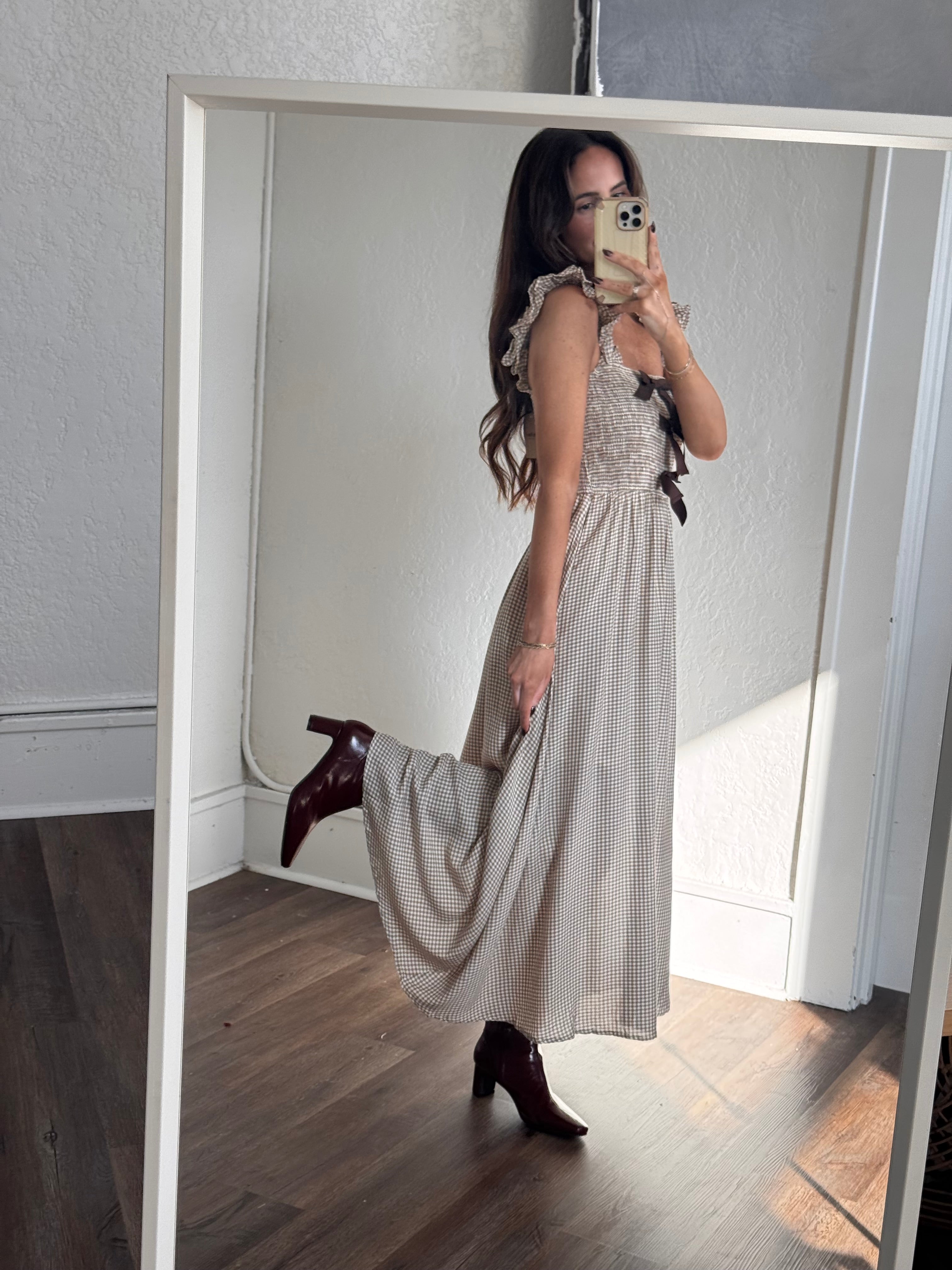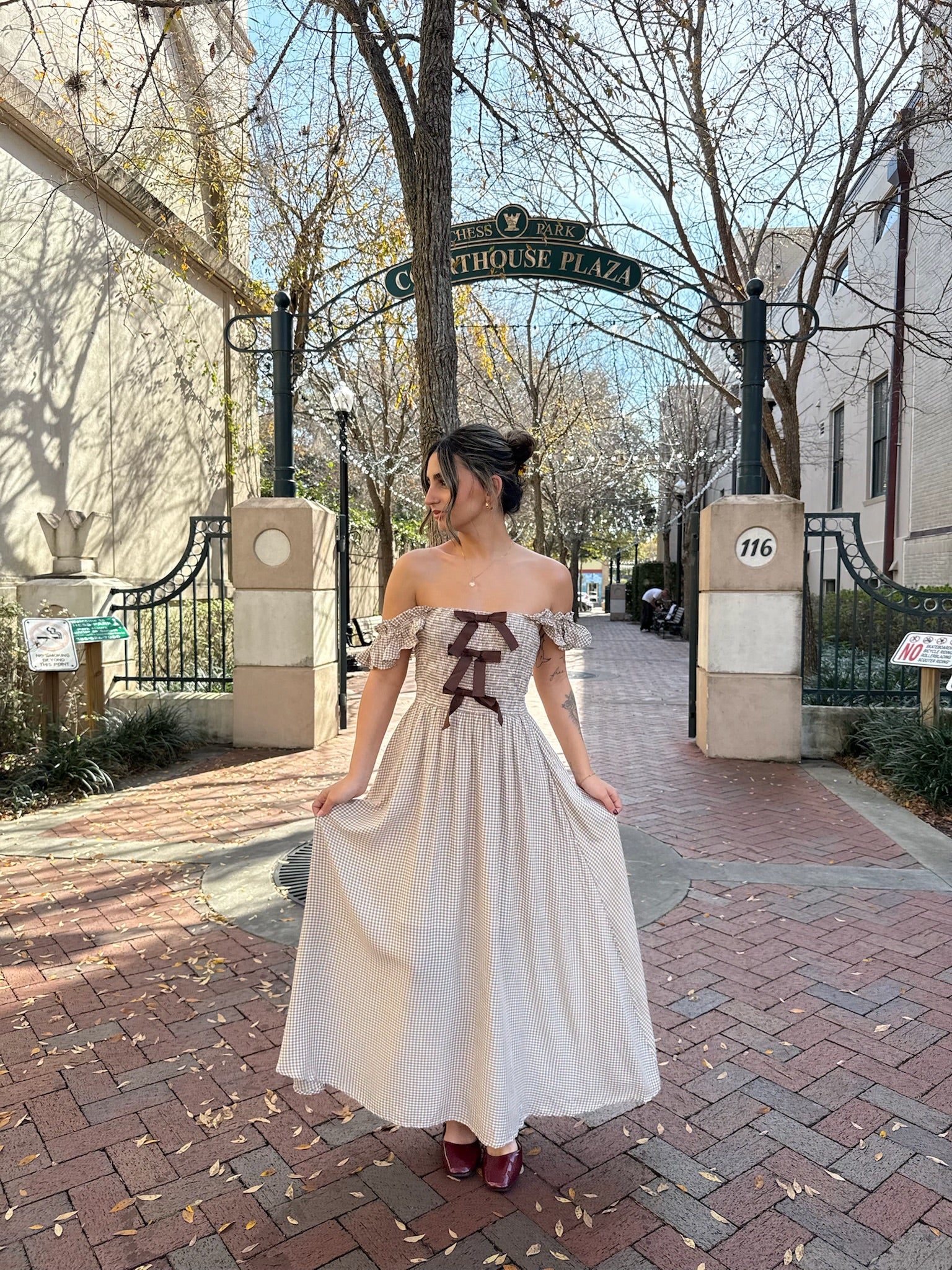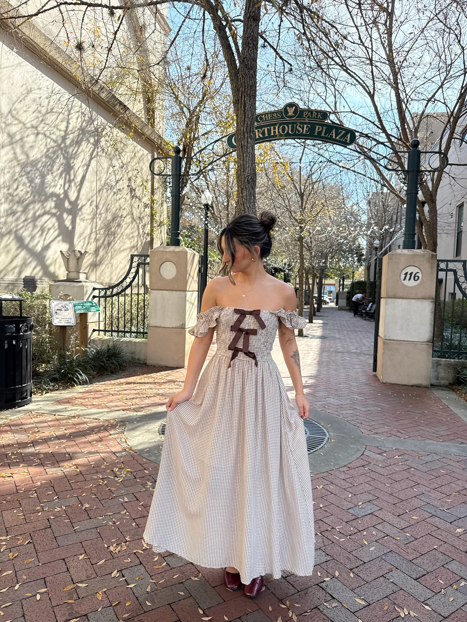 Sweet, feminine, and perfect for chilly-season charm, the Marietta Frostfall Midi Dress features a classic square neckline, short ruffle sleeves, and a fully smocked bodice for a flattering, comfortable fit. The front bow detail adds a soft romantic touch, while the A-line silhouette flows effortlessly in a timeless plaid pattern. Fully lined with stretch for ease, it’s a dreamy pick for brunch, gatherings, or cozy winter outings.