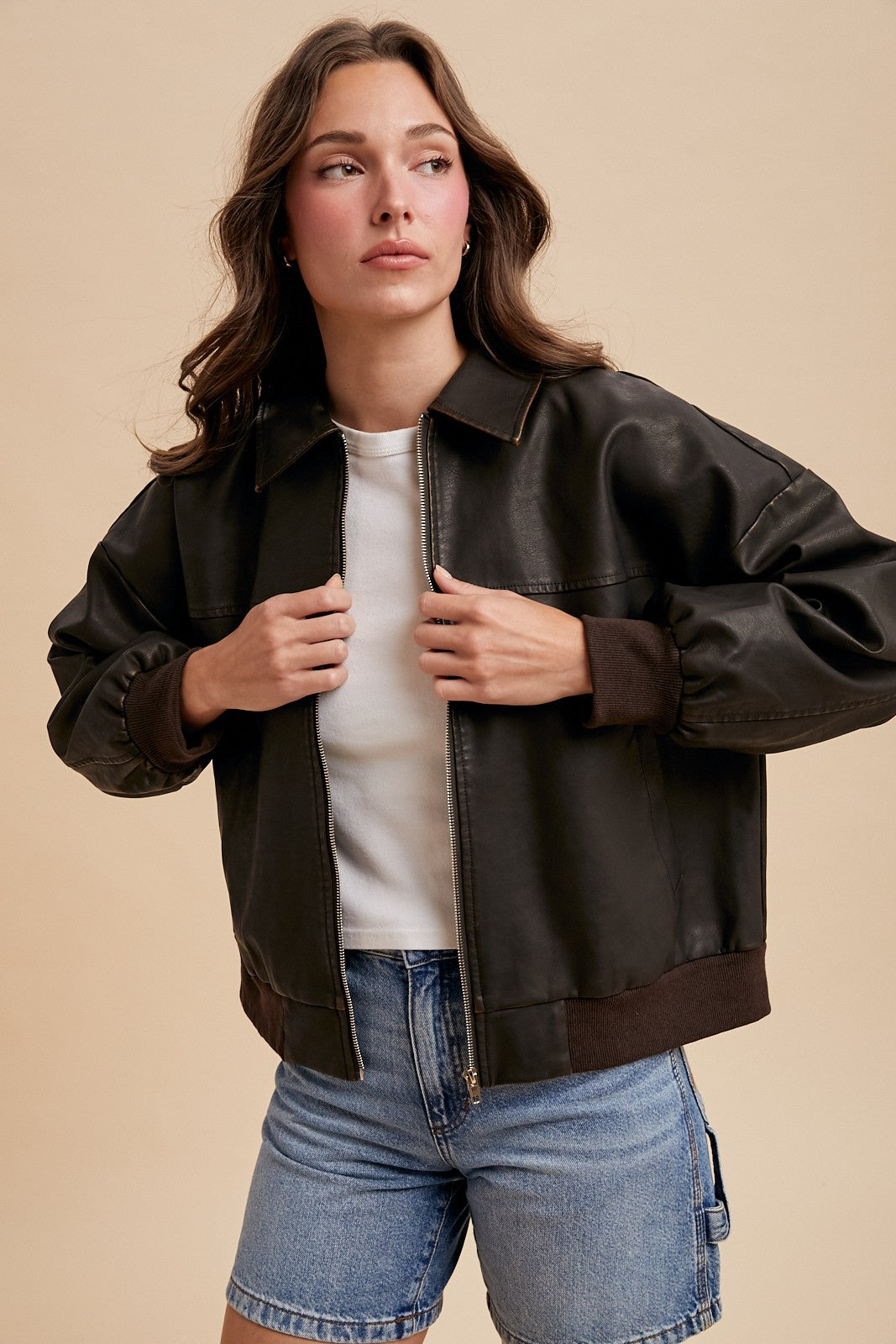 Crafted in a smooth, luxe faux leather, this oversized bomber brings that effortless cool-girl edge to every outfit. The drop-shoulder silhouette and slanted side pockets give it a relaxed, borrowed-from-the-boys vibe, while the contrast ribbed cuffs and hem add structure and a touch of vintage charm. Finished with a clean front zipper closure, itās the perfect throw-on layer for denim days, cozy winter fits, or a sleek city-night look. A modern essential with Scandinavian ease and winter-ready style.