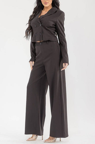 Complete the look with the Midnight Cocoa Trouser Pants — designed to pair seamlessly with the matching blazer. These high-rise pants feature a button closure and a flowing wide-leg silhouette that elongates the legs while keeping things effortlessly chic. Whether worn as a full set or styled separately, they’re a timeless wardrobe staple.