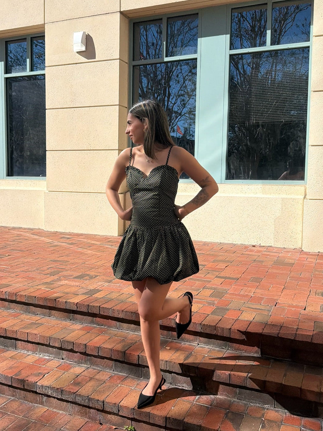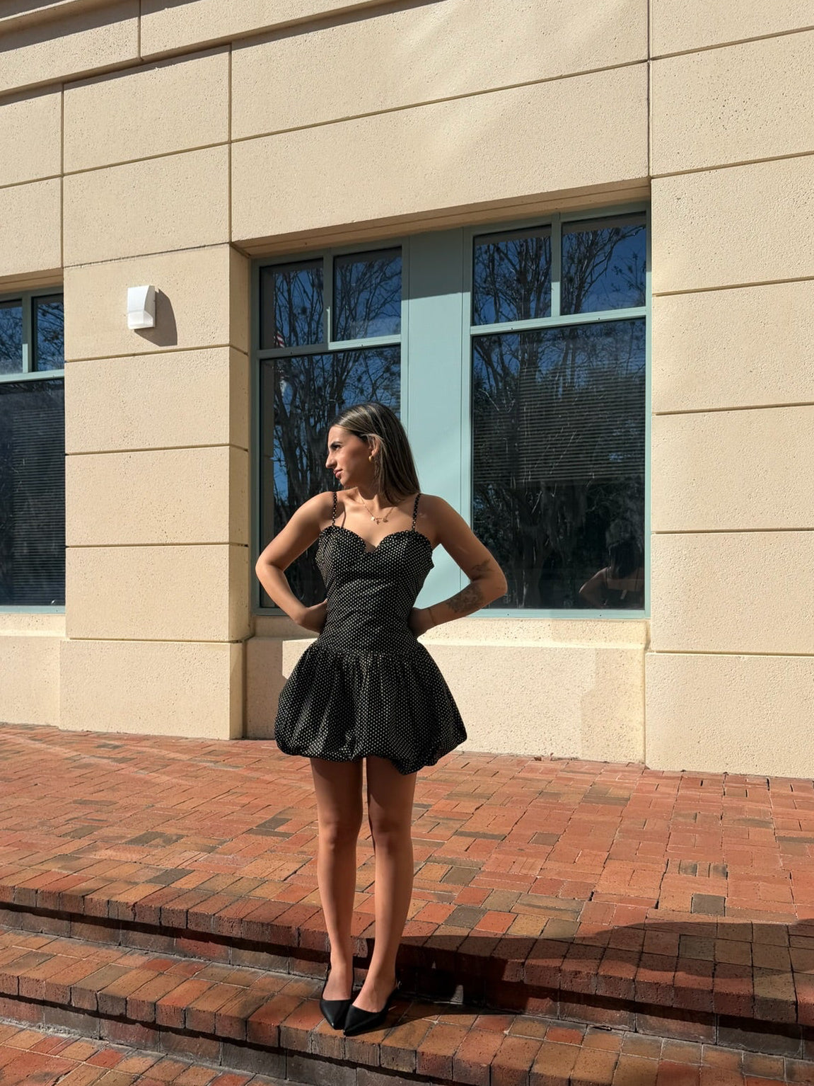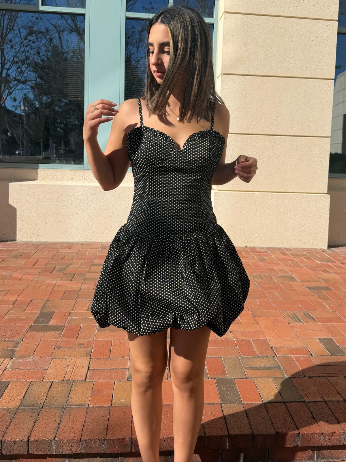 Flirty, fun, and effortlessly chic 🖤 The Gina Polka Dot Bubble Dress is your go-to for sunny days, date nights, and everything in between. Featuring a classic black-and-white polka dot print, this mini dress is designed with delicate spaghetti straps, a softly structured bodice, and a playful bubble hem that adds volume and movement in all the right places. It’s timeless with a twist—cute enough for brunch, polished enough for evening plans.