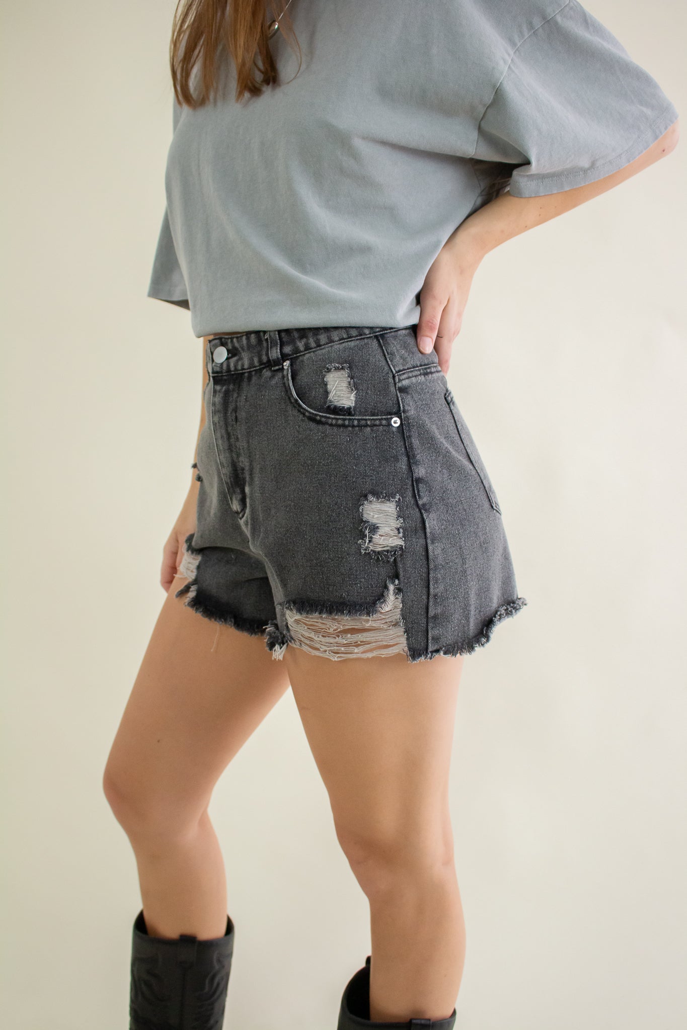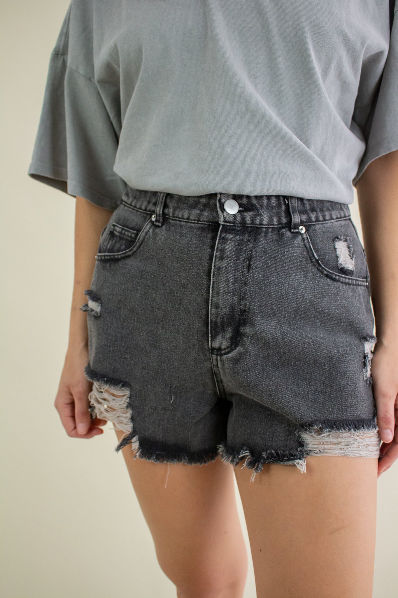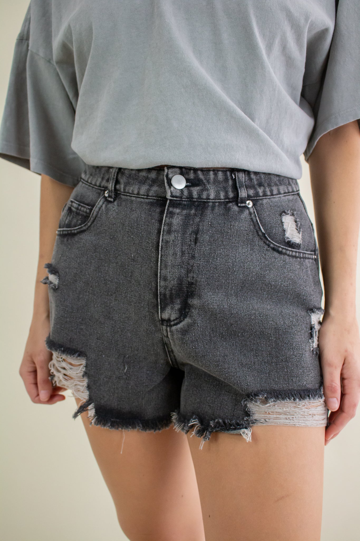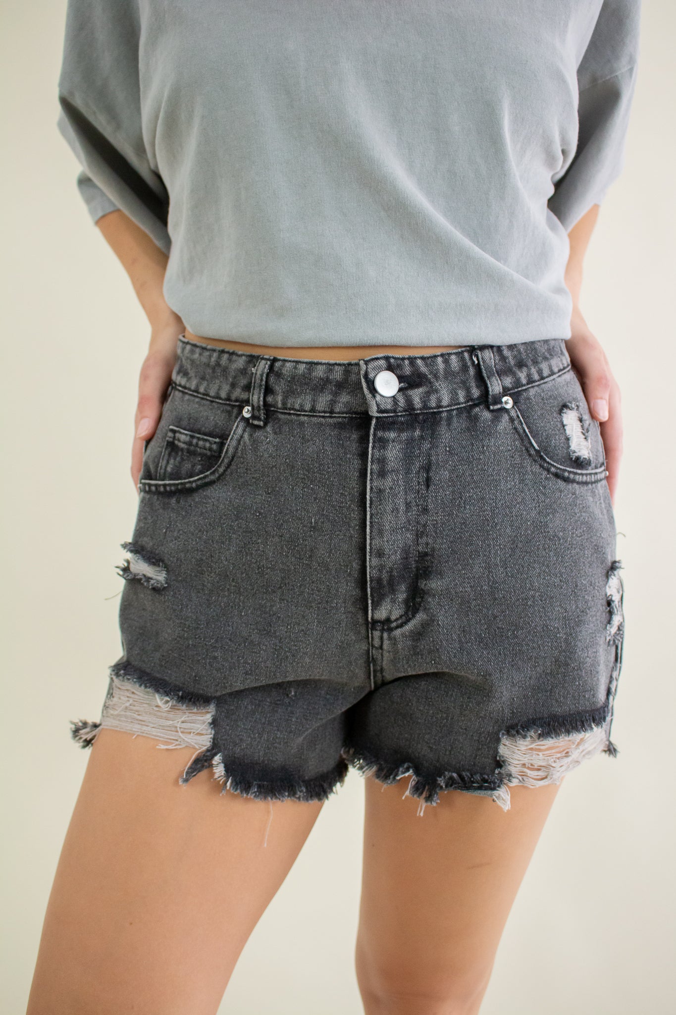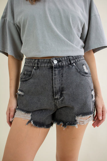 Washed out black denim shorts featuring a high rise waist, heavy distressing, zipper fly closure, belt loops, pockets and a 2" inseam.