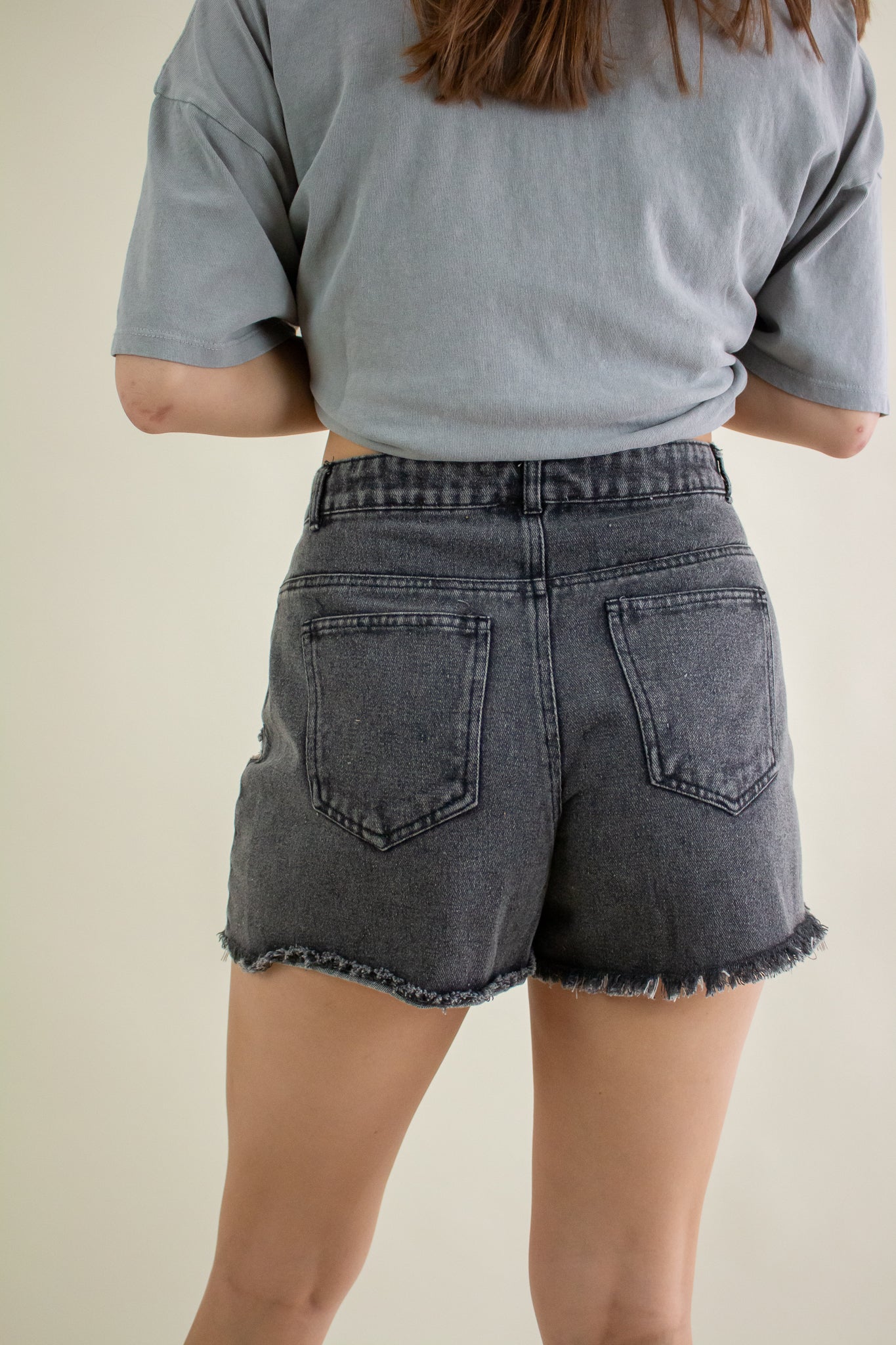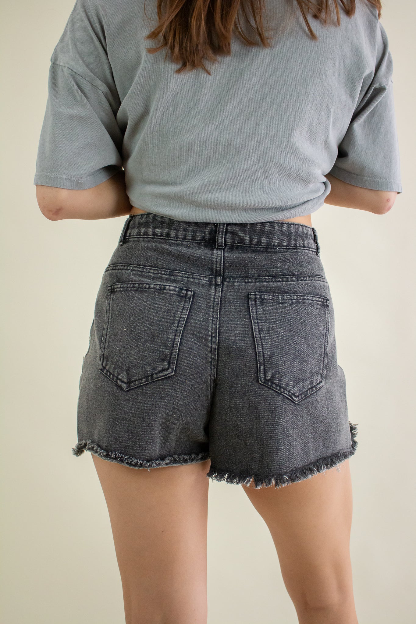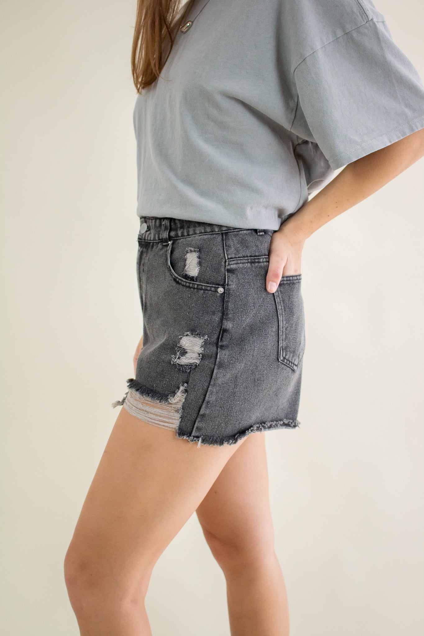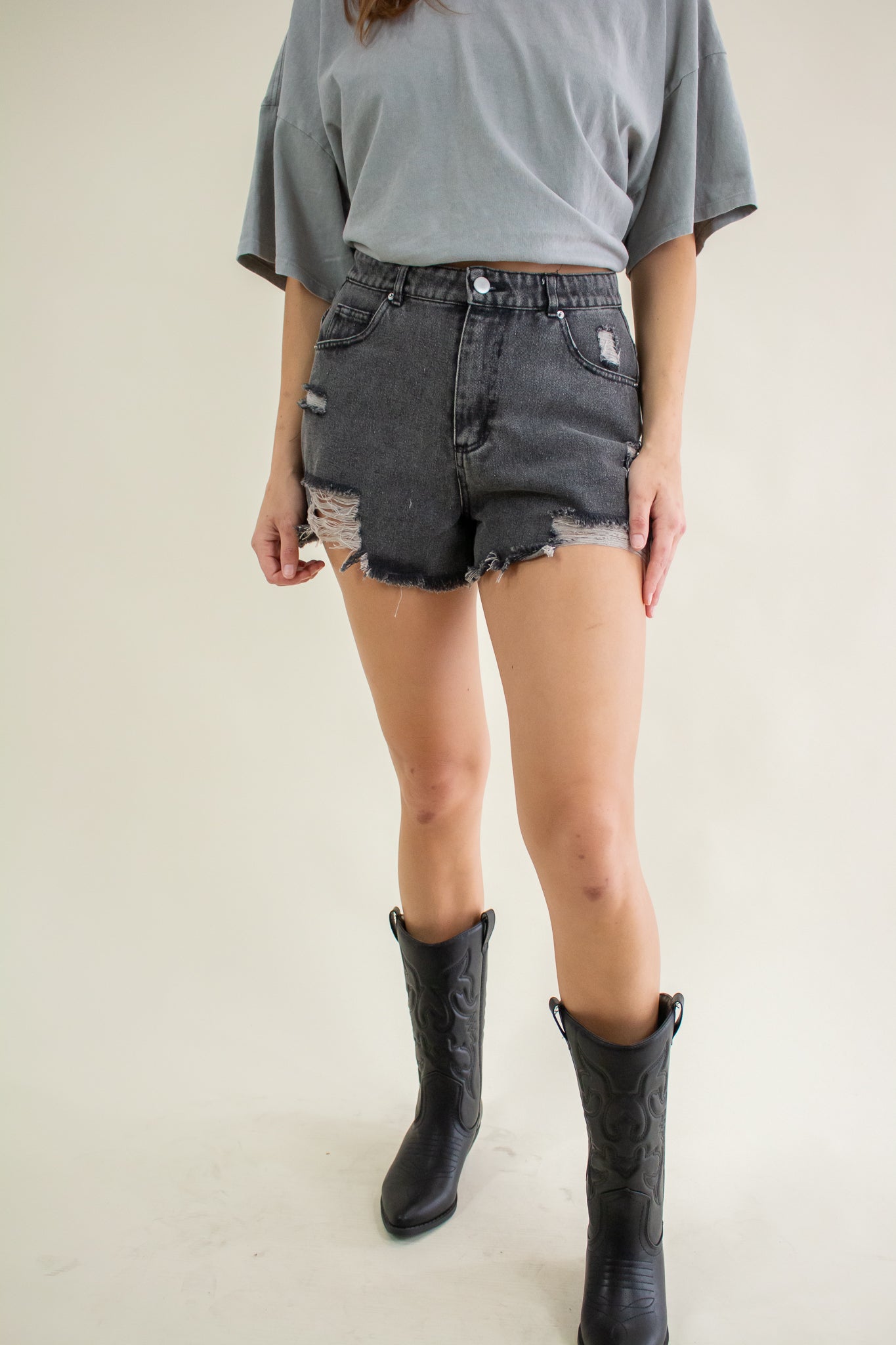 Washed out black denim shorts featuring a high rise waist, heavy distressing, zipper fly closure, belt loops, pockets and a 2" inseam.