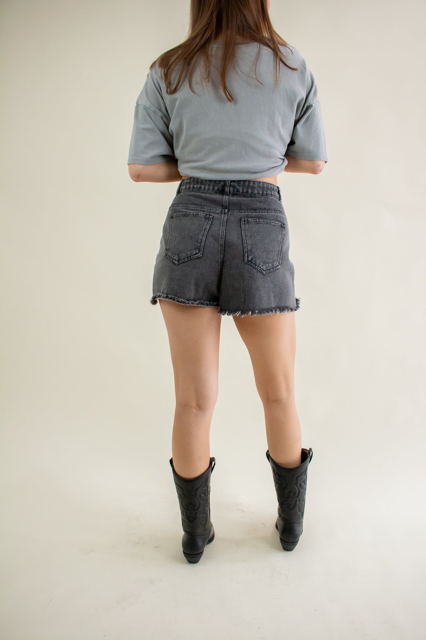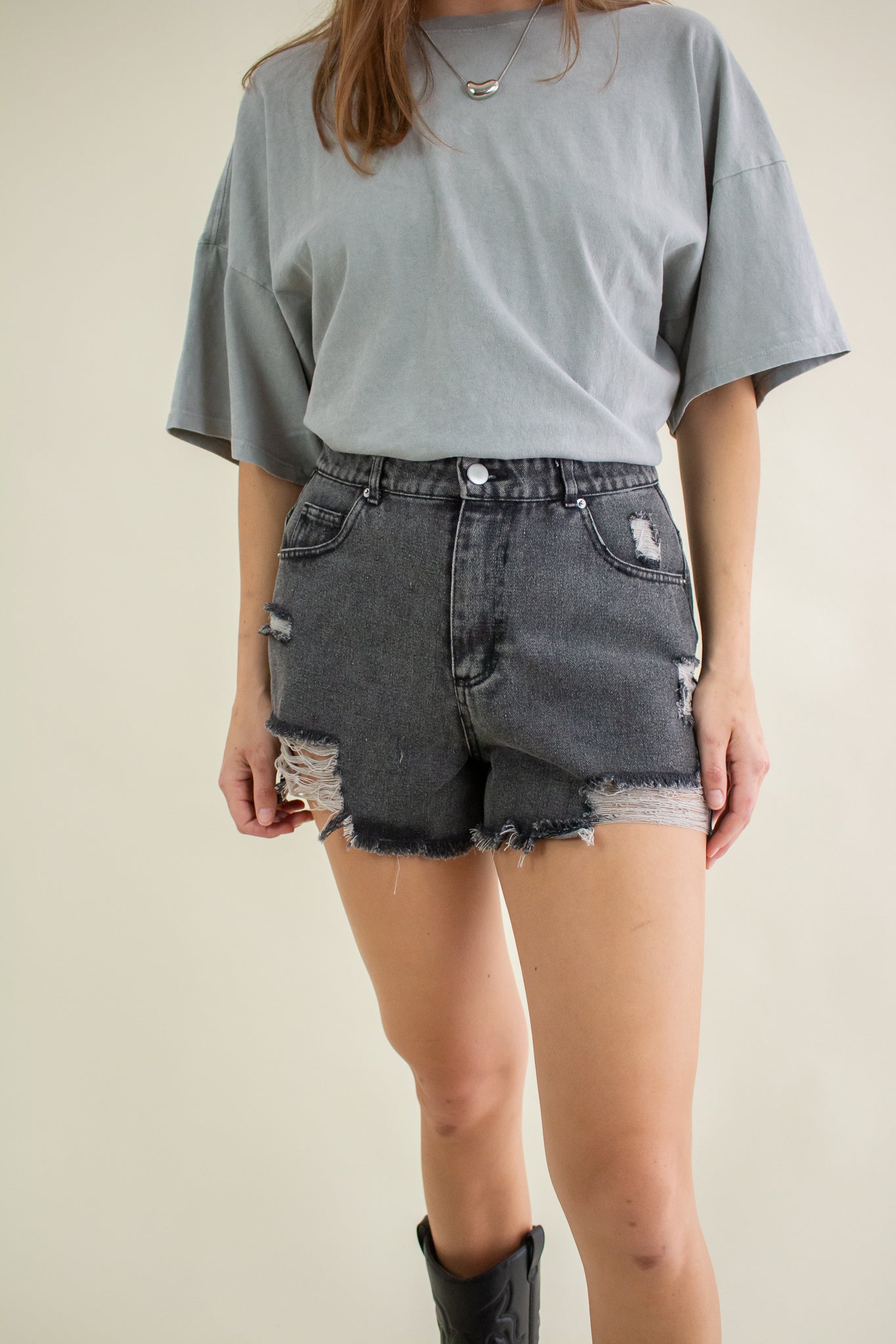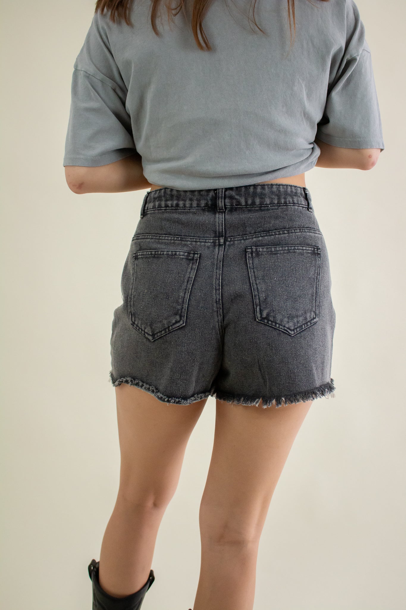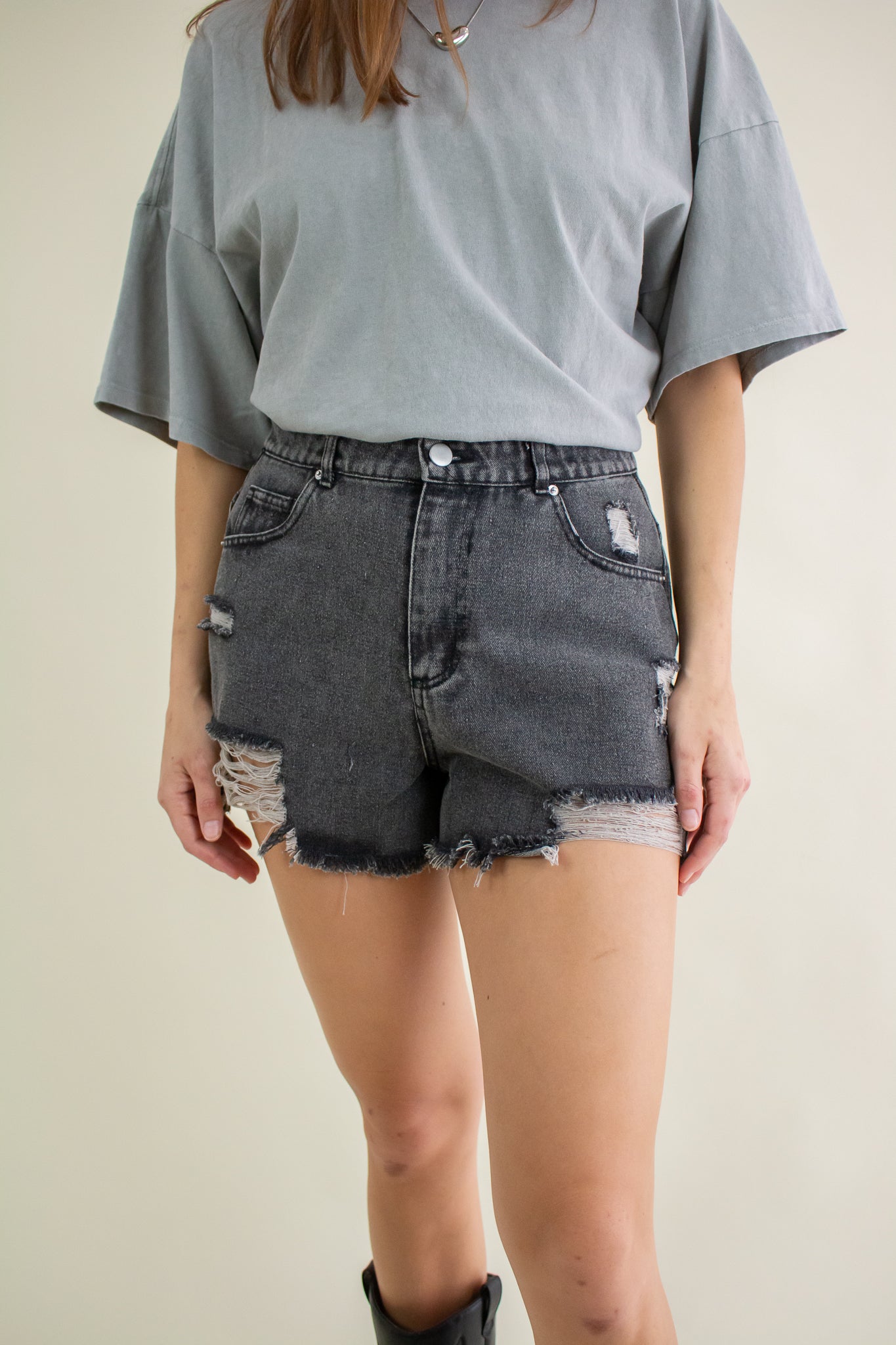 Washed out black denim shorts featuring a high rise waist, heavy distressing, zipper fly closure, belt loops, pockets and a 2" inseam.