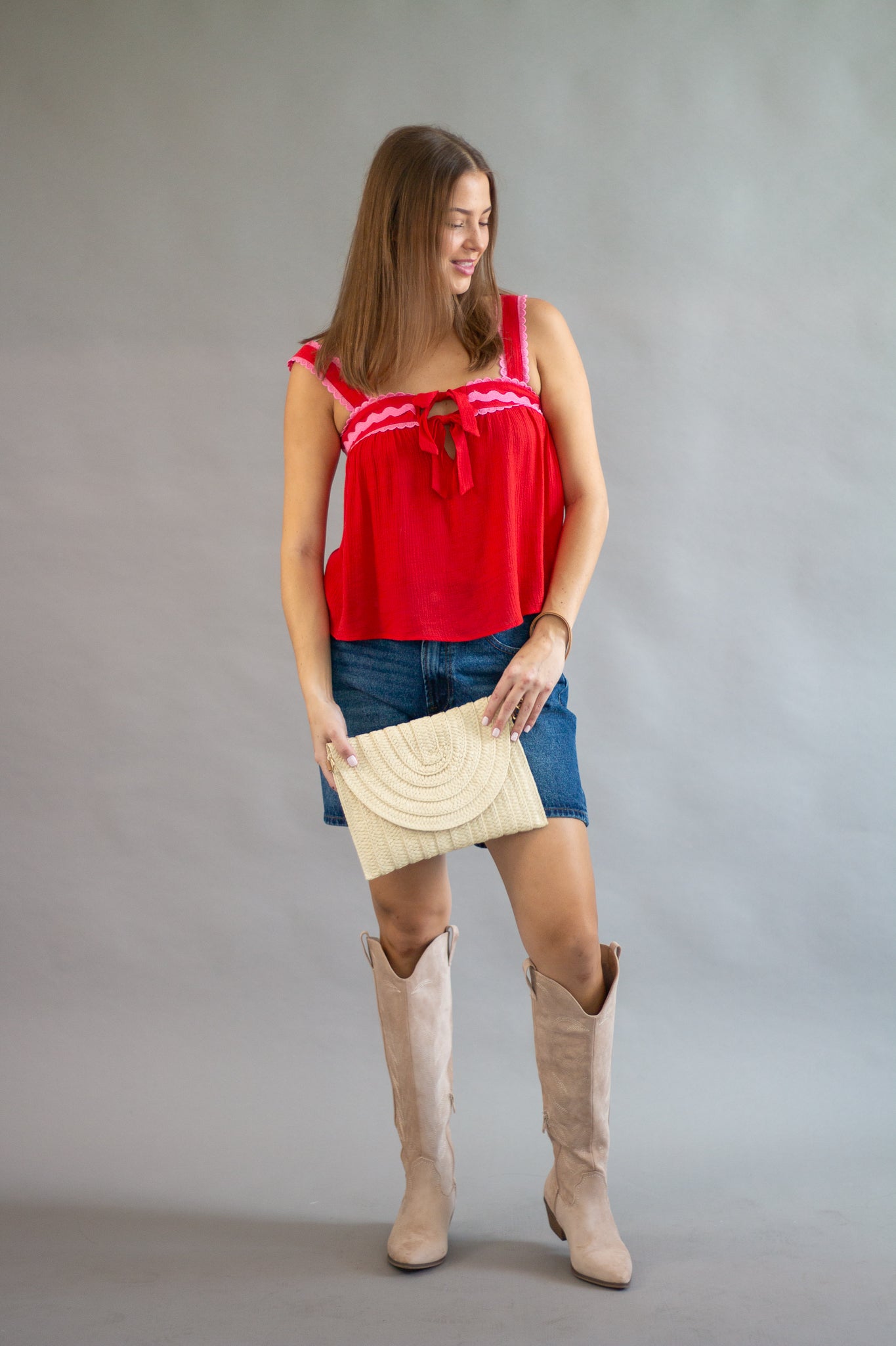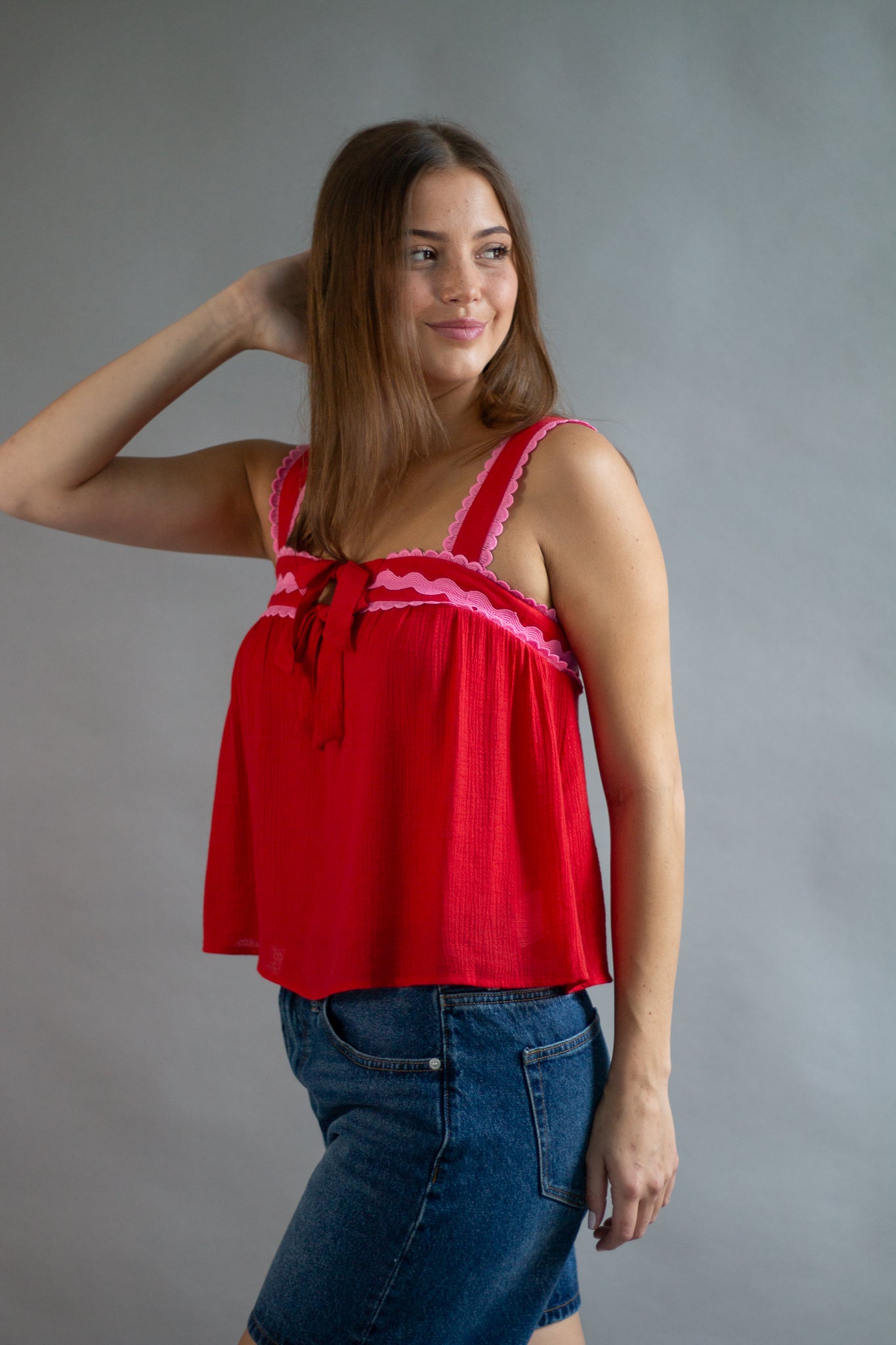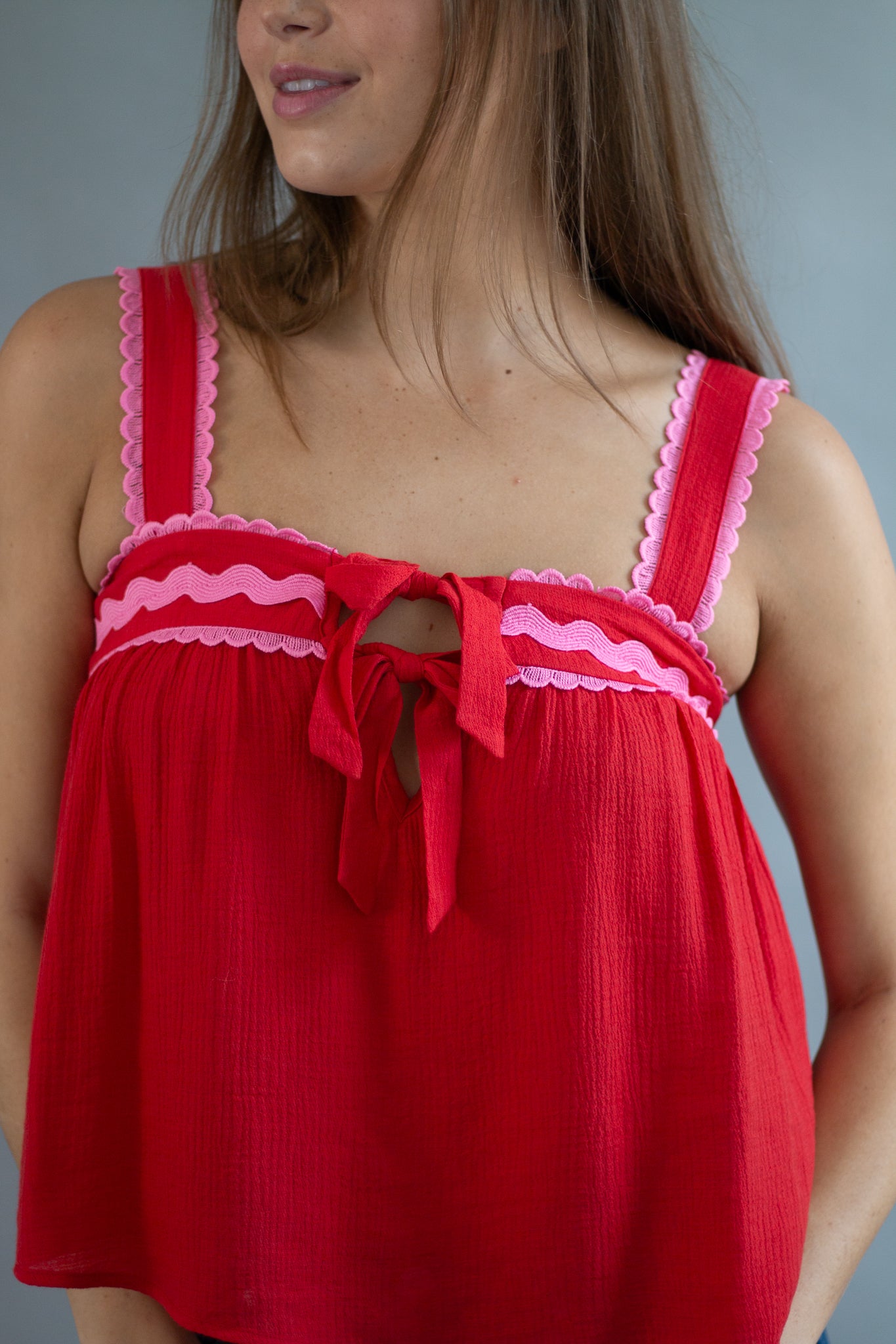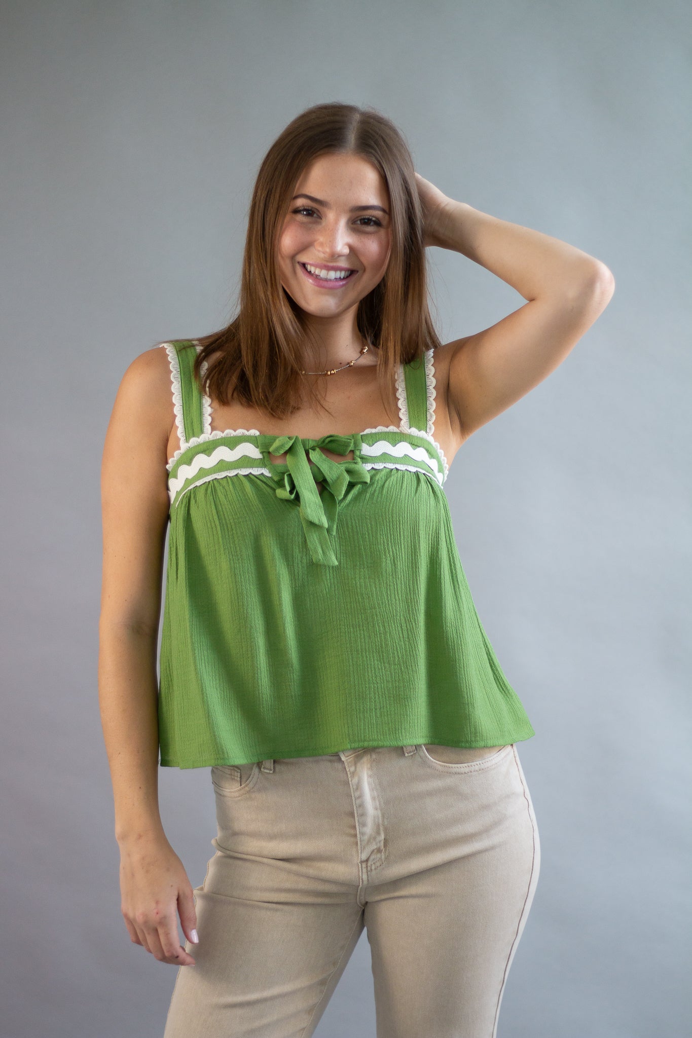 This Wavy Trim Tank Top has a cutesy front double tie bow detail. It has a crochet wavy embroidered detail on the front and straps. The elastic ruching in the back helps for a comfy fit with a lightweight fabric.