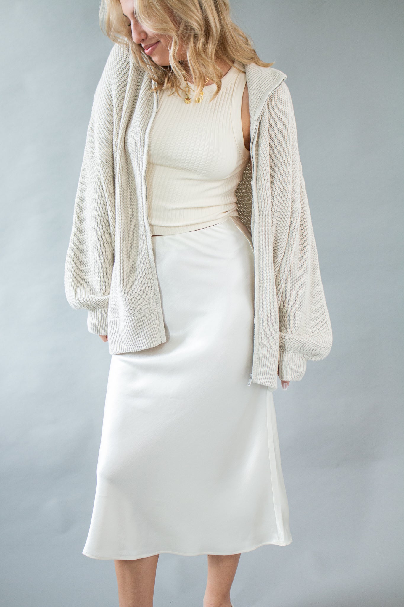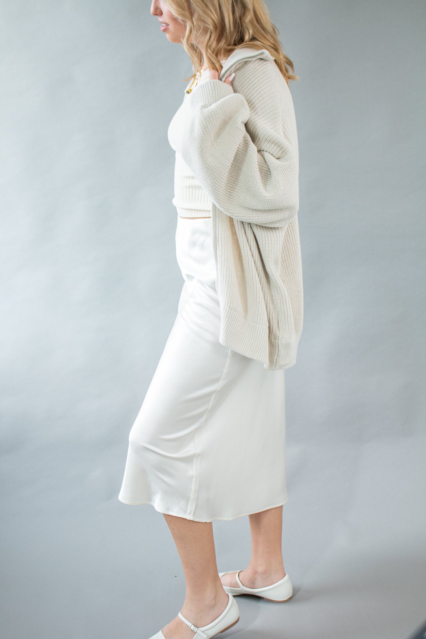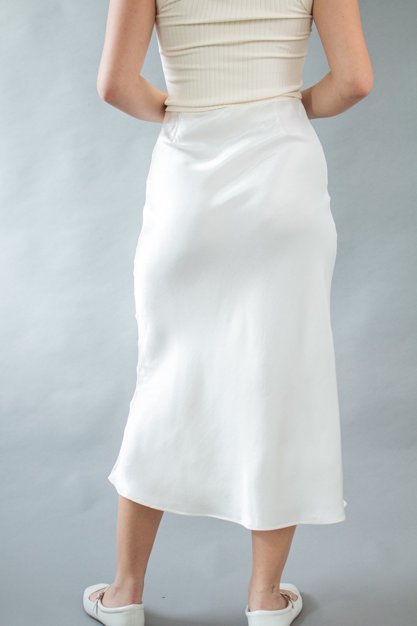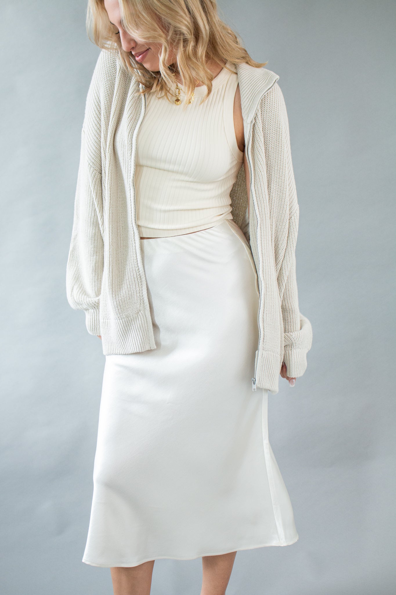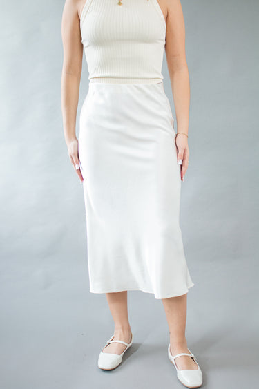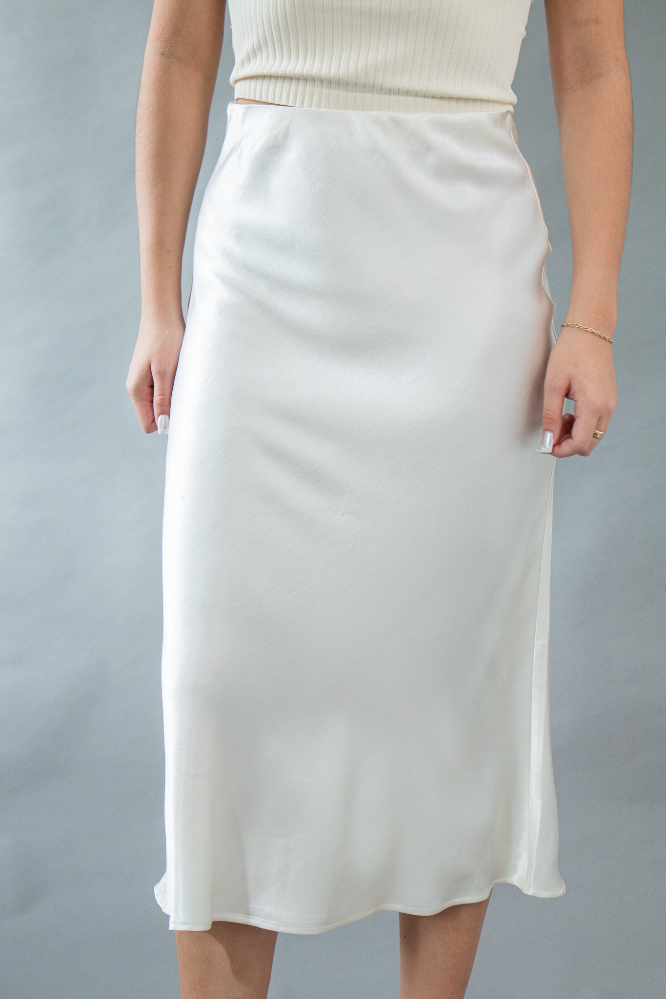 Our dreamy Piper Skirt features a high rise elastic waist, high shine shimmer satin texture, bias cut stretch, midi length hem and buttery cream color. Pair with a chunky oversized sweater for a cozy chic look or edge it up with a western boot and graphic tee combo.