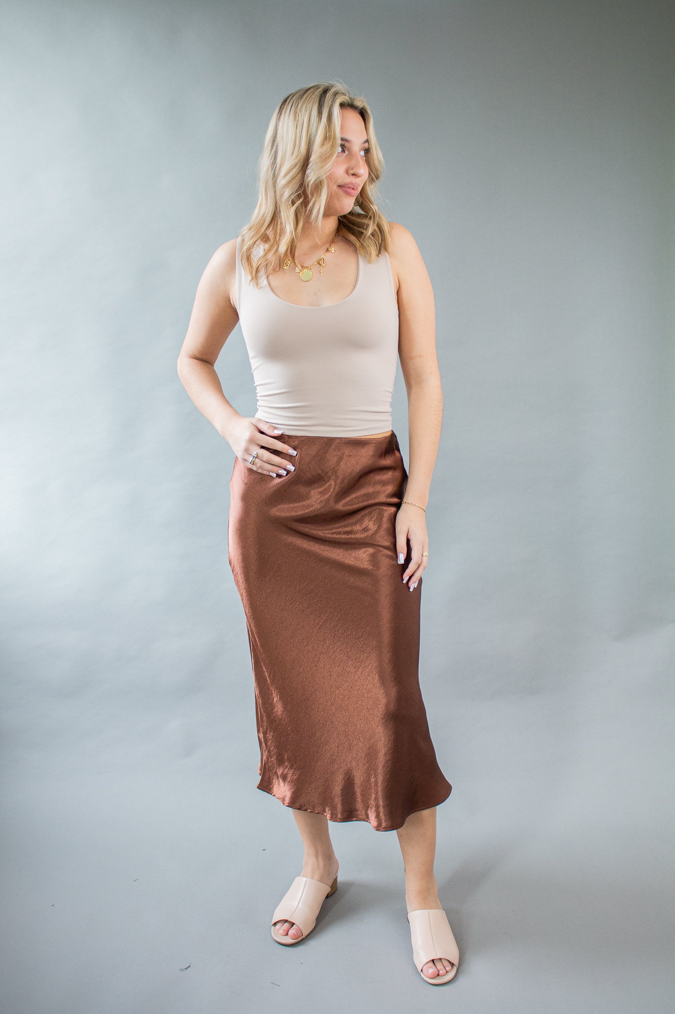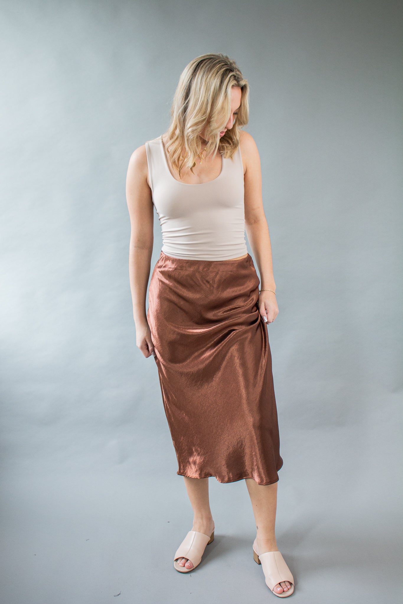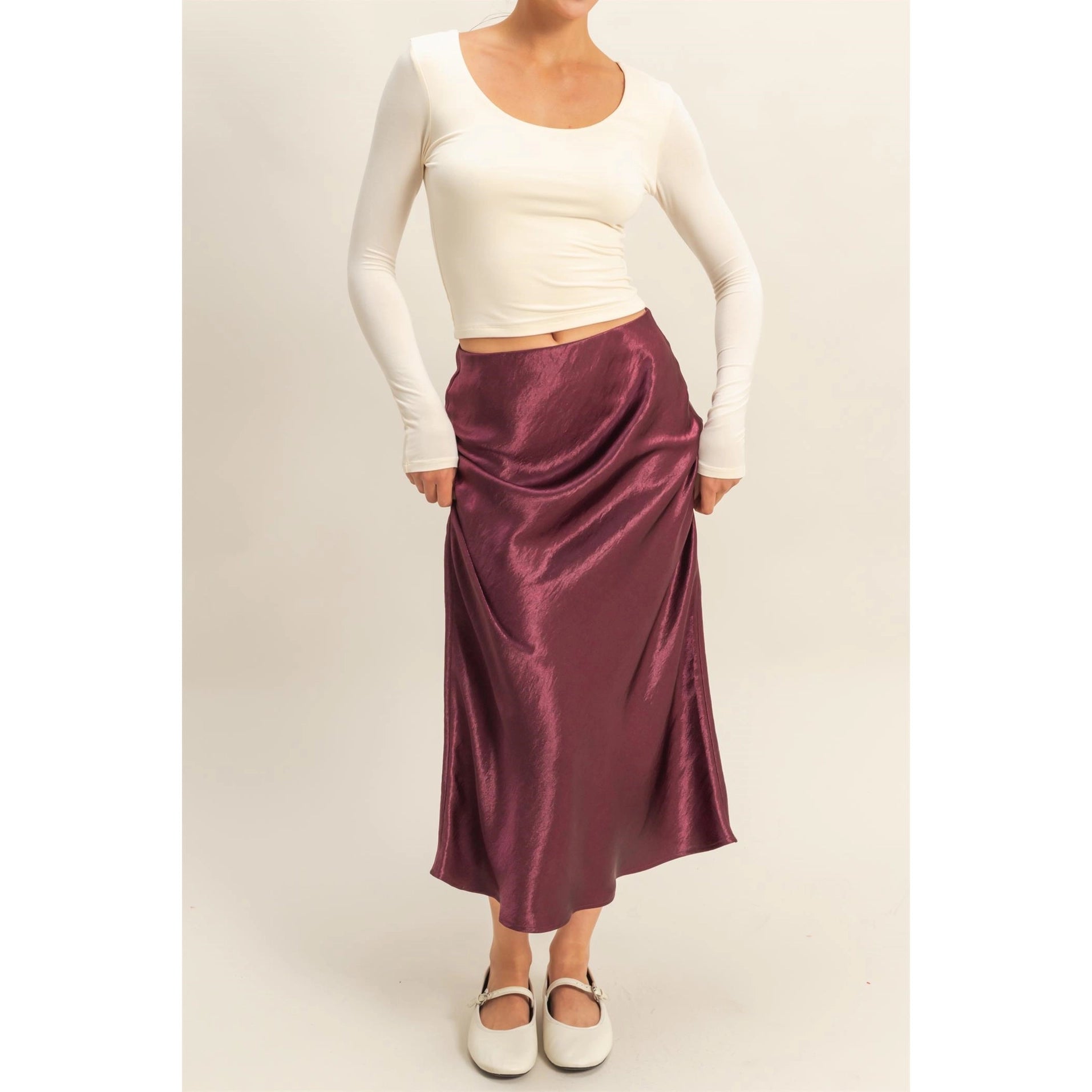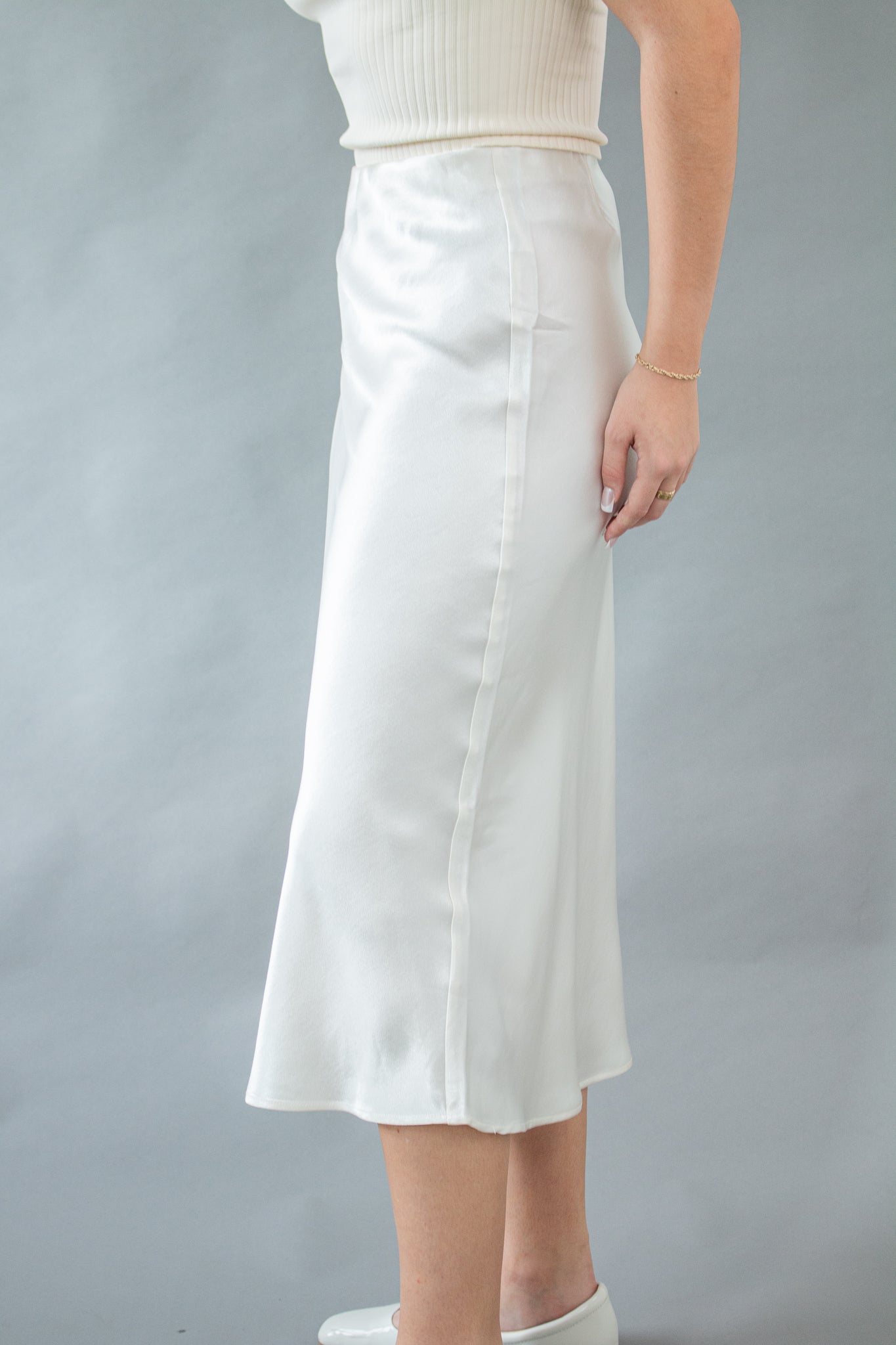 Our dreamy Piper Skirt features a high rise elastic waist, high shine shimmer satin texture, bias cut stretch, midi length hem and buttery cream color. Pair with a chunky oversized sweater for a cozy chic look or edge it up with a western boot and graphic tee combo.
