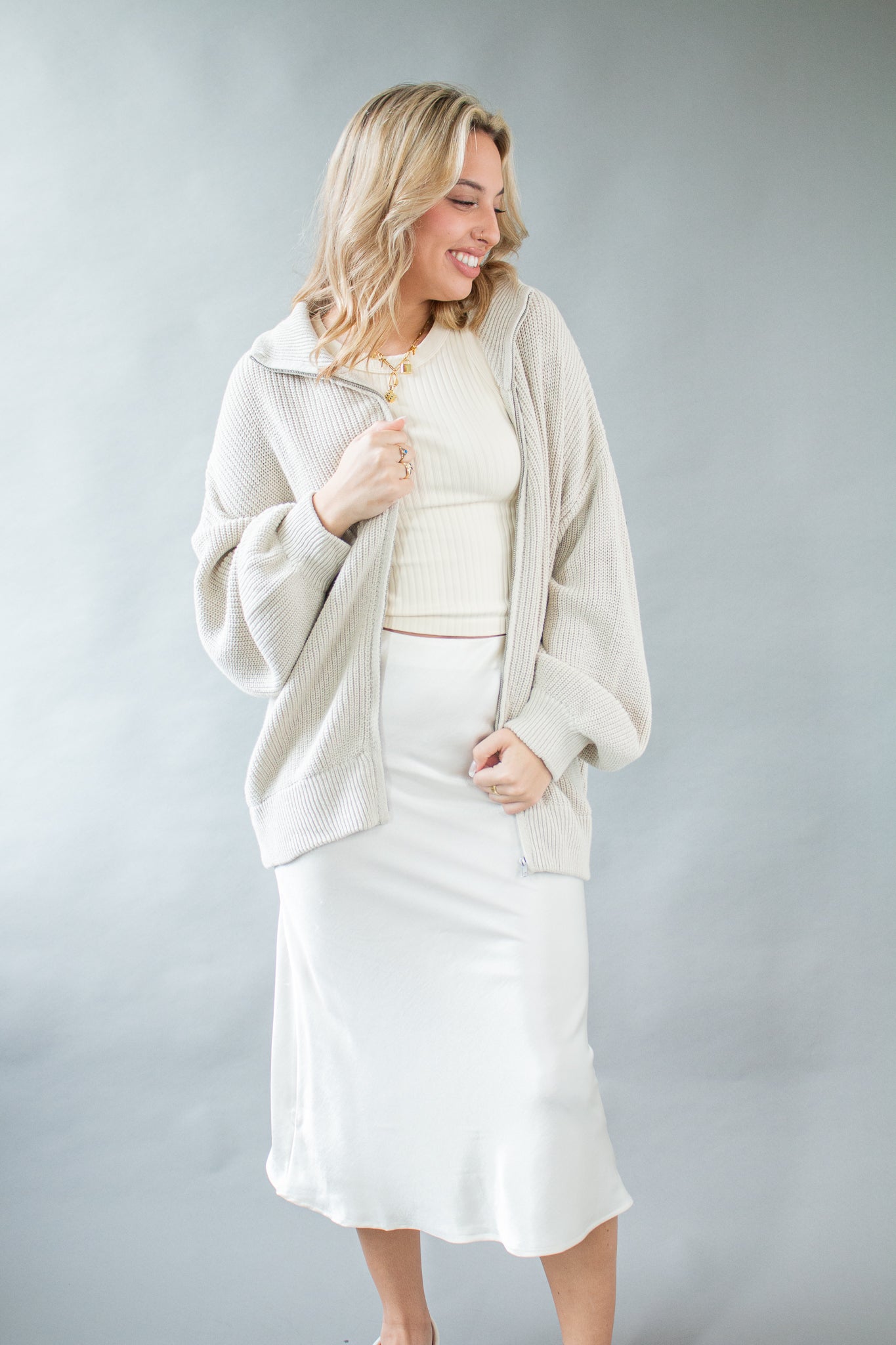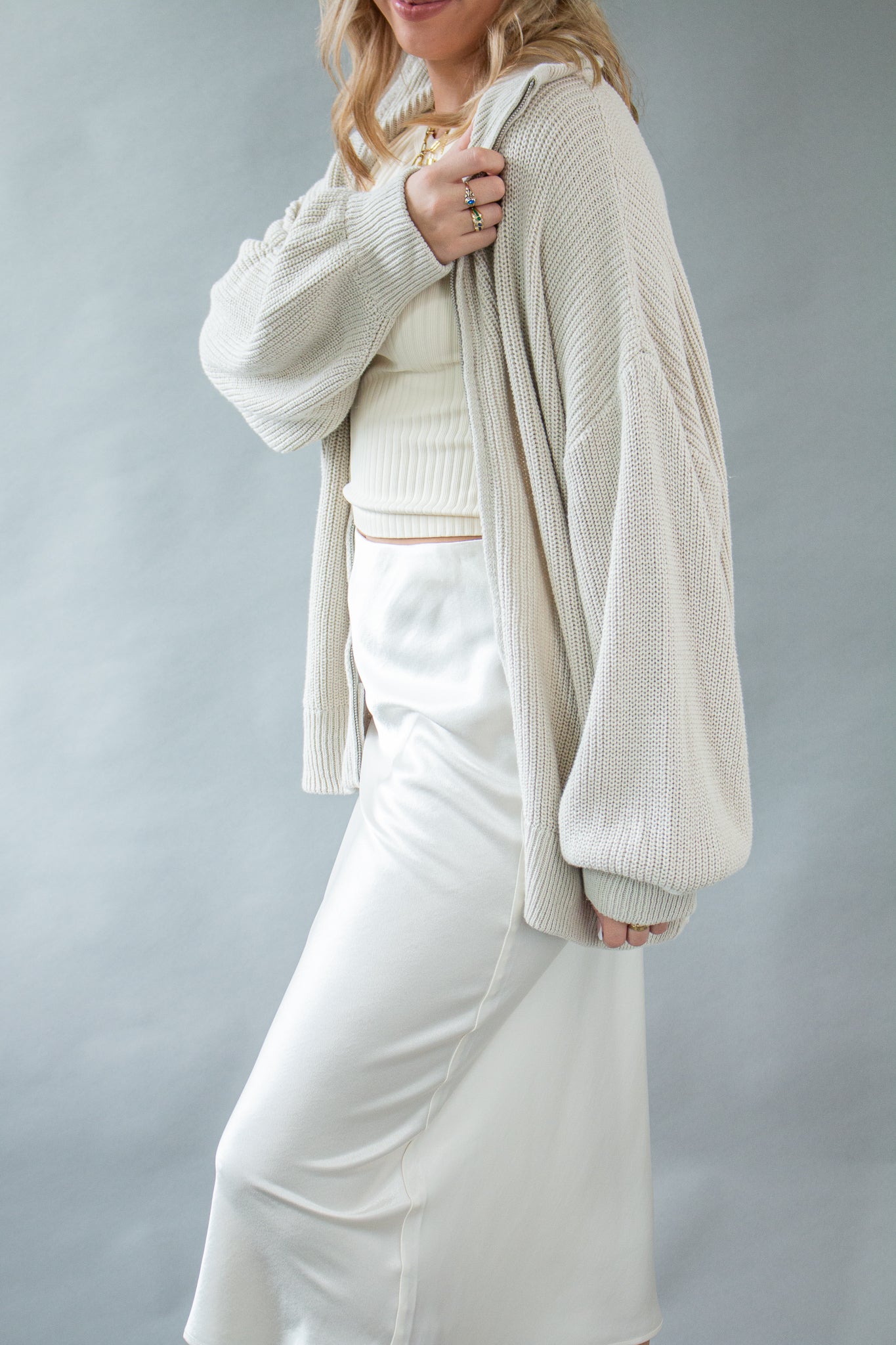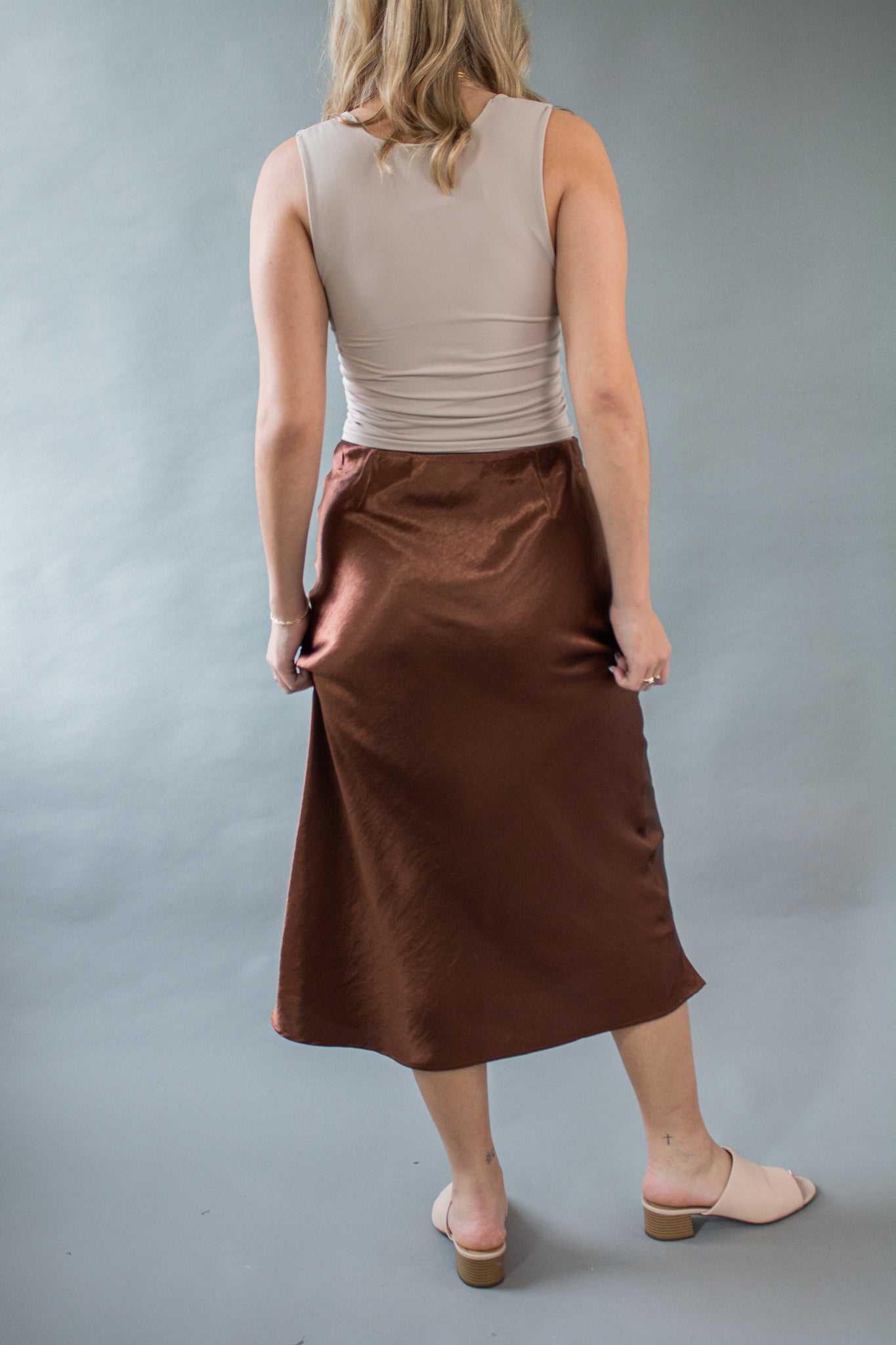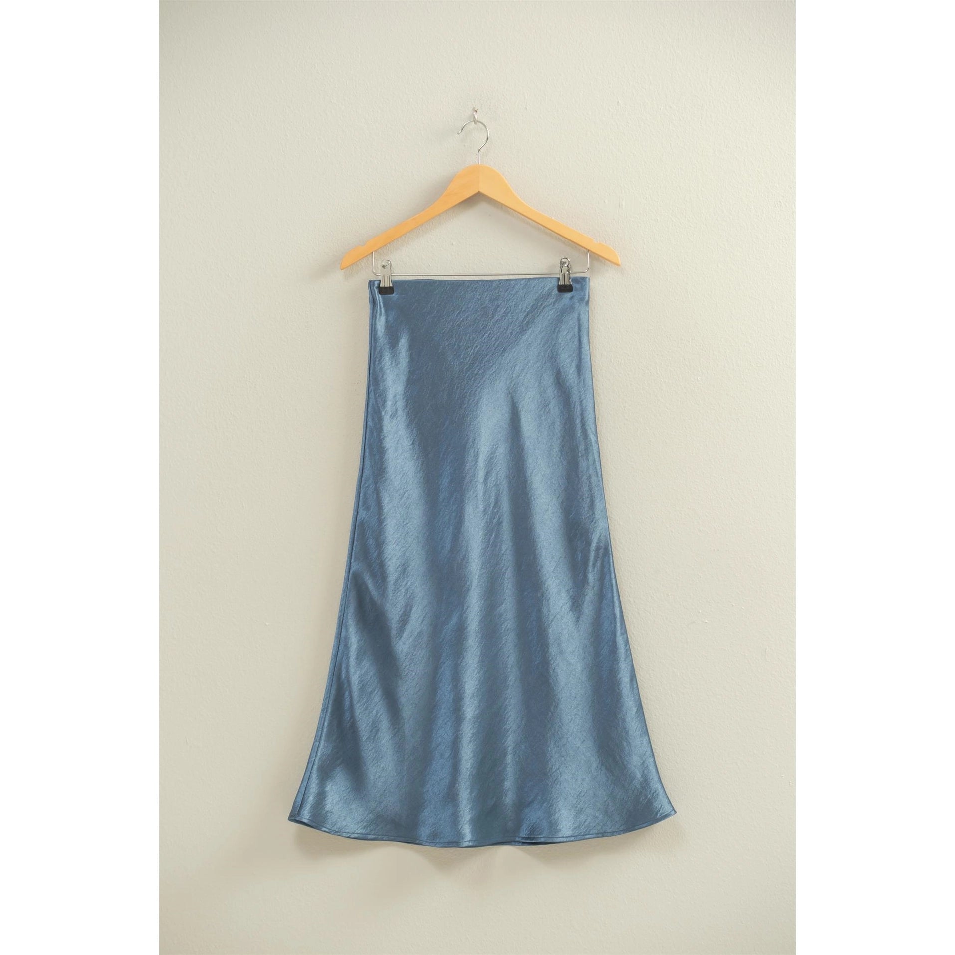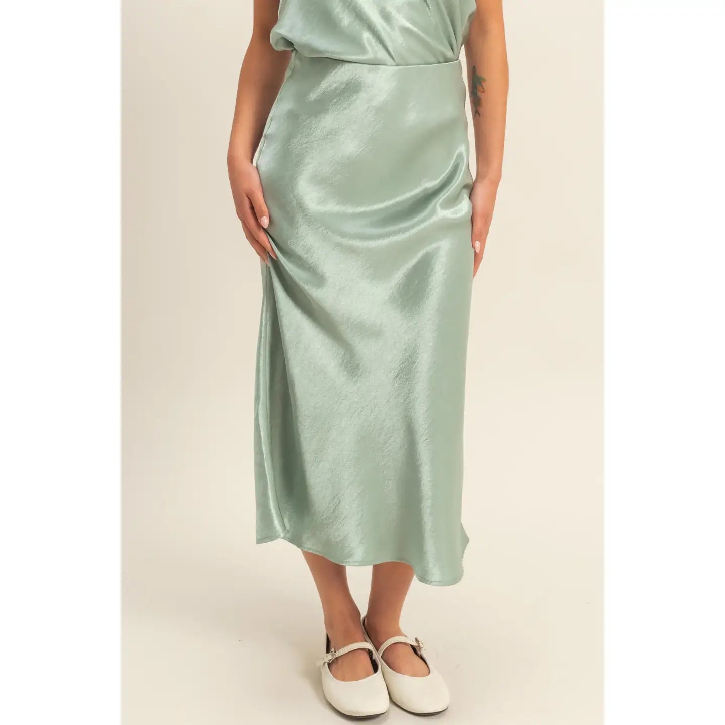 Our dreamy Piper Skirt features a high rise elastic waist, high shine shimmer satin texture, bias cut stretch, midi length hem and buttery cream color. Pair with a chunky oversized sweater for a cozy chic look or edge it up with a western boot and graphic tee combo.