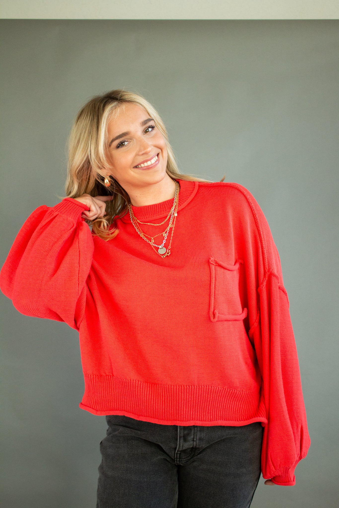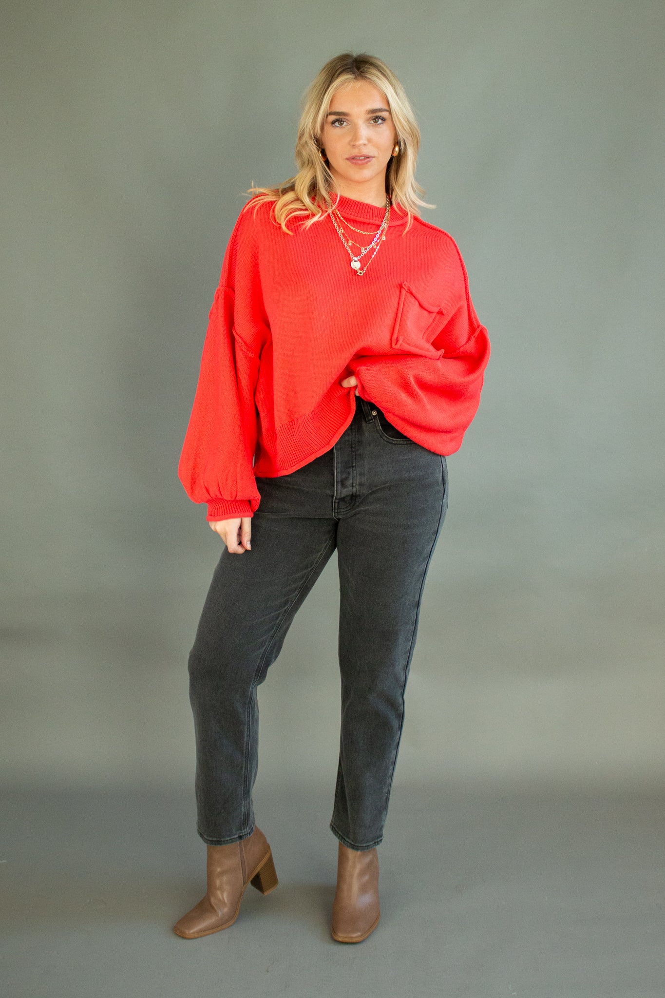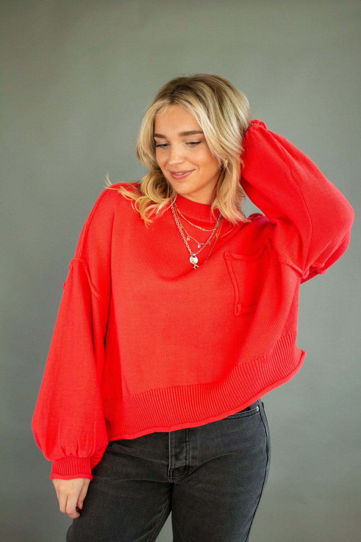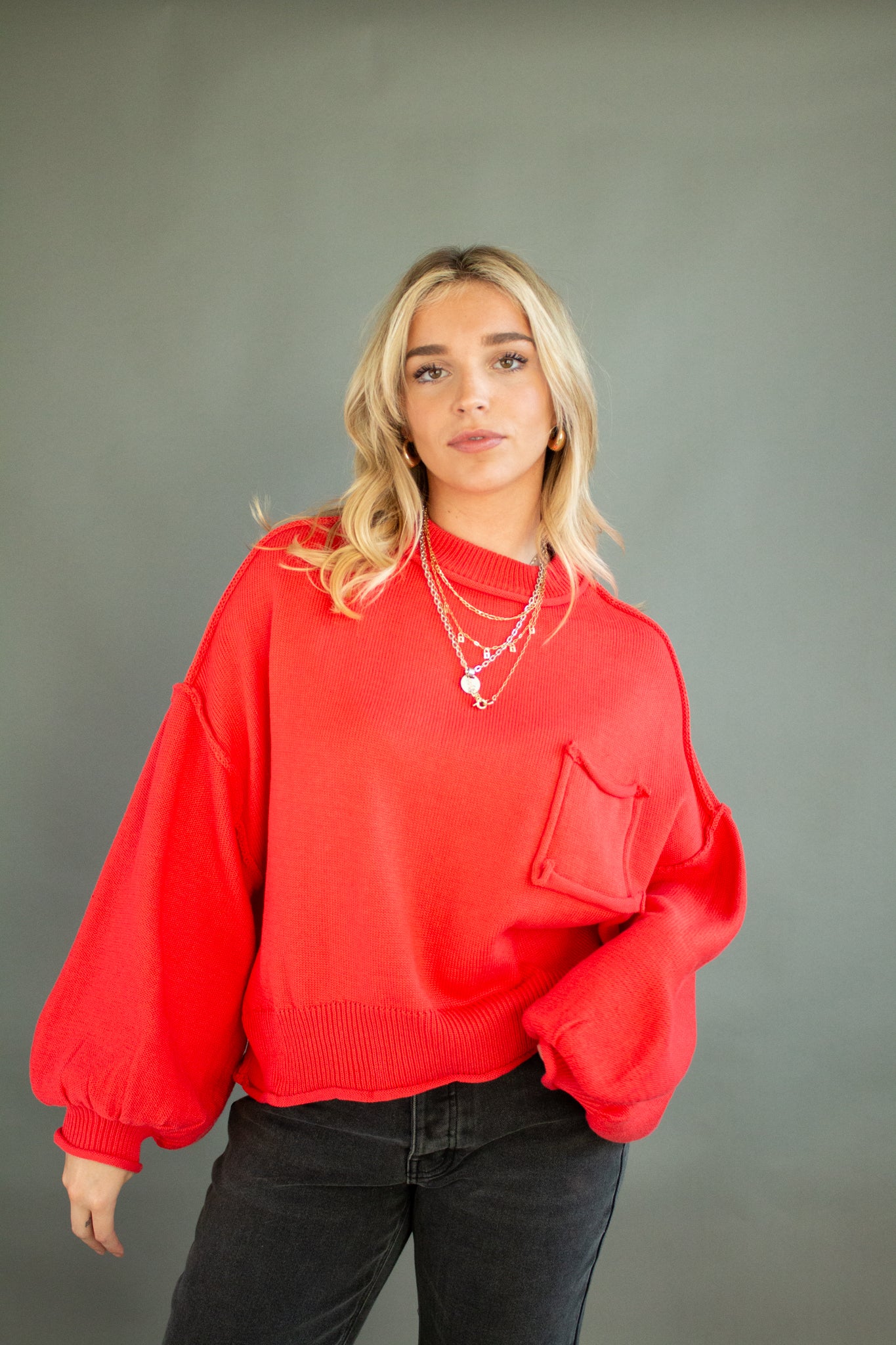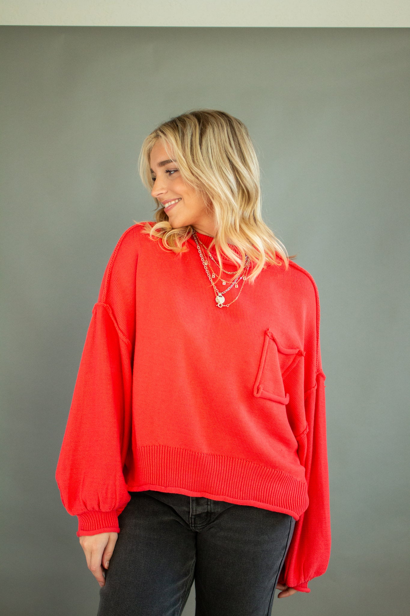 The sweater of the season, our Riva pullover features a mini mock neck, oversized drop shoulders, puffed sleeves, mid-waist hem, piped pocket details and contrast seams. Wear with denim, satin, linen and more!