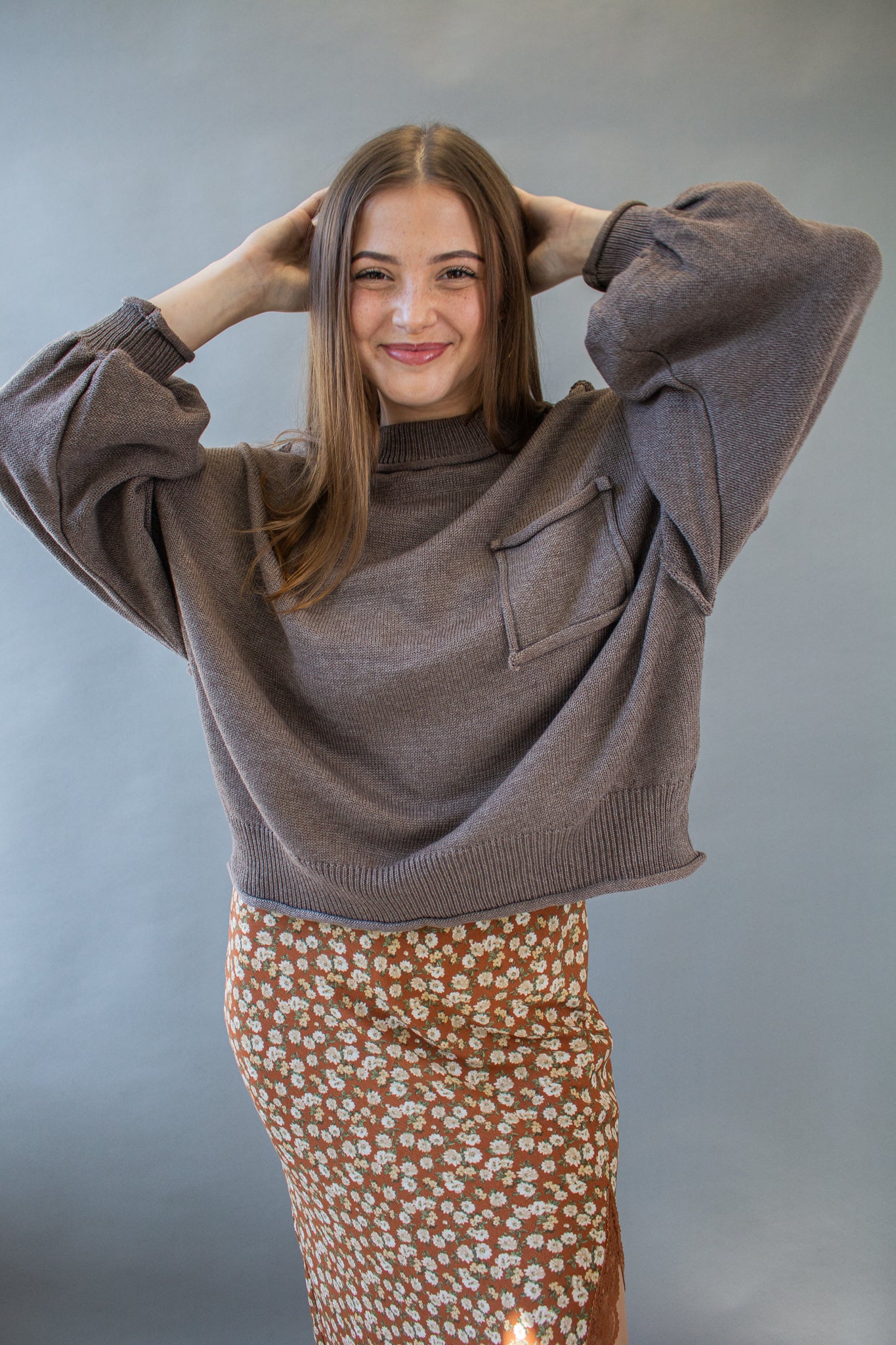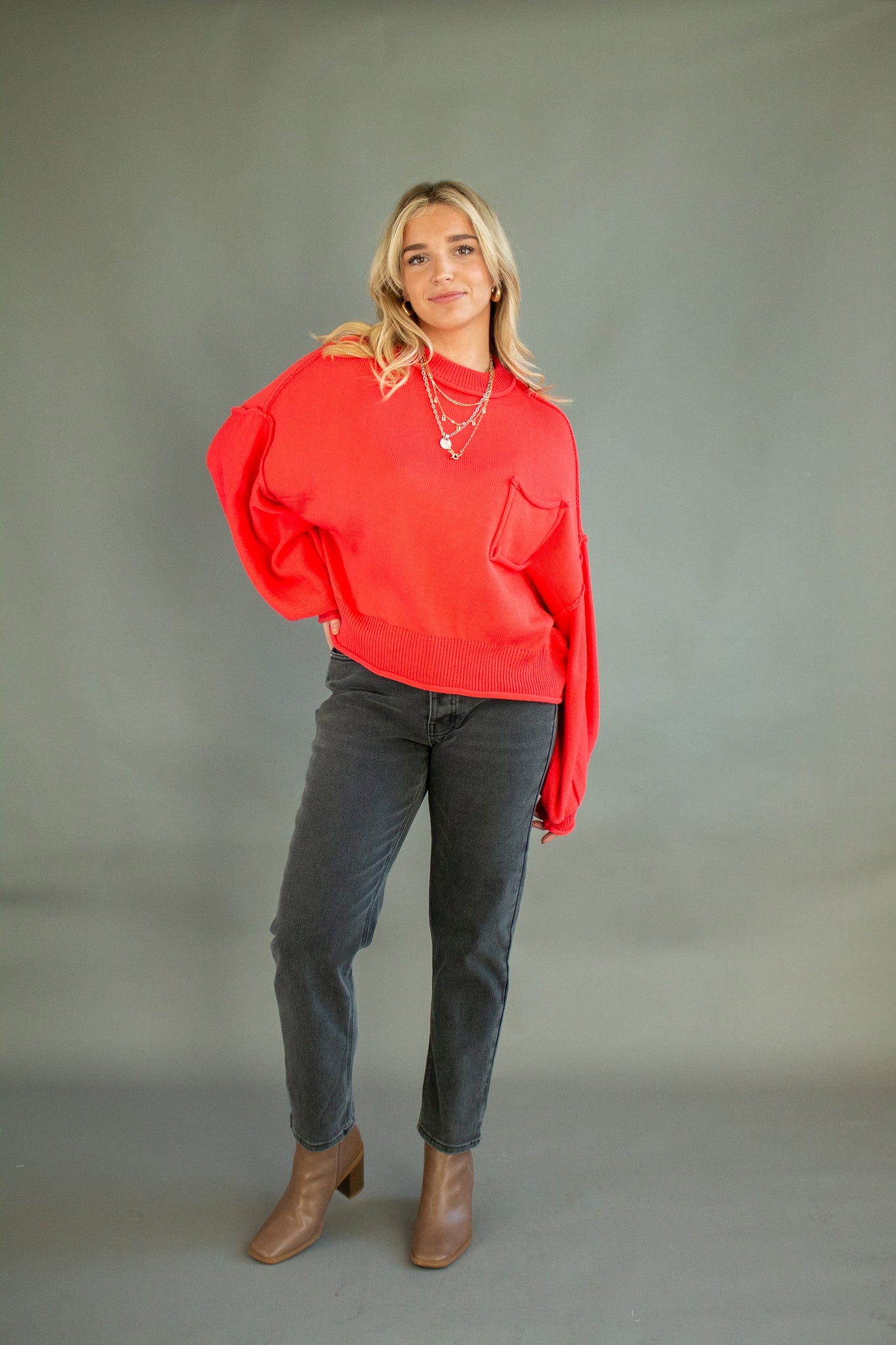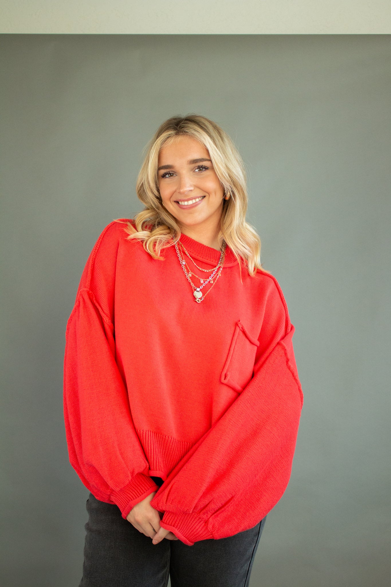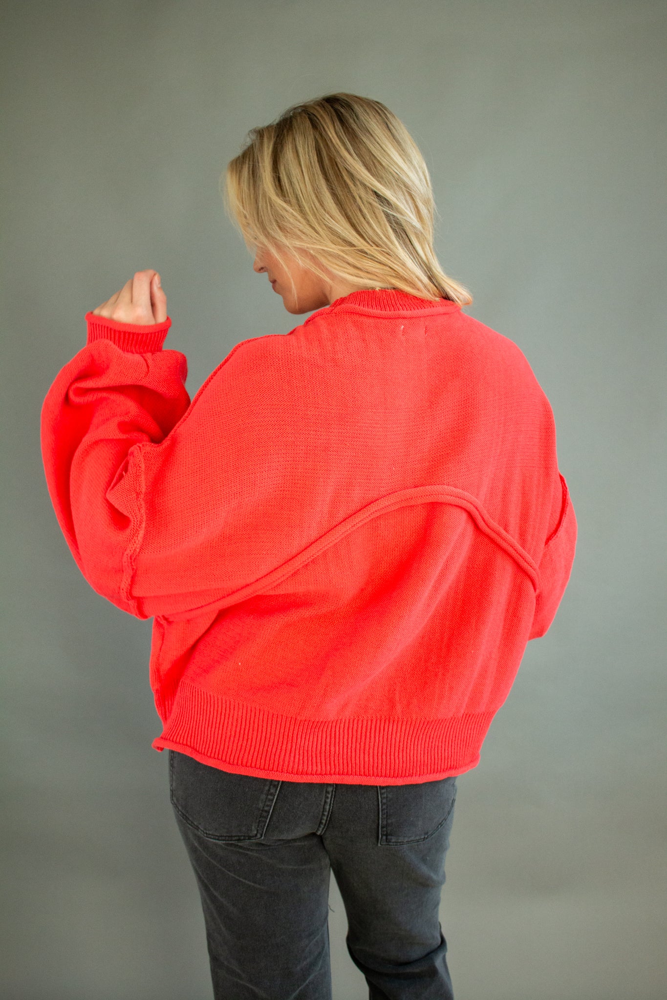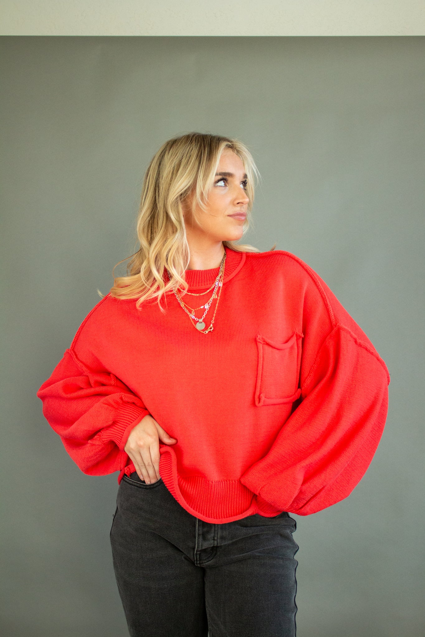 The sweater of the season, our Riva pullover features a mini mock neck, oversized drop shoulders, puffed sleeves, mid-waist hem, piped pocket details and contrast seams. Wear with denim, satin, linen and more!
