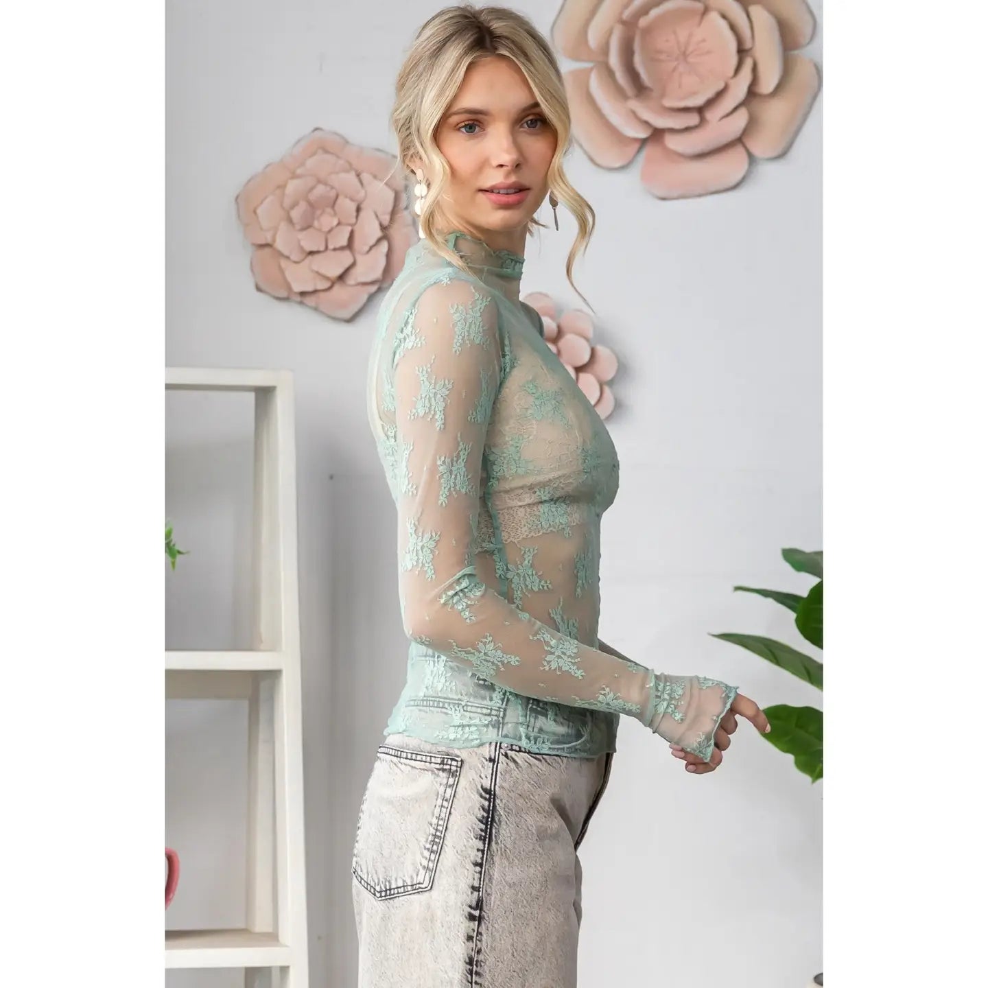 Delicate floral lace meets a modern silhouette in this sheer long sleeve mock neck top. Designed with a fitted, second-skin feel, it features intricate black floral embroidery over a sheer mesh base for the perfect balance of sultry and chic. The mock neckline and long sleeves add an elevated touch, making it easy to dress up or down.