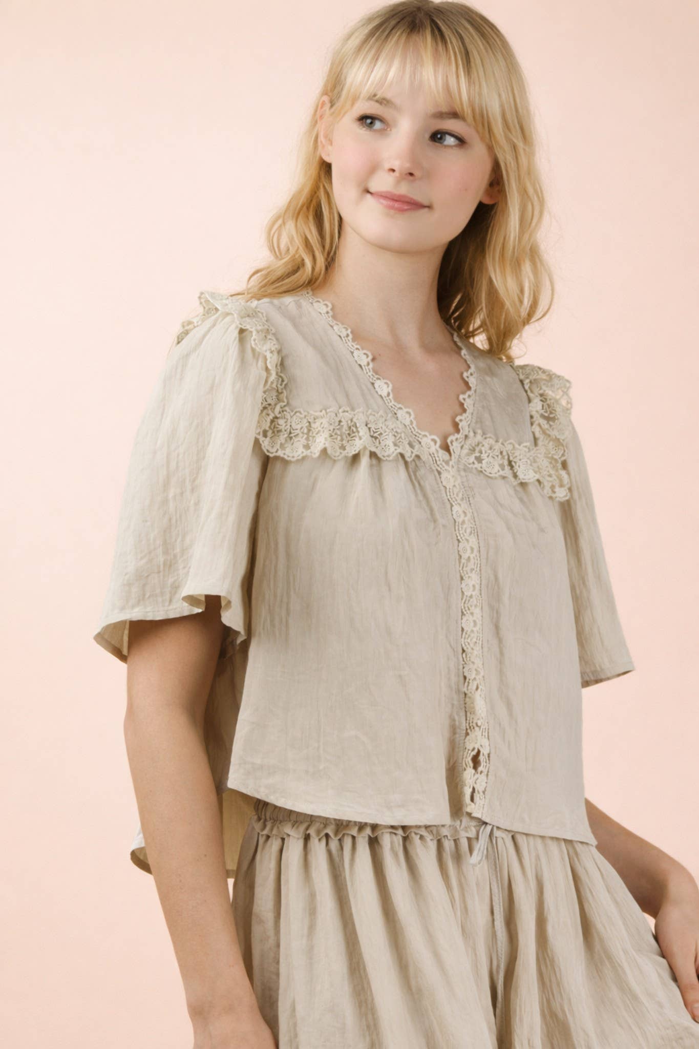 Soft, romantic, and effortlessly feminine, the Luna Lace Trim Blouse is the perfect pairing to our Luna Lace Trim Capri Pants. Crafted from a lightweight woven fabric, this airy blouse features delicate lace detailing along the neckline and shoulders for a vintage-inspired touch. The relaxed silhouette and flutter sleeves create an easy, flattering drape that feels elevated yet wearable. Designed to be styled together or worn on its own, this top brings timeless charm to any outfit.