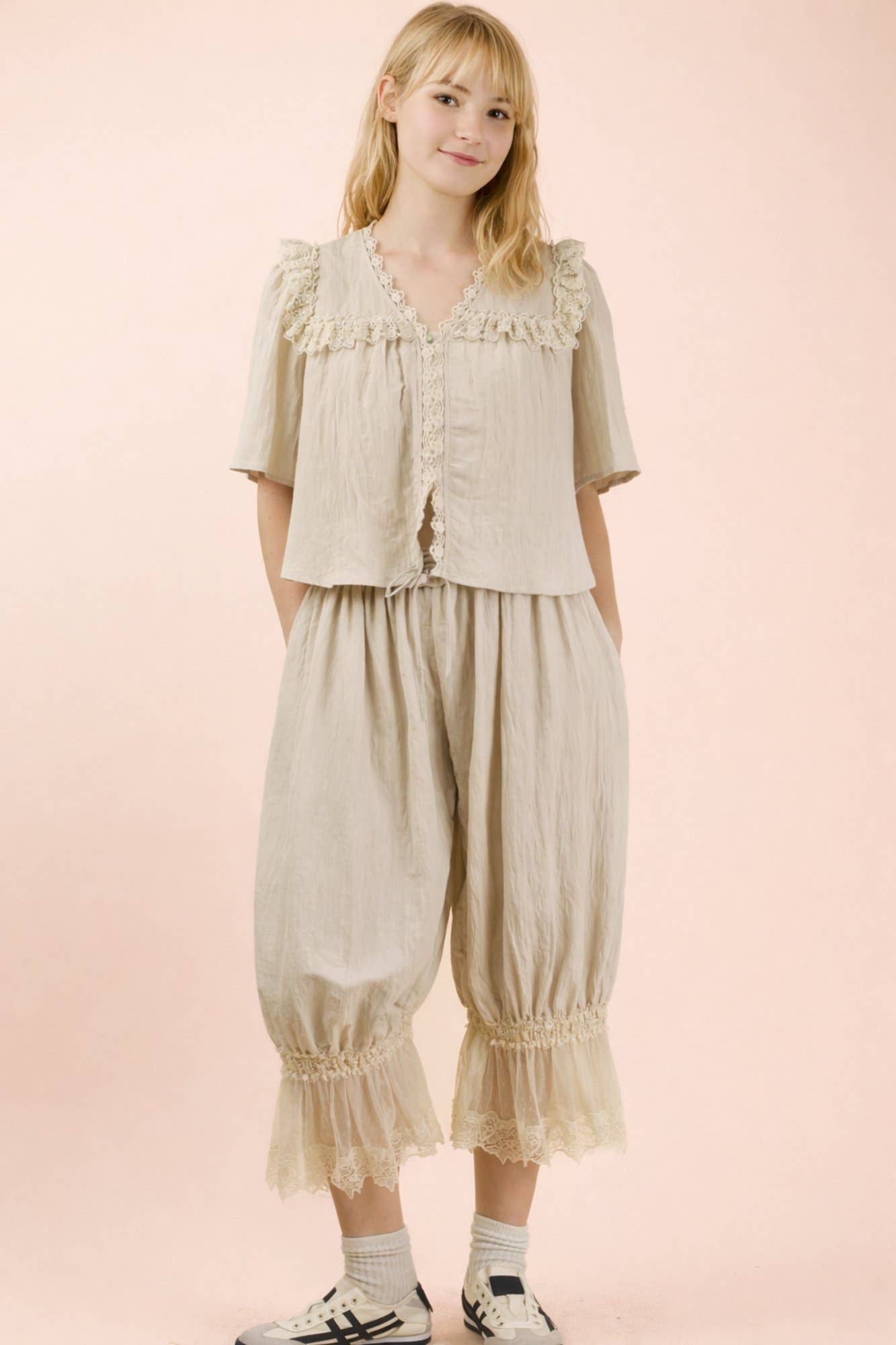 Whether styled as a set or worn solo with denim or linen trousers, this lace-trim blouse delivers an effortlessly romantic look you’ll reach for again and again.