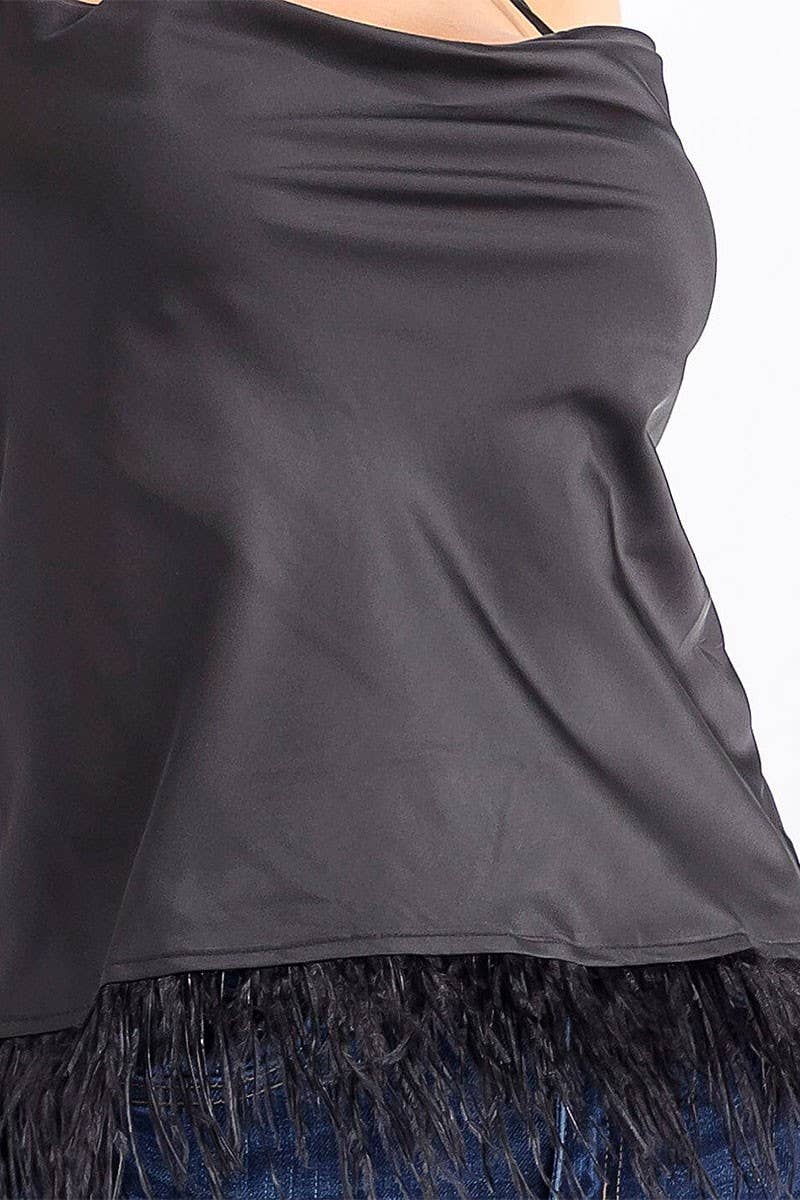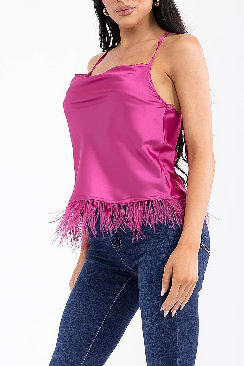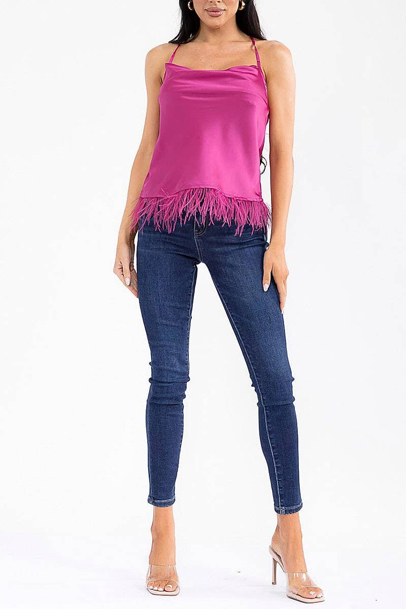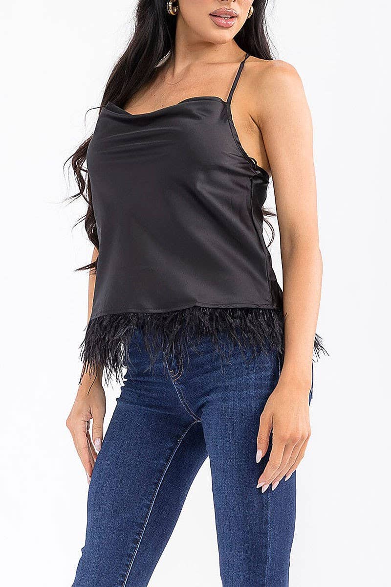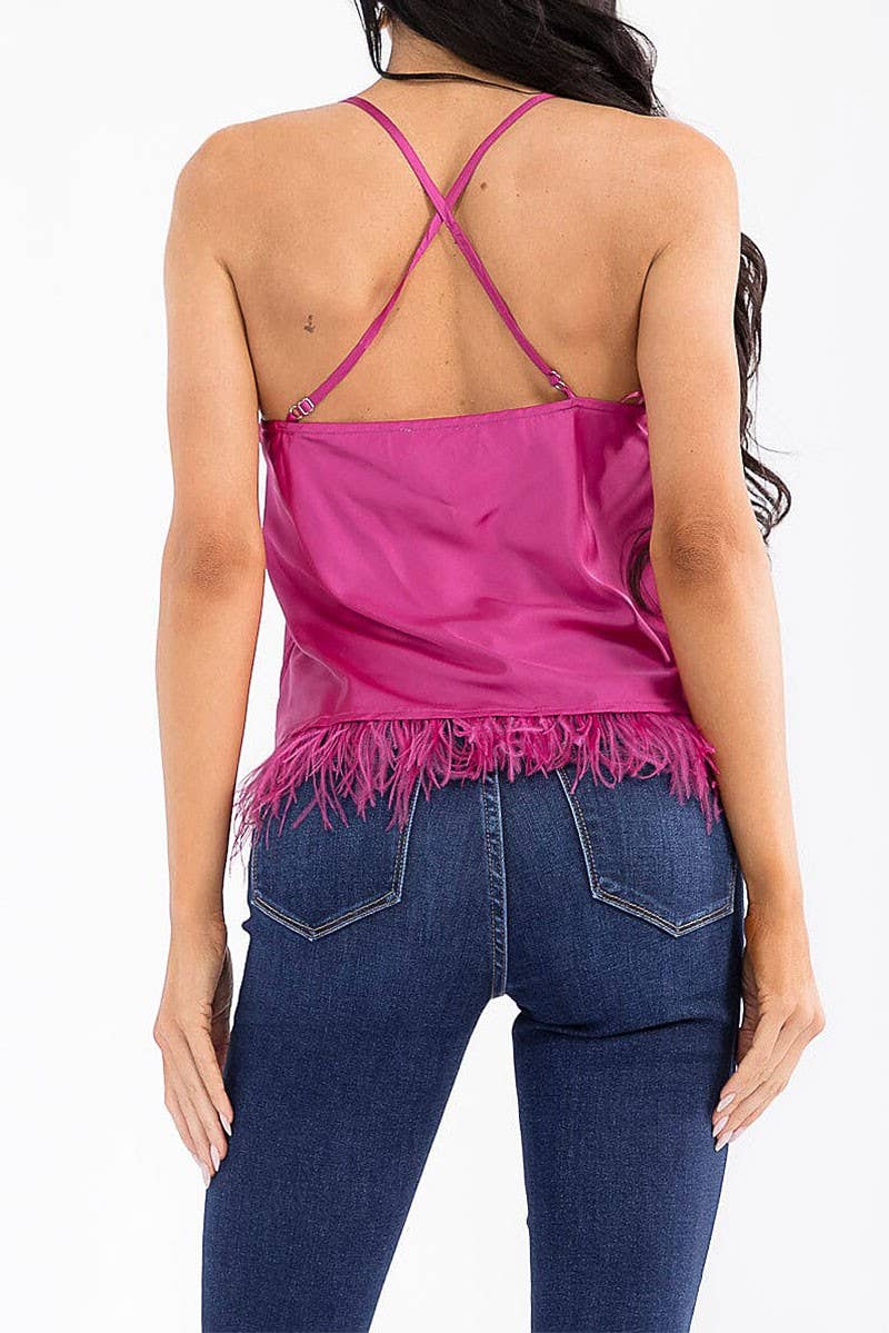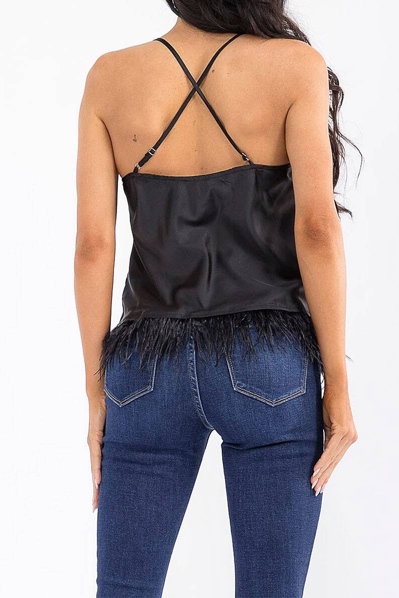 Soft glam meets holiday sparkle in the Champagne Chalet Feather Top. Designed with an elegant sleeveless silhouette, this statement piece features delicate trim detailing and a stunning open back with criss-cross adjustable straps for the perfect custom fit. The feathered trim adds a luxe, playful finish that feels festive, feminine, and made for nights that call for something extra.