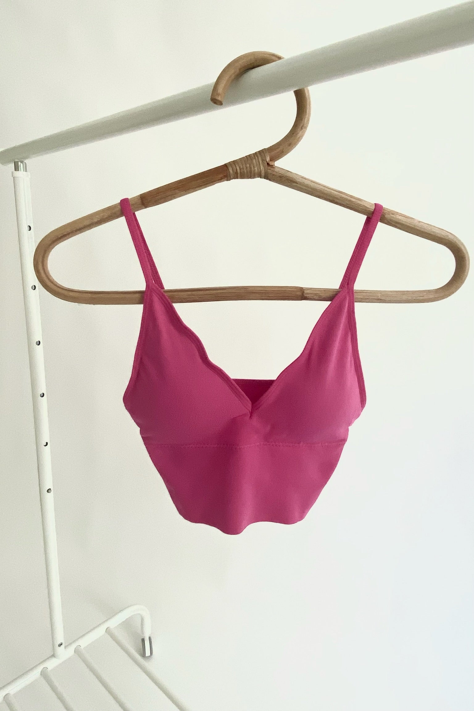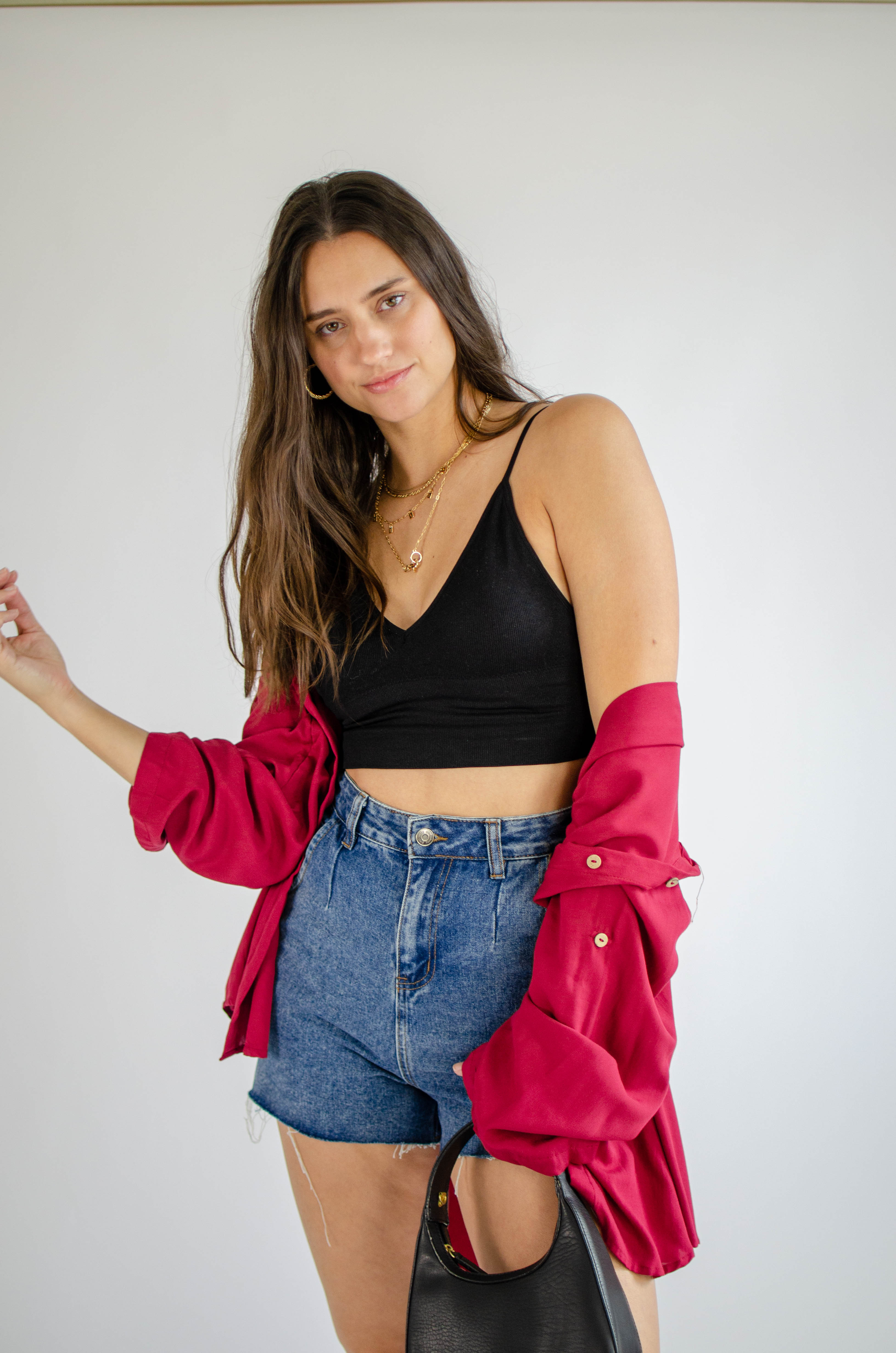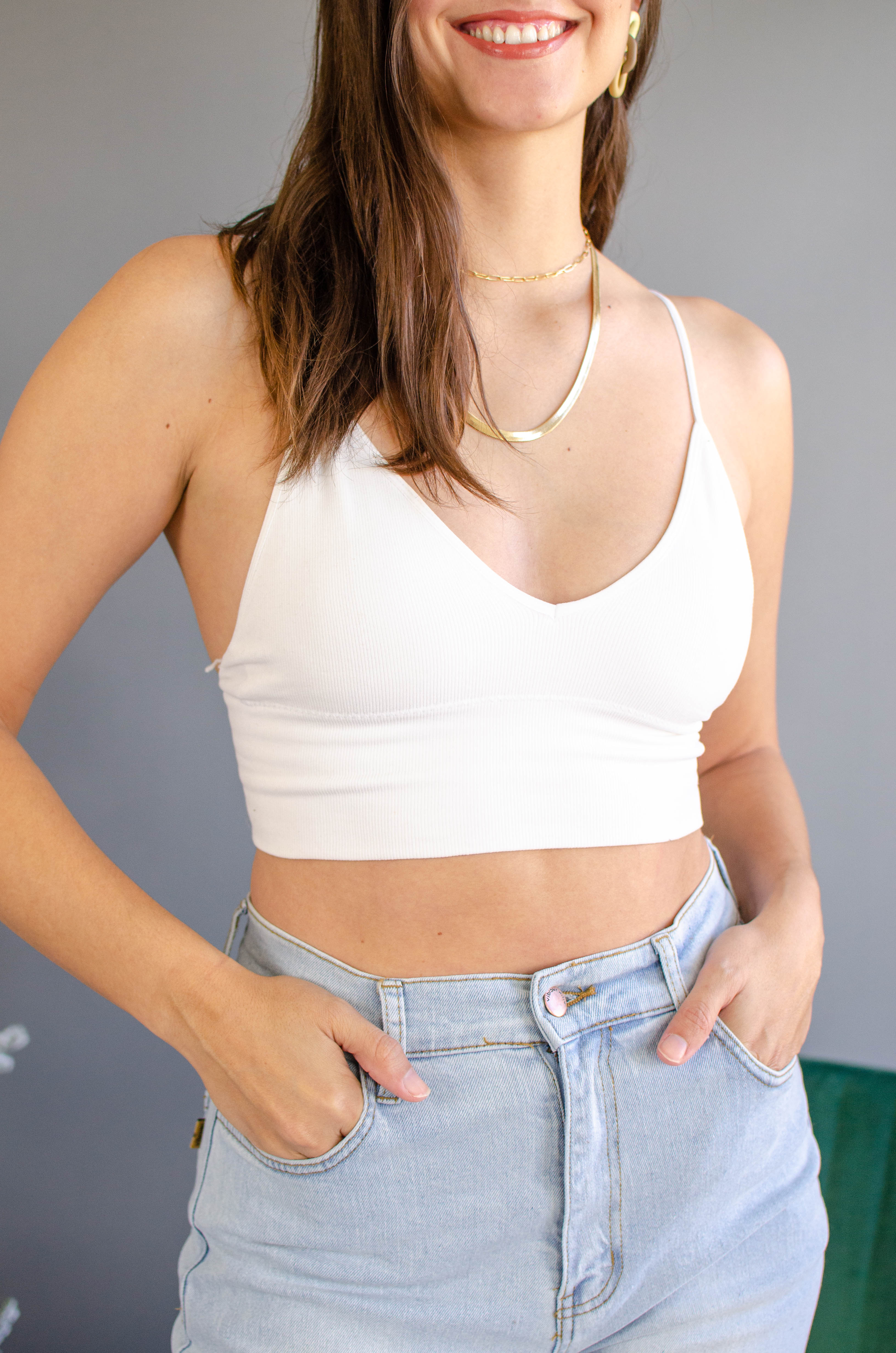 Shellsea favorite for 5+ years! Our Amelia Bralette is a staple wardrobe piece. Layer under sheer, open knit, oversized cardigans or wear as a bra! The adjustable straps and removable padding make it an effortless everyday essential. Can fit small or large breast sizes very comfortably and you will want one in every color. Seamless ribbed bralette deep V-neck silhouette. With thin adjustable shoulder straps, pullover style, and removable padding.