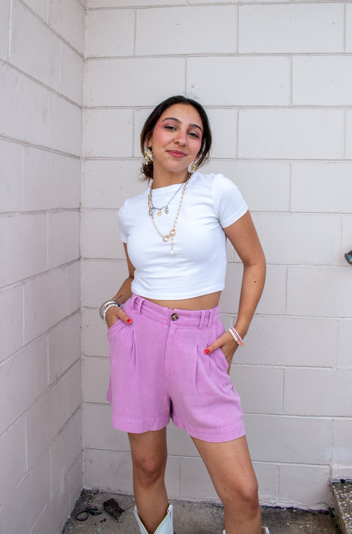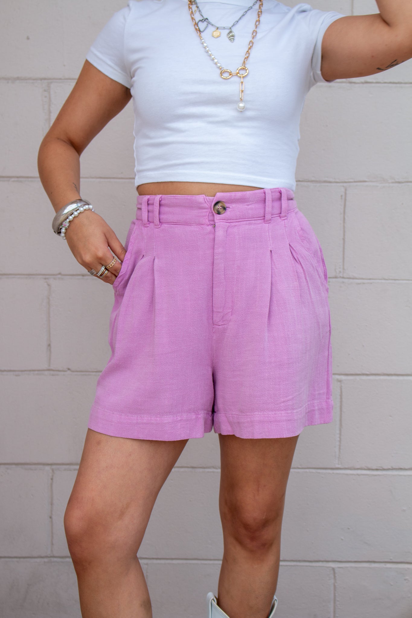 Our Bray Shorts feature a high rise pleat waist, zipper fly, belt loops, pockets and generous inseam. Pair with all your favorite cropped or flowy pieces for a cool-girl summer look.