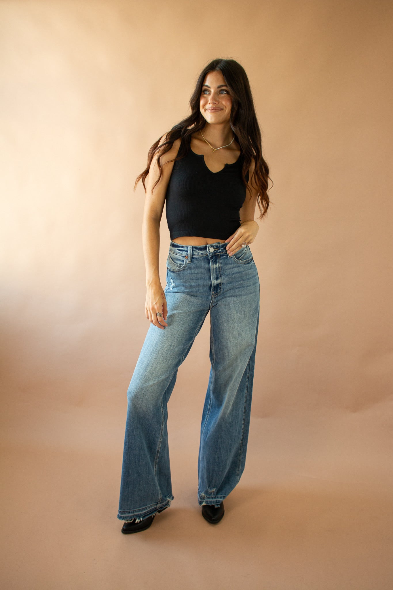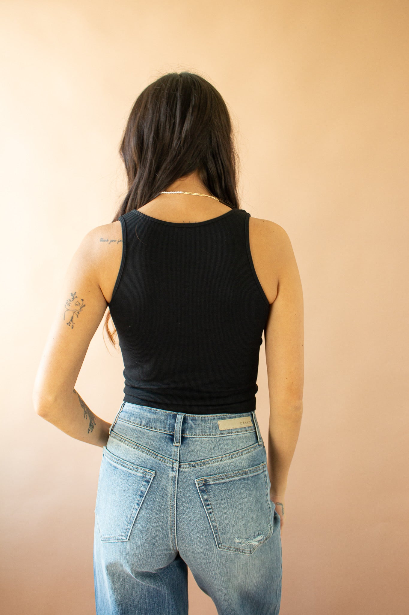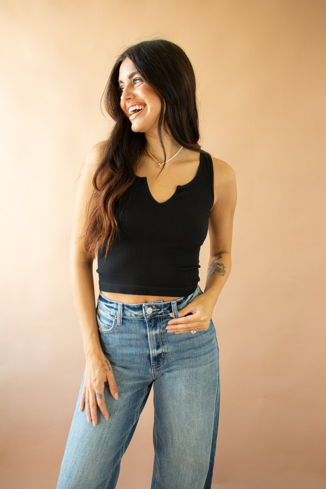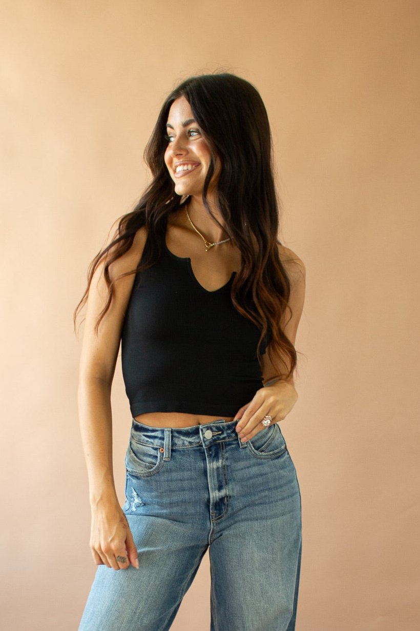 One size fits most in our Cecelia Crop Top, featuring a notched crew neckline and high cut back, ribbed texture, super soft brushed fabric, banded hem and cropped length. We love these paired with shackets and layering pieces or worn under tees as a bra alternative. Thick enough to wear alone, too!
