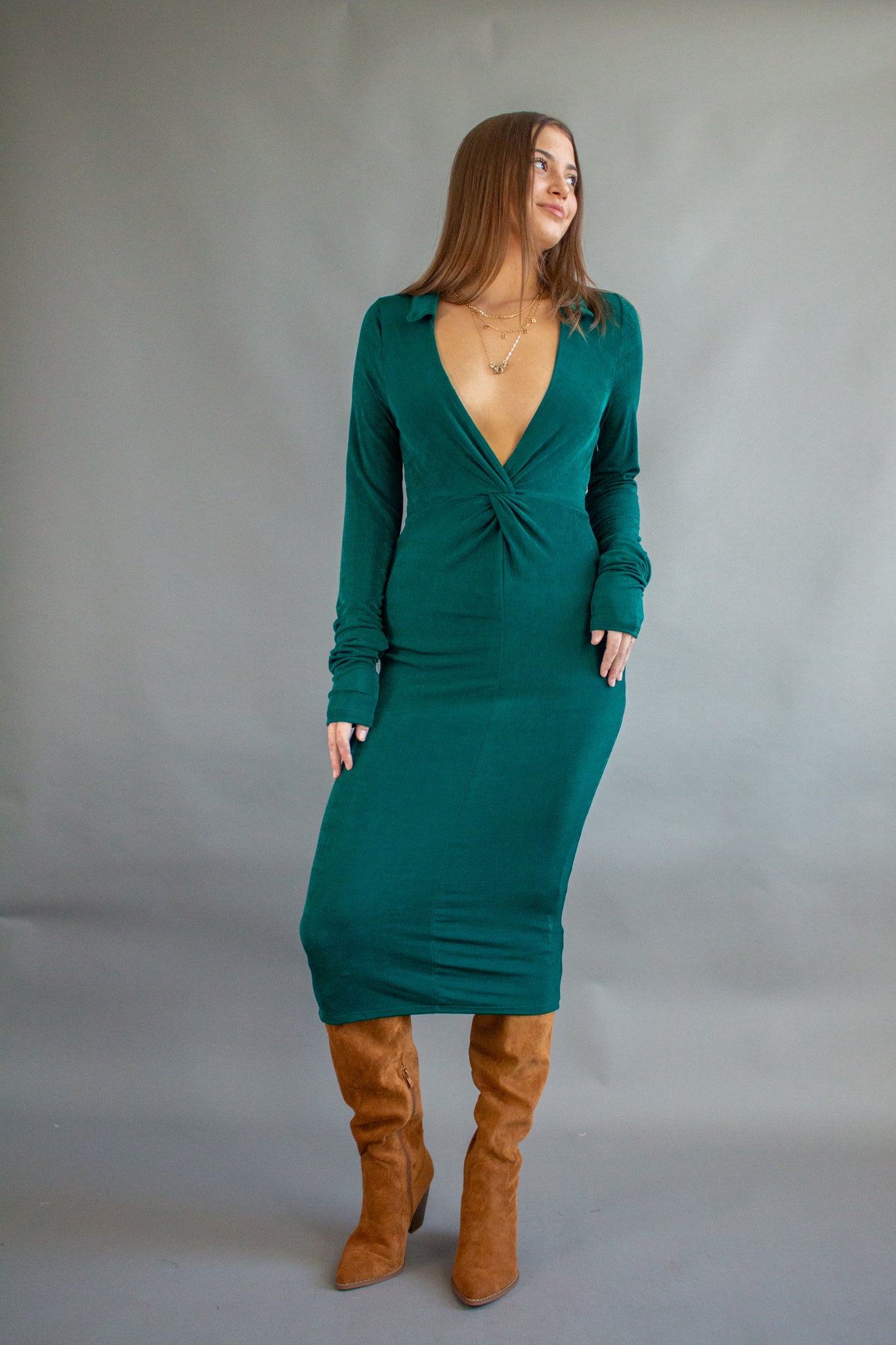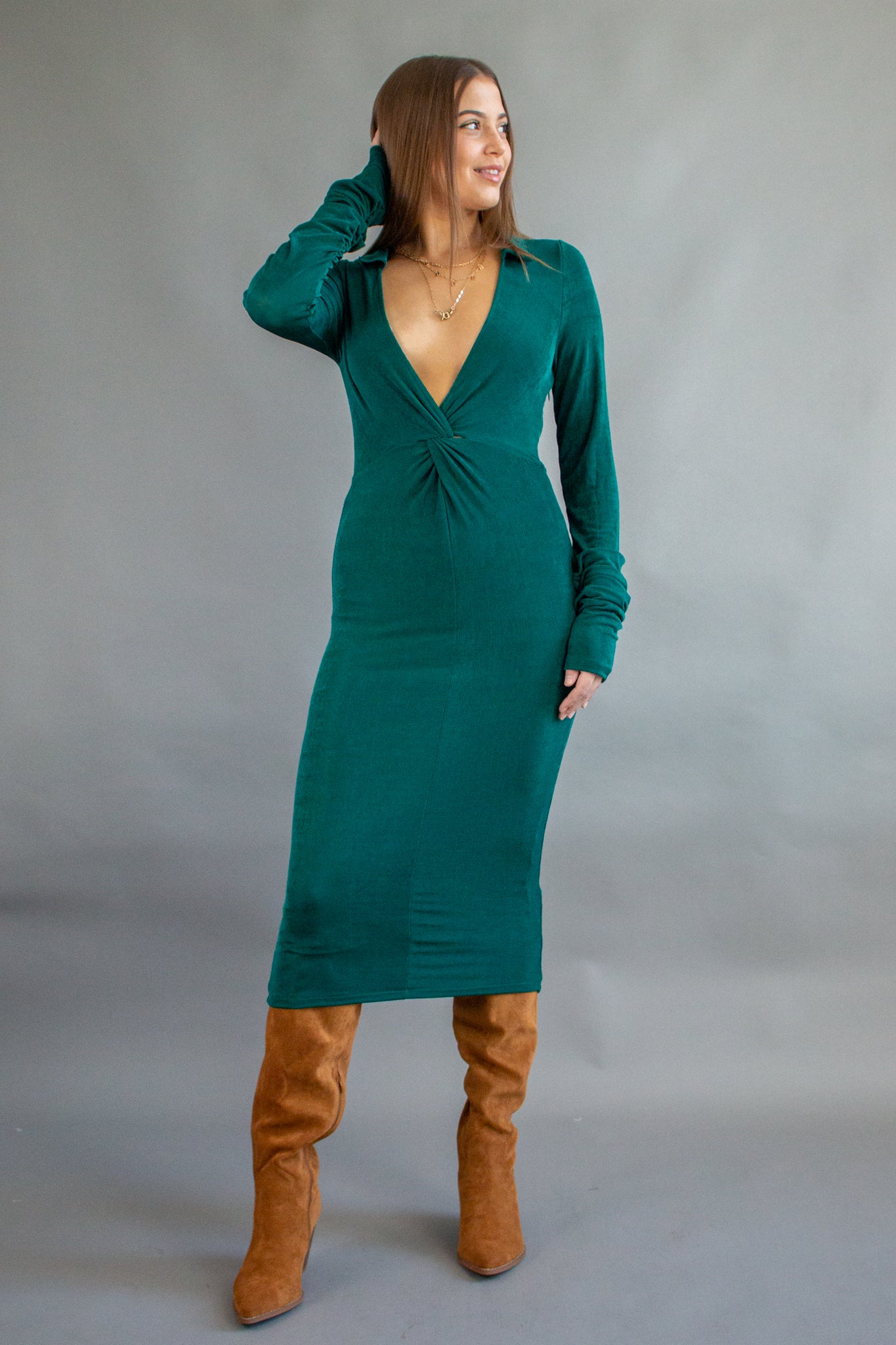 Holiday ready in our Magic Muse Dress, featuring a high shine lurex texture, super deep V neckline, twist detail bodice, collared neck, fitted long sleeves, midi-length hem and high stretch fit! Wear with boots and a leather jacket for an edgy look or dress it up with heels and some rhinestone jewelry!