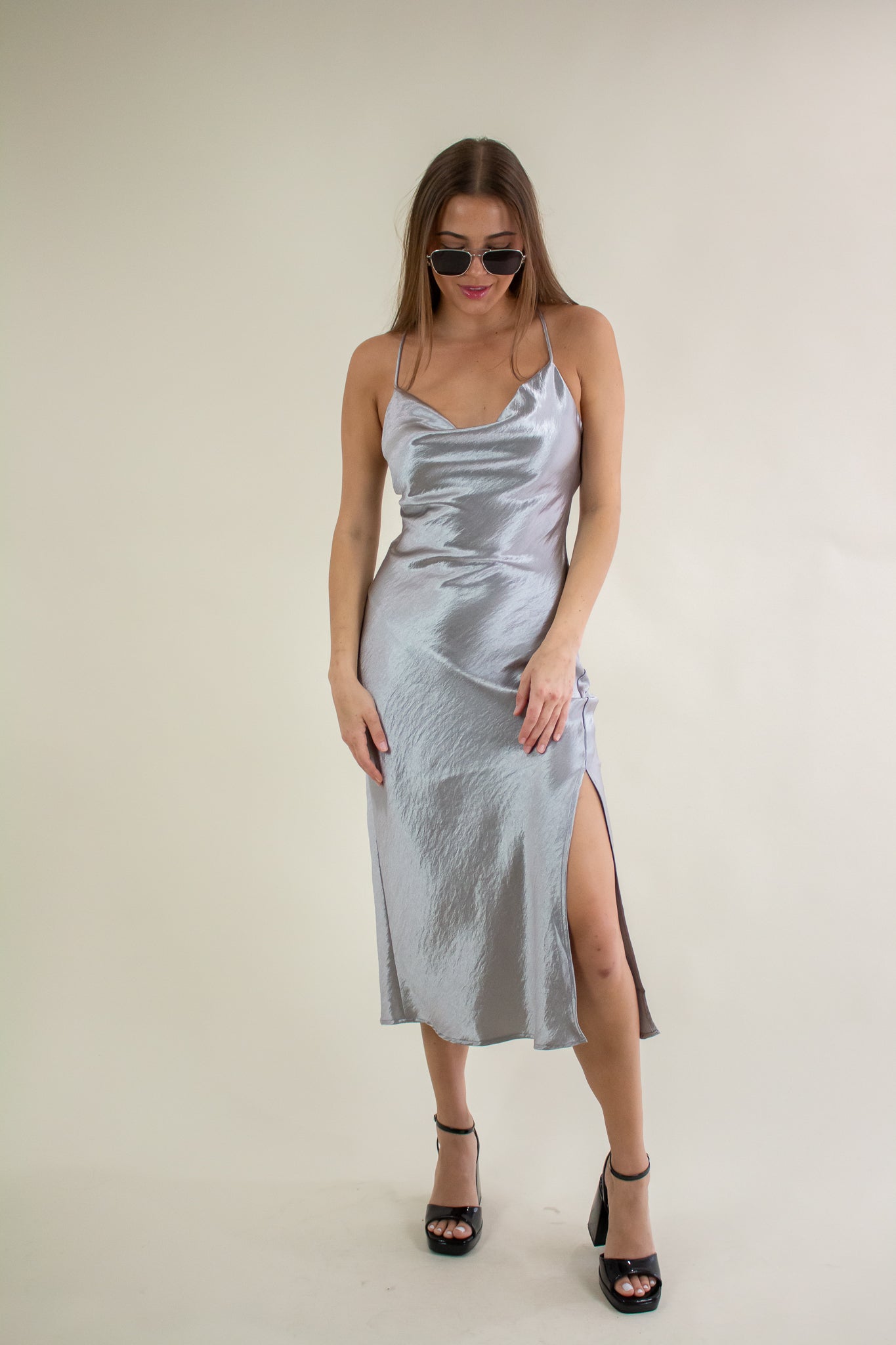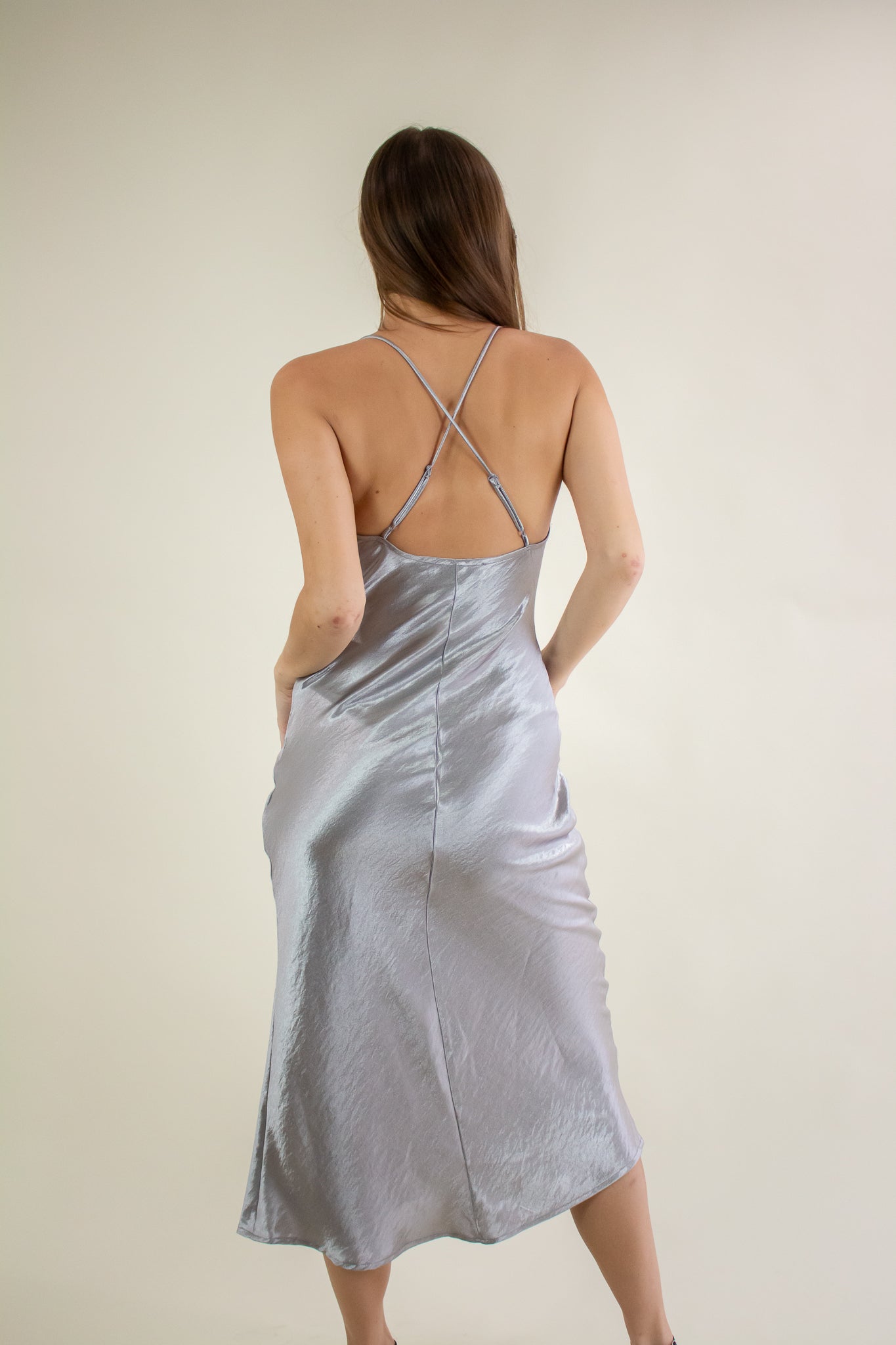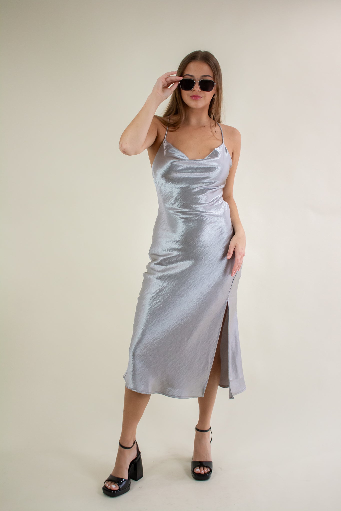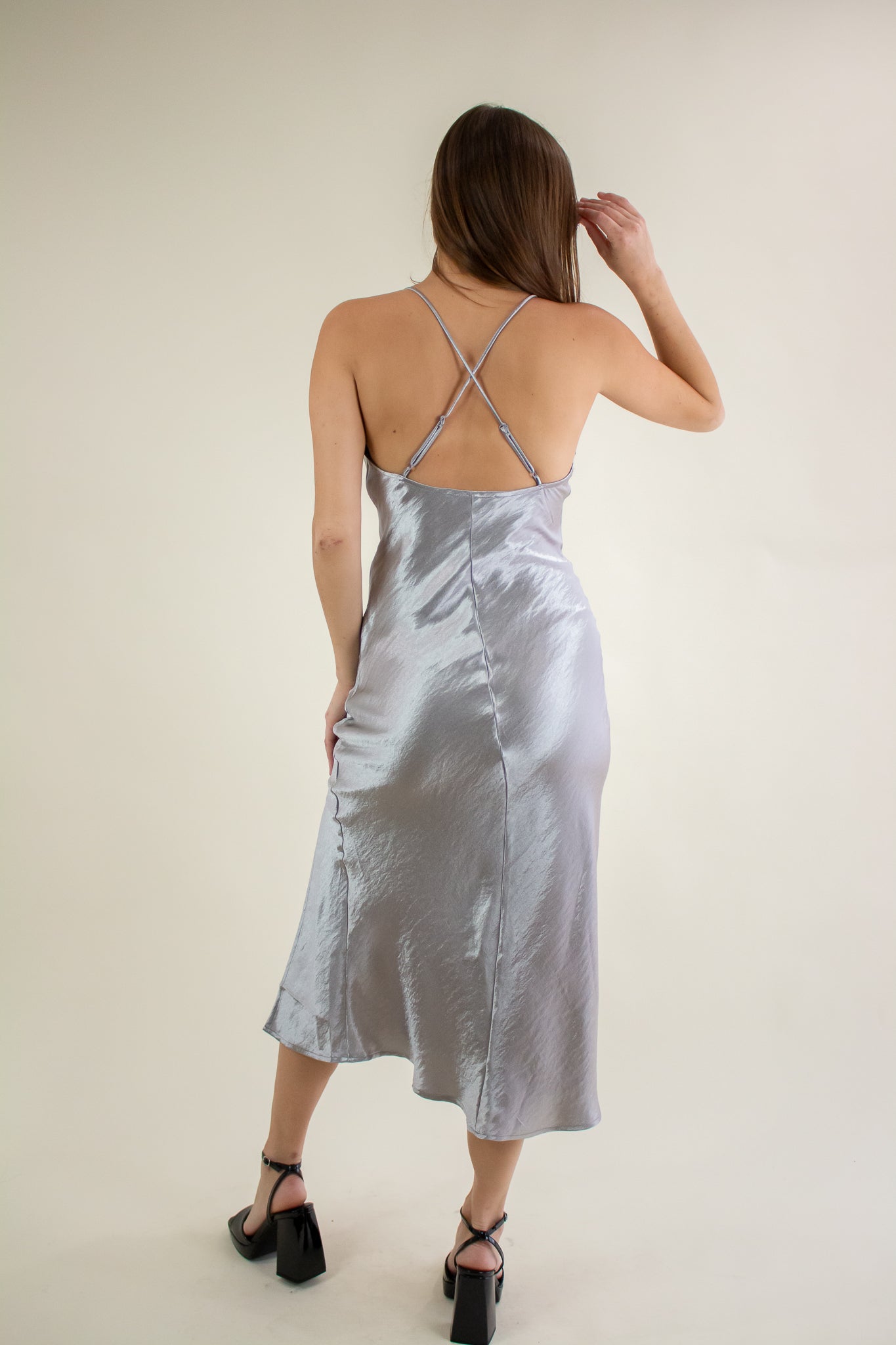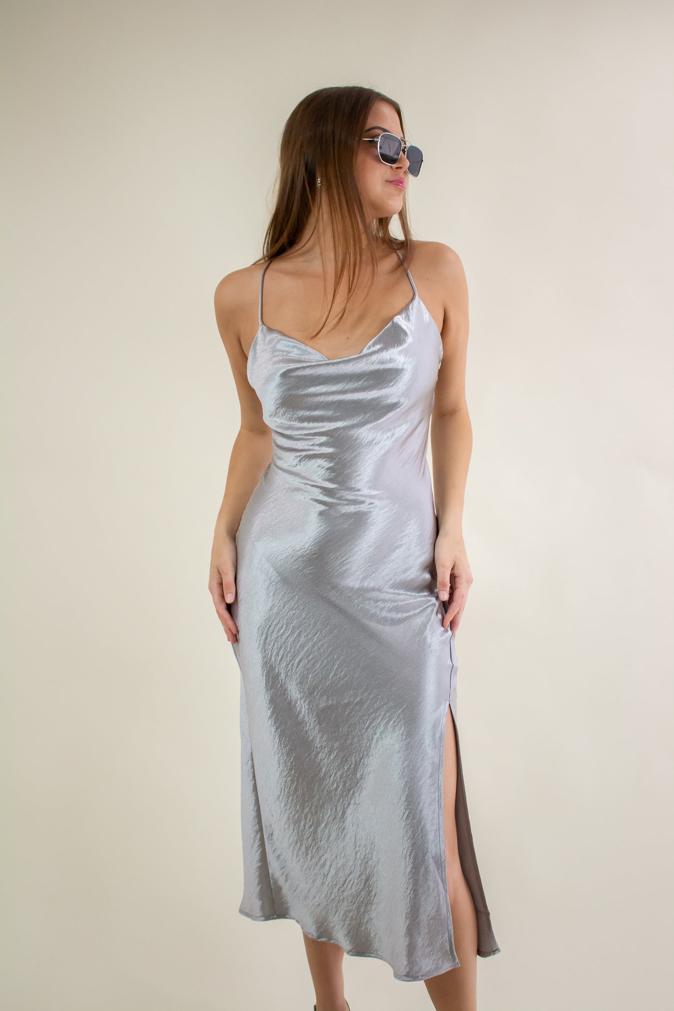 Slip into this satin number for a dreamy night ahead! Featuring a side slit, adjustable criss cross straps, cowl neckline and a satin-like finish. Pair with your favorite accessories, boots and a leather jacket for an evening look. The bias cut on this dress gives just enough stretch to flow evenly and smoothly over all your curves!