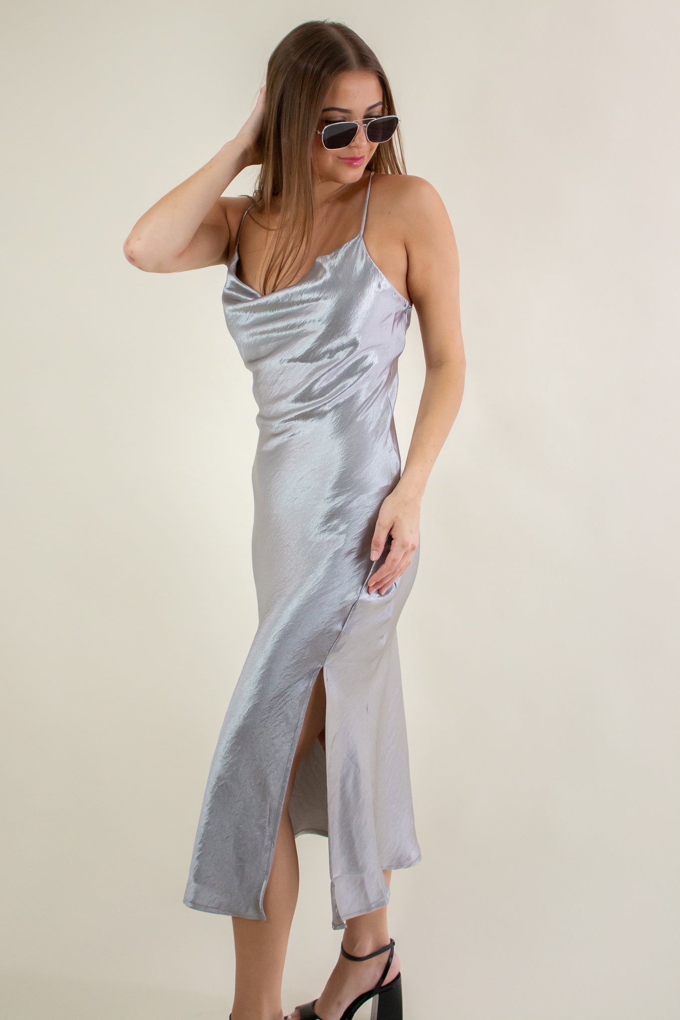 Mattie Satin Cowl Midi Dress Grey