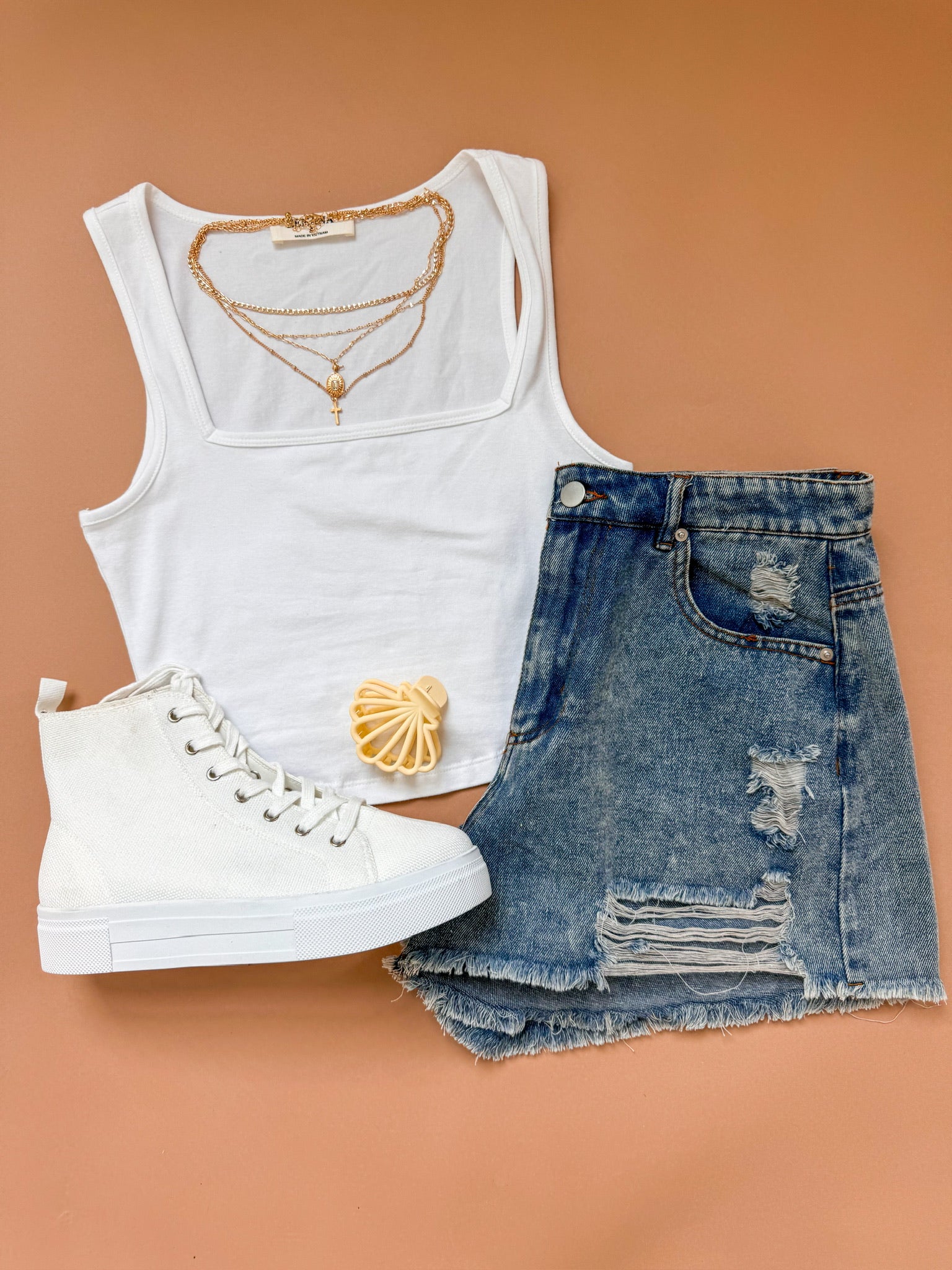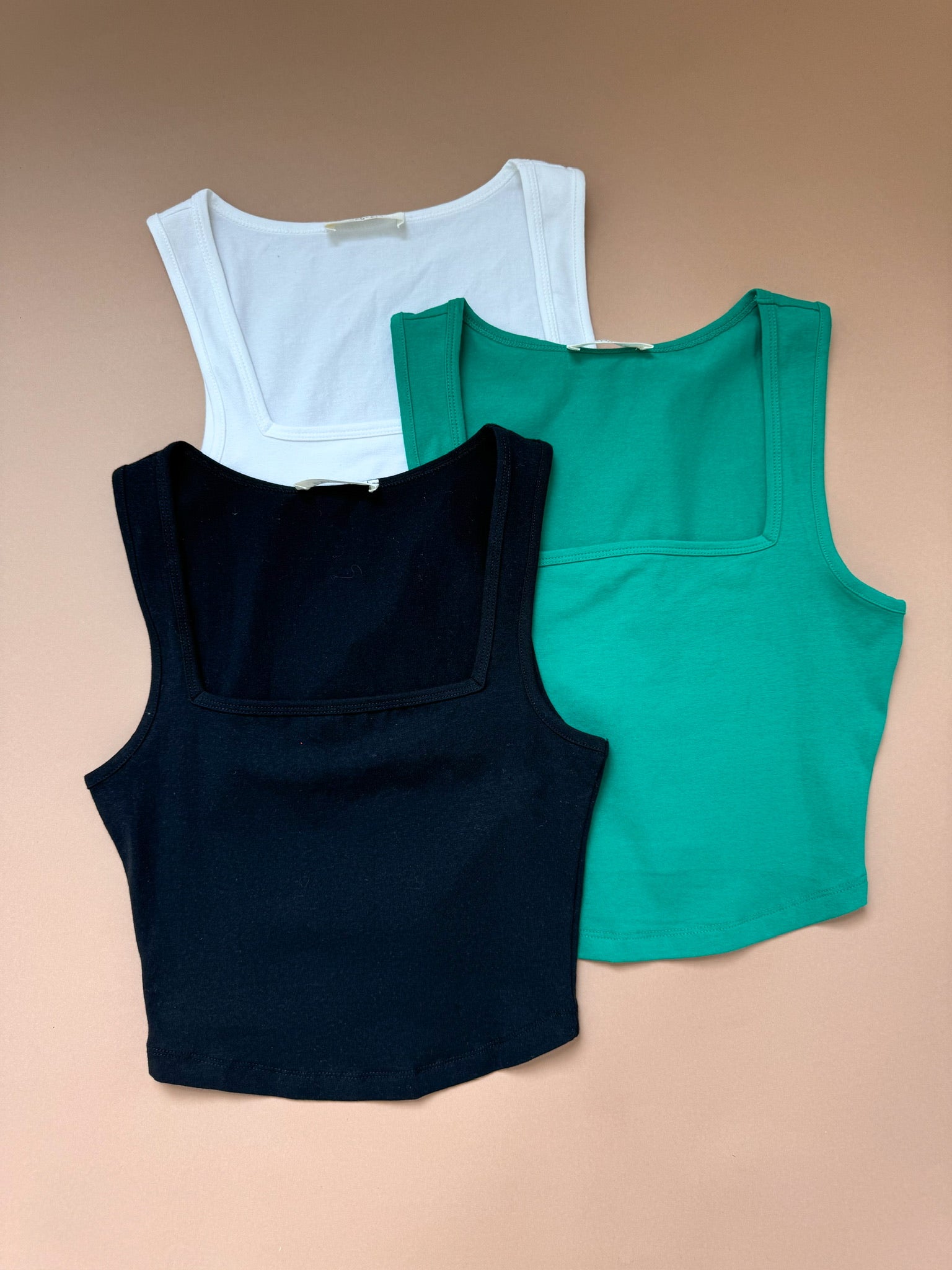 Our Reese Tank features a cool squared neckline, tank sleeves, Classic tee texture, cropped hem and closed back. Wear with slacks, satin skirts, baggy denim and more.