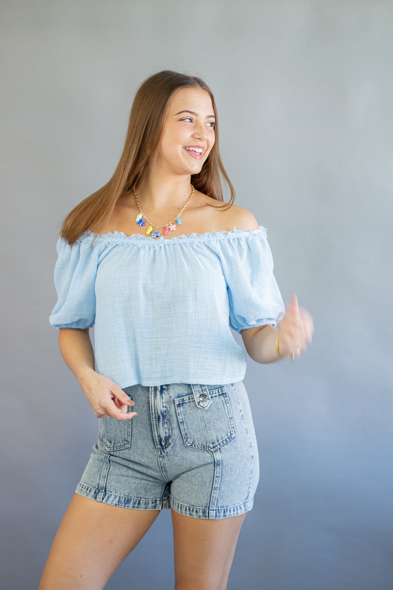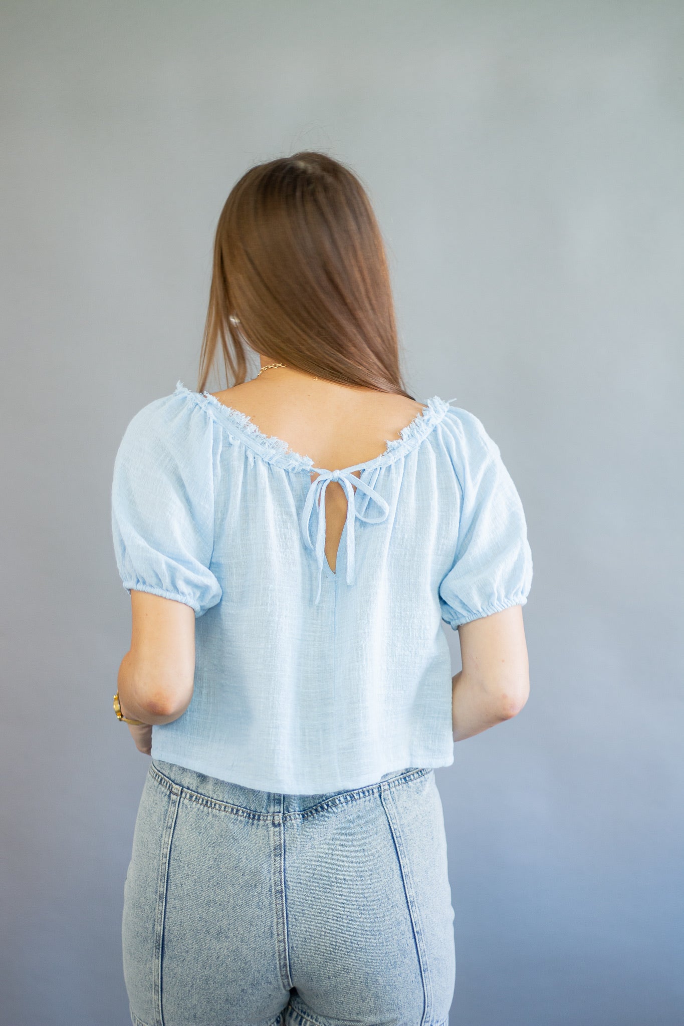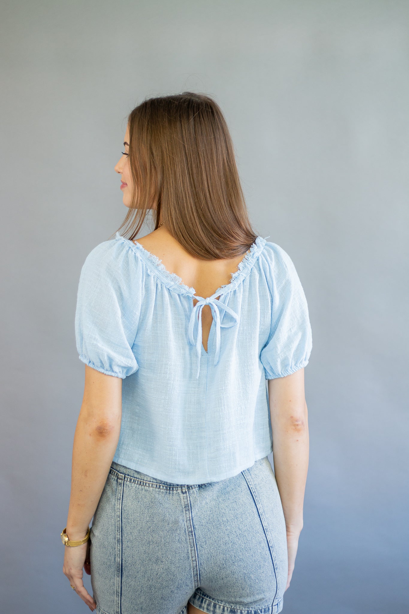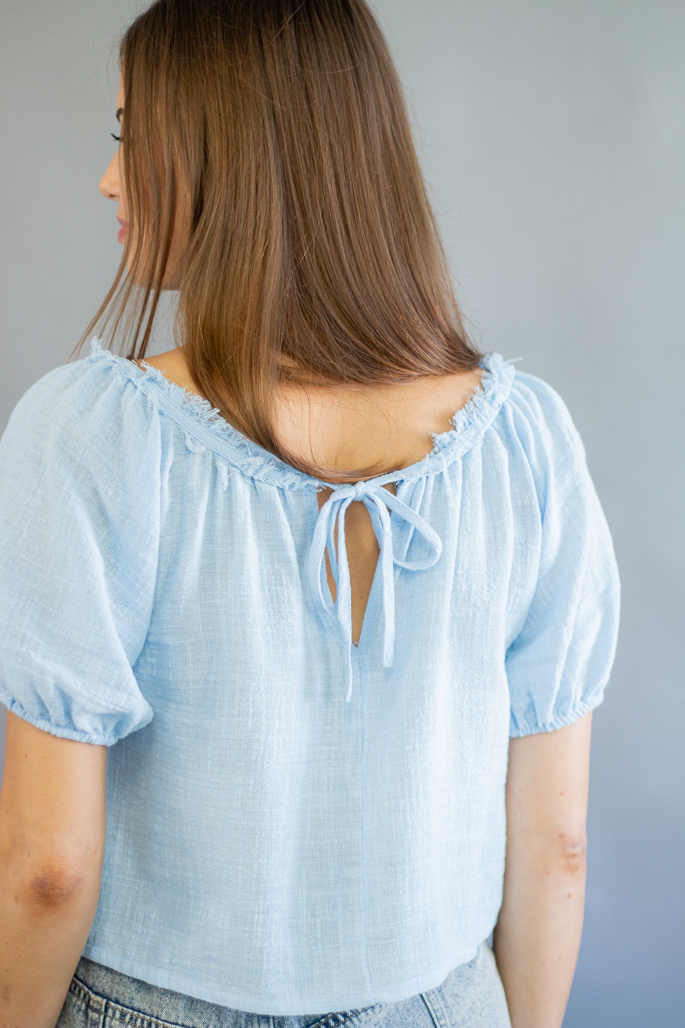 - Puff Sleeve Solid Woven Casual Crop Top - Pink Soft Girlcore Back Ribbon Blouse for Dinner - Lovely Recycling Spring Bloomcore Blouse Top - Eco Friendly Fabric Top - Round Frayed Neck