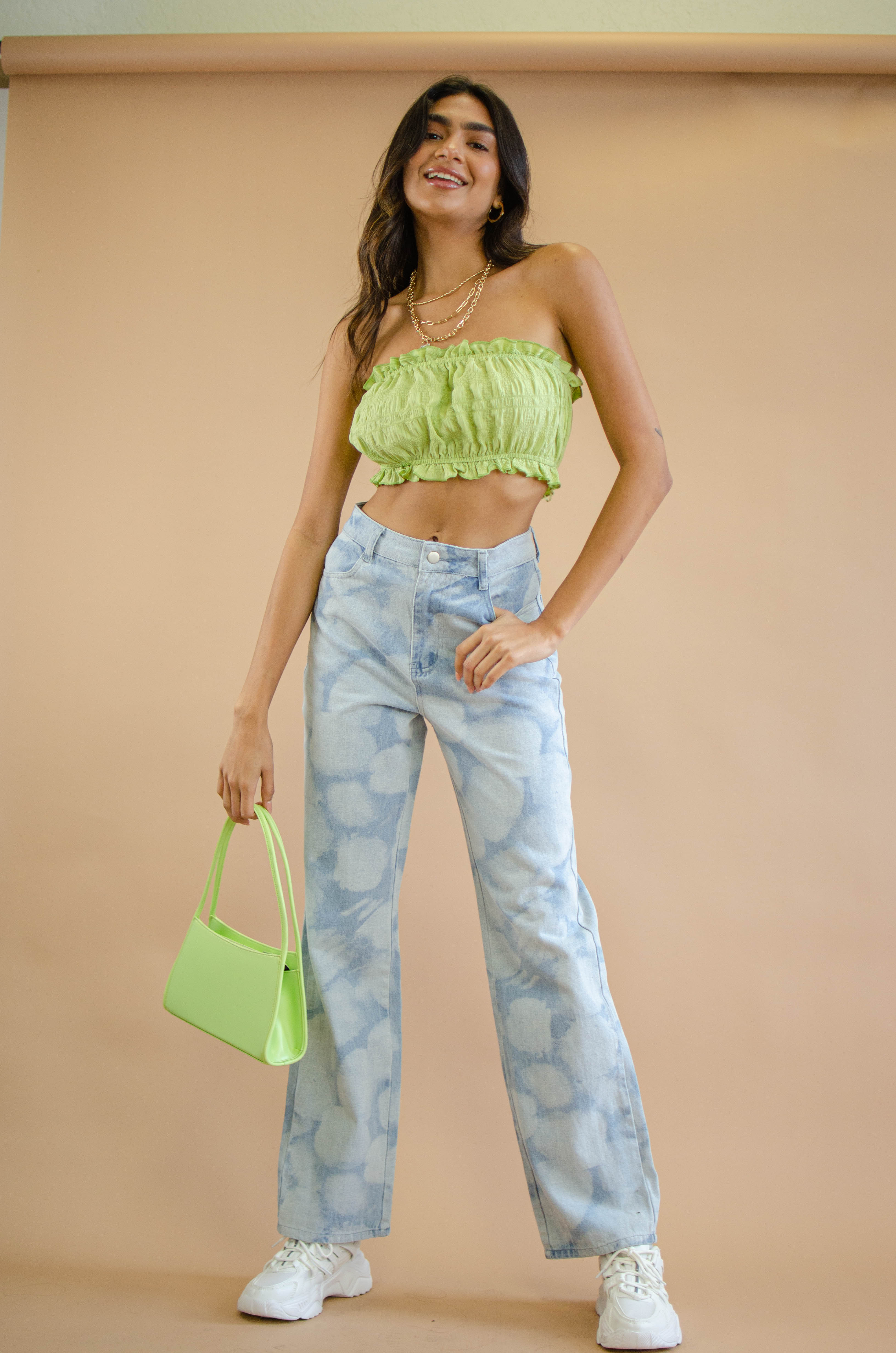 The sweetest set, our Trella duo is meant for springtime! The Top features a strapless puffed tube silhouette, mini ruffle trim, crinkle texture, micro cropped length and bold lime color! Wear with the matching shorts (sold separately) or pair with cargo jeans and a chunky boot.