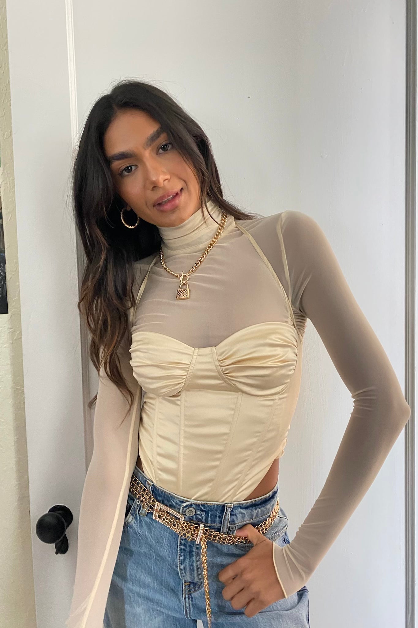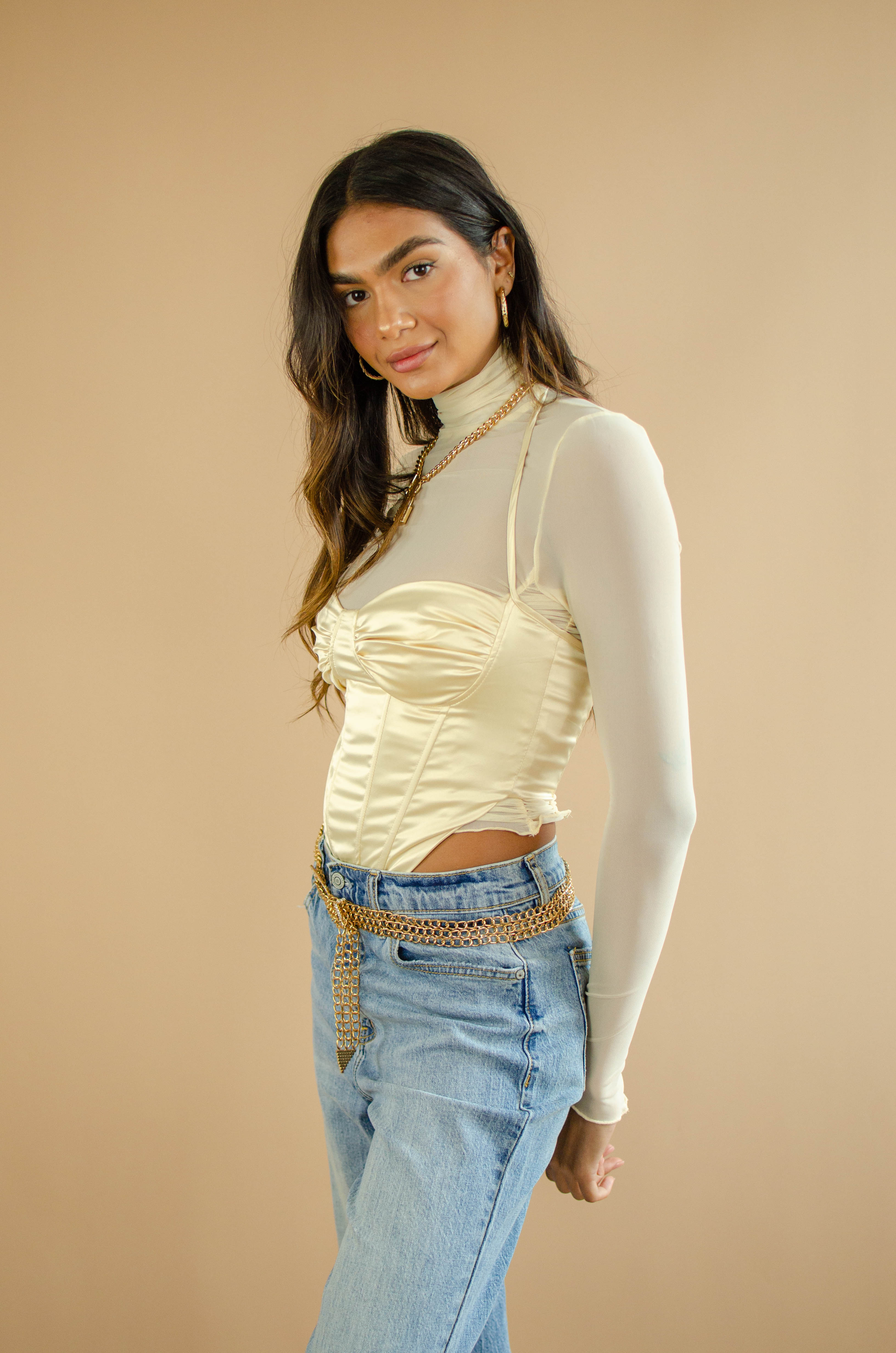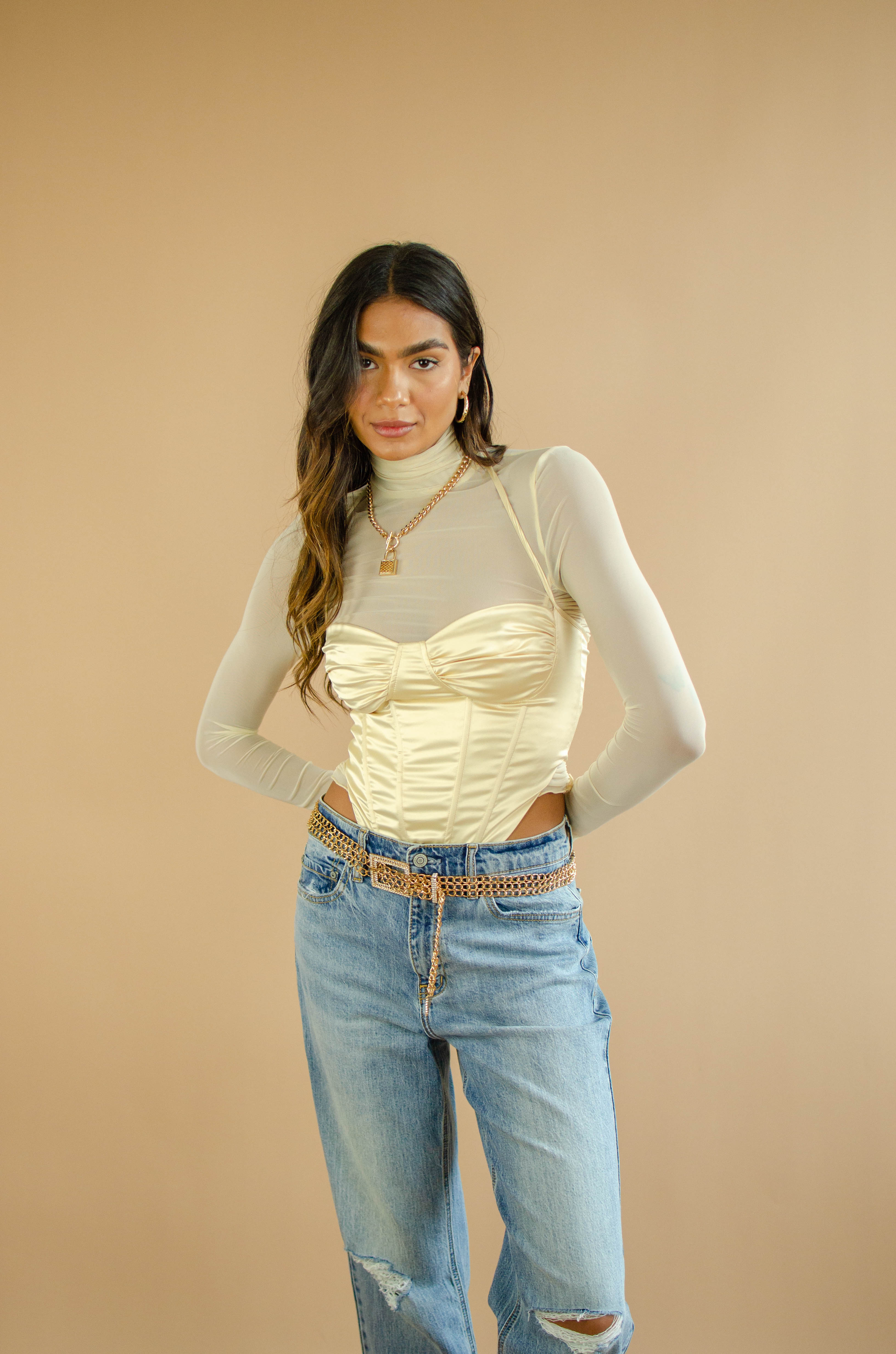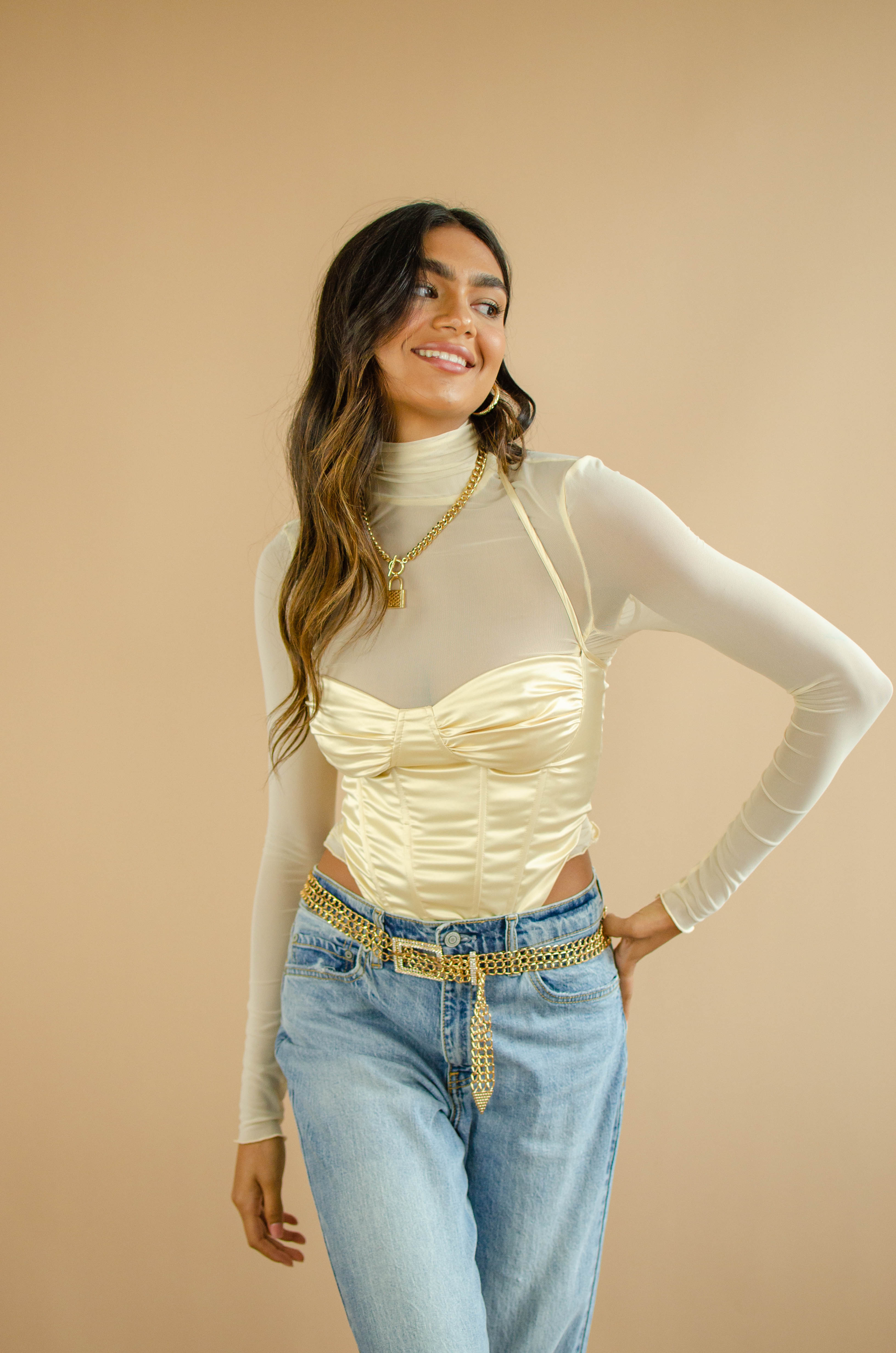 We told you, corsets are here to stay! Our Emmy Tank features a halter tie neck, sweetheart bustier neckline, cupped underwire and boning bodice, v-front hem, zipper back closure and high shine satin texture. Wear alone as a date night top, layer over mesh or thin turtlenecks, under button downs and more!