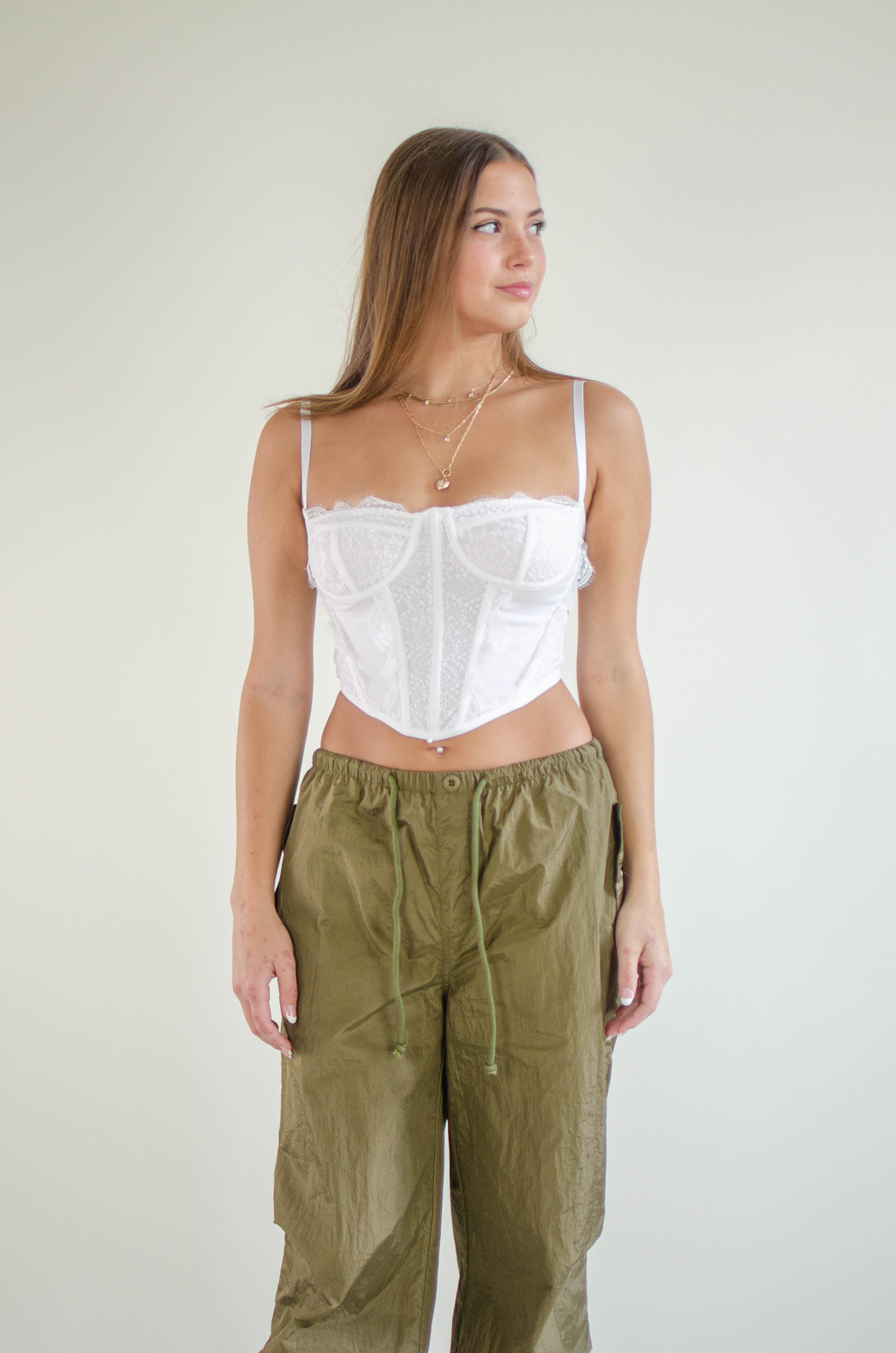 Our Lyric Top features a true corset style bodice with hook & eye closure, adjustable elastic straps, underwire cups and curved hem boning. We love the dainty lace applique and structured cinch fit. Pair alone with baggy pants and sneakers for a cool vibe or layer it with a baby tee for an edgy look.