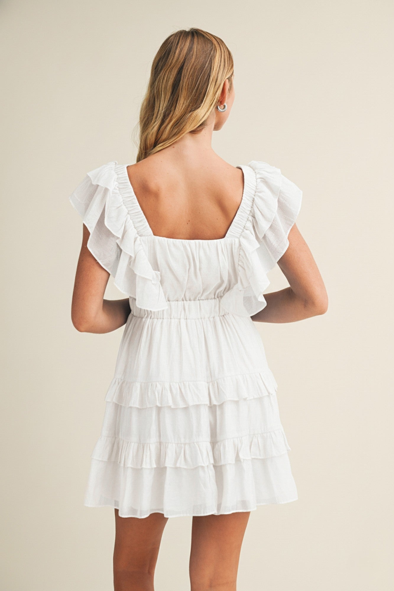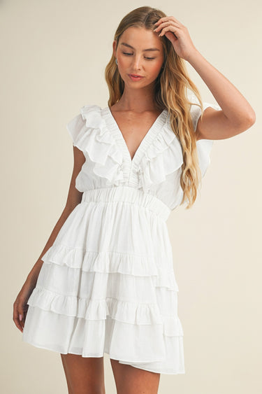 Soft, romantic, and effortlessly timeless — the Whispering Waves Ruffle Dress is your go-to for sunny days and special moments. Crafted from a lightweight rayon-blend fabric with a full lining for comfort, this dress features cascading ruffle tiers and a flattering deep V-neckline that adds the perfect feminine touch. The elastic waistband creates a defined yet comfortable fit, while the fluttery sleeves and airy movement make it perfect for any season.