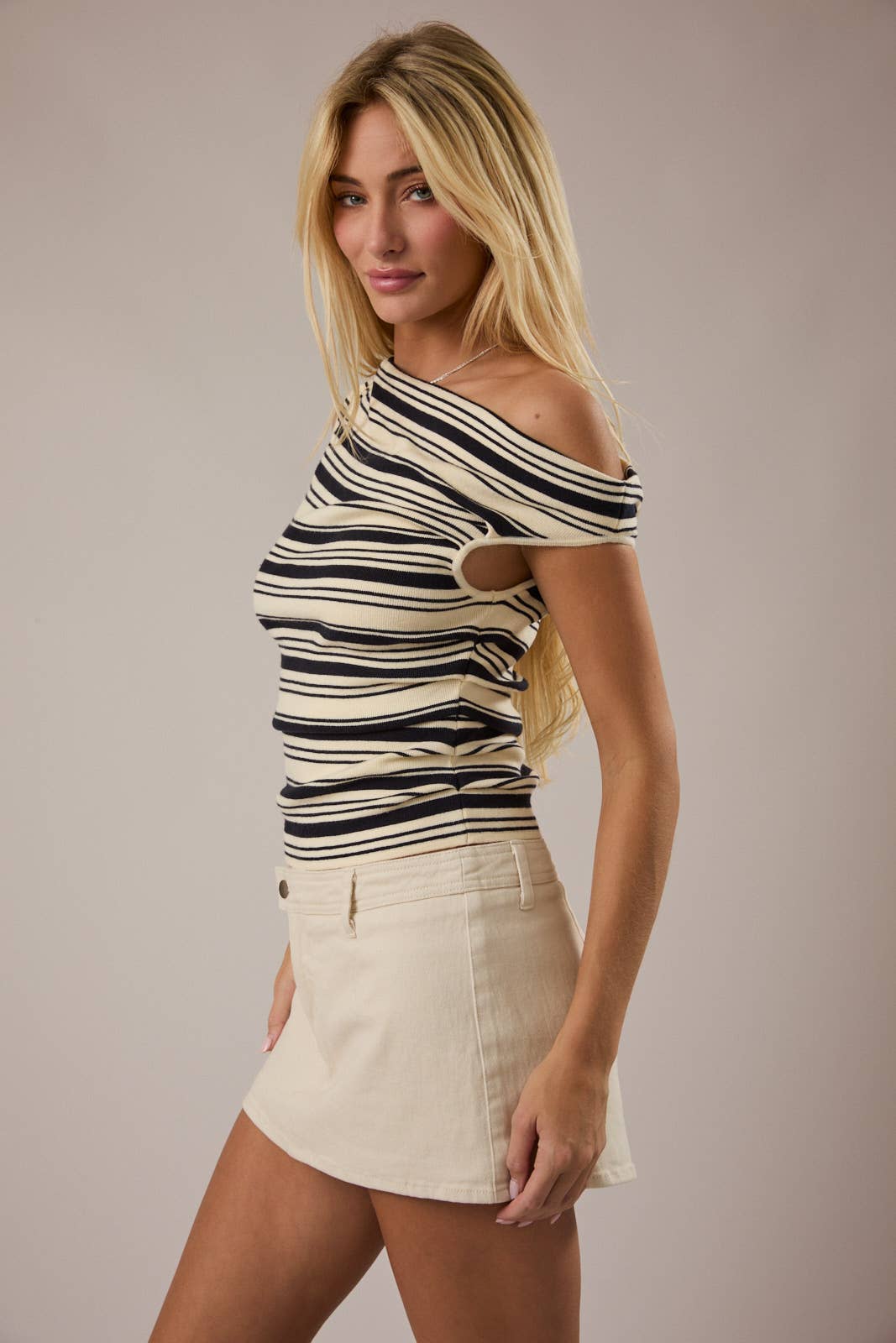 Chic with a touch of effortless cool, the Capri Coast Off-Shoulder Stripe Top is the perfect elevated basic. Designed with a flattering asymmetrical neckline that softly drapes off the shoulder, this fitted knit features classic neutral stripes for a timeless, coastal feel. The cropped silhouette makes it easy to pair with high-rise denim, tailored trousers, or a sleek mini for an understated but polished look.