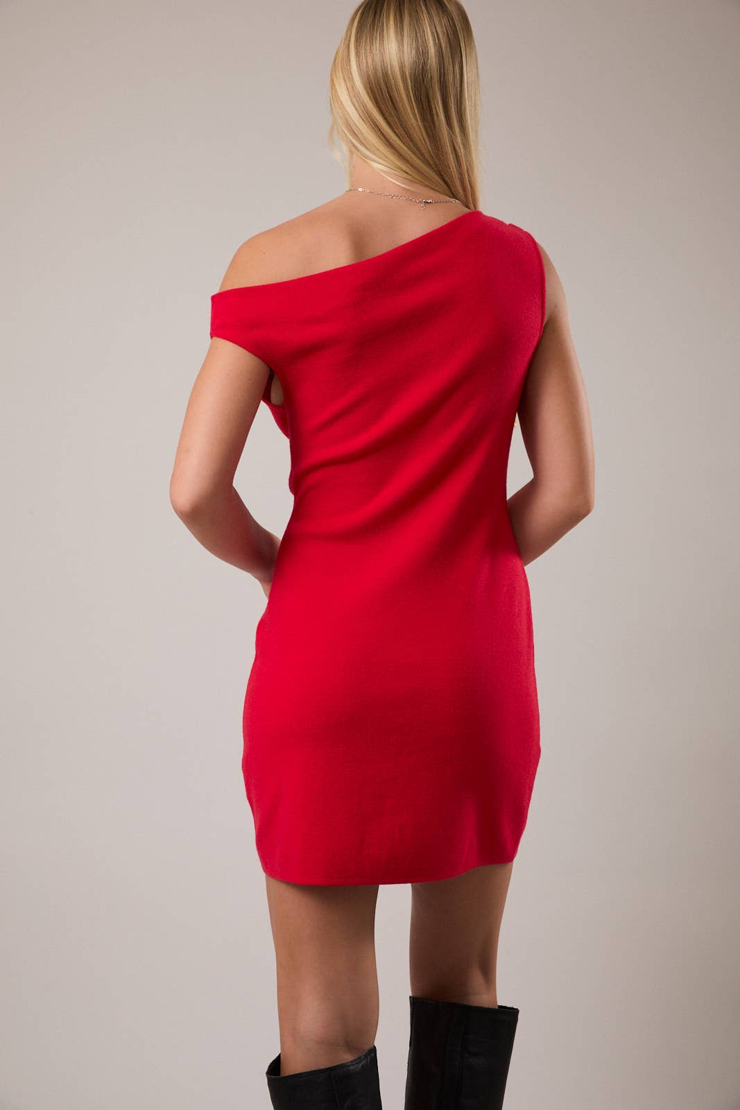 Turn heads the moment you walk in. This sleek red mini dress features an asymmetrical off-the-shoulder neckline with a softly draped detail that hugs in all the right places. Designed with a smooth, stretchy fabrication and a flattering bodycon silhouette, it’s the ultimate night-out, date-night, or holiday statement piece.