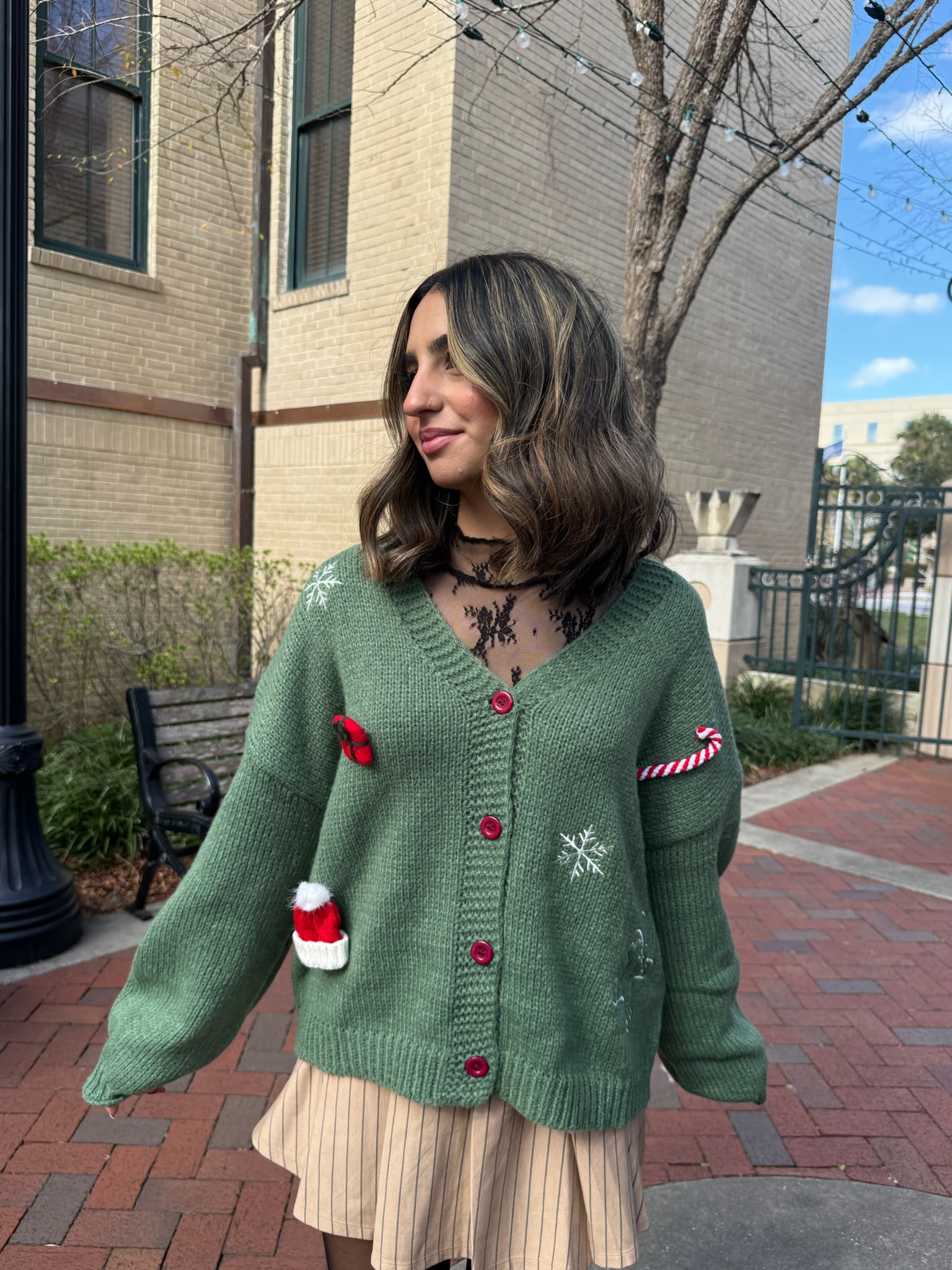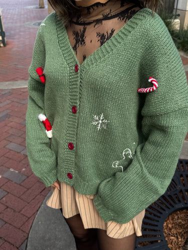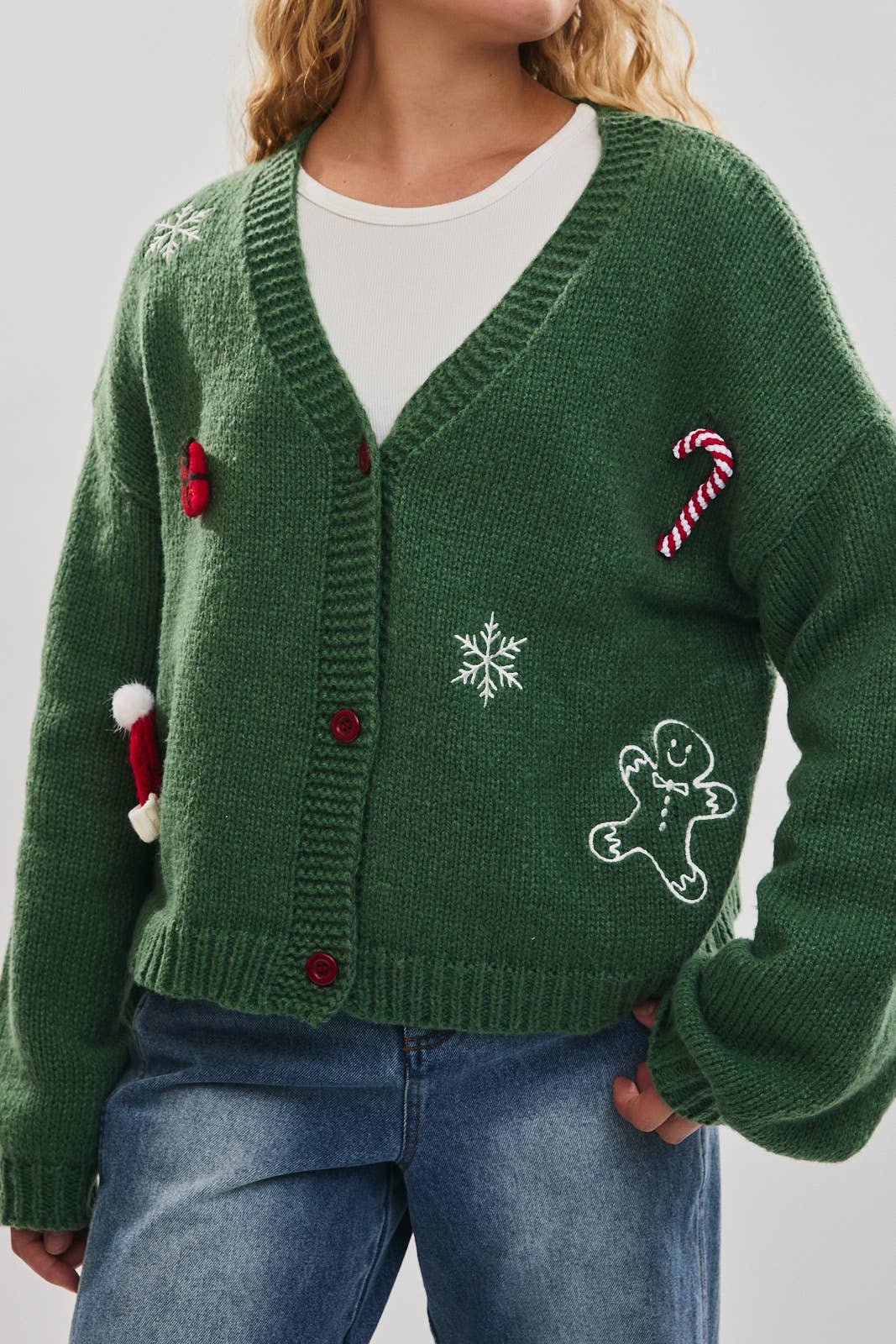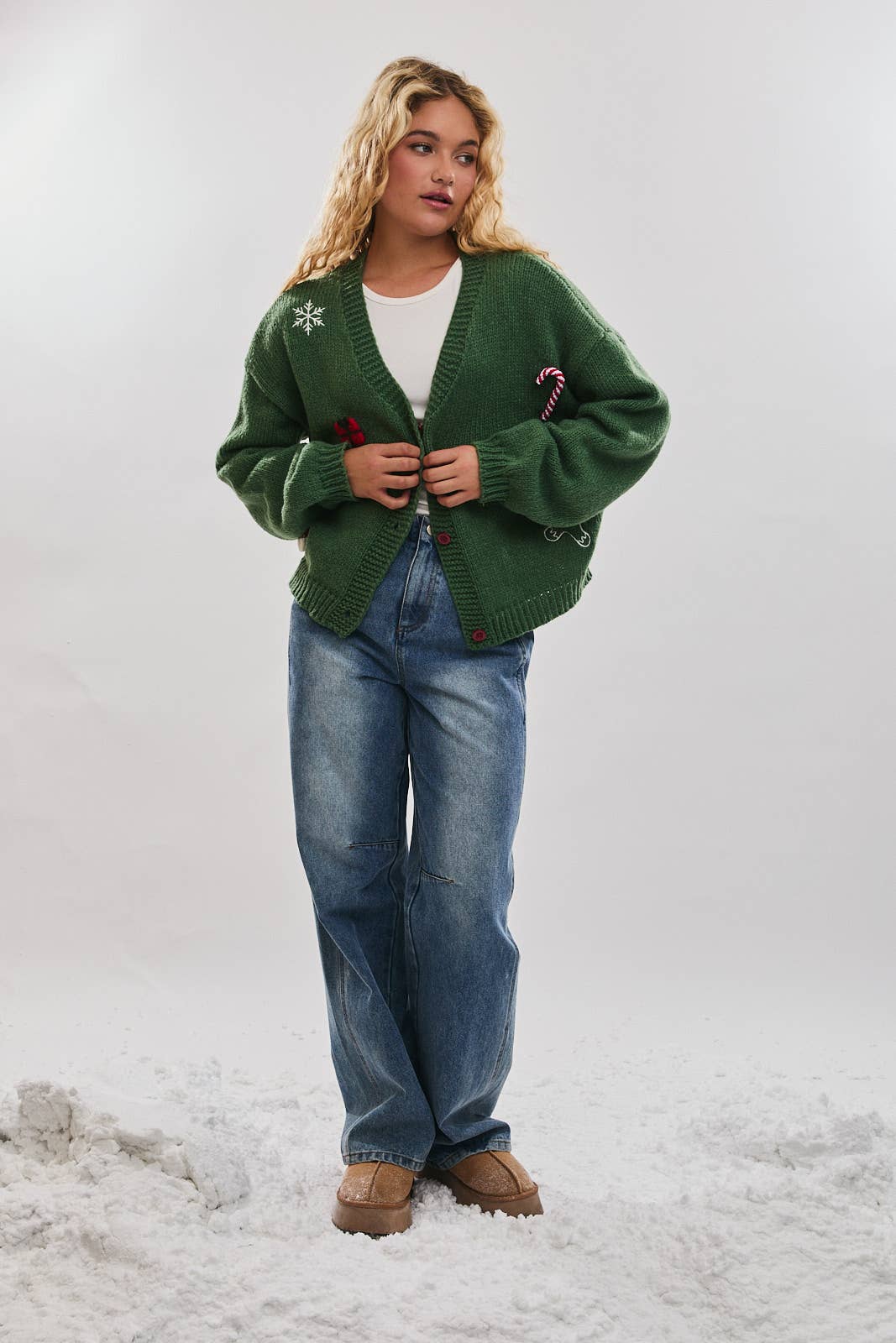 Bring cozy holiday charm to every outfit with the Holly Jolly Knit Cardigan, a cheerful green button-up that’s made for fireside nights, gift wrapping, and all things merry. This soft, medium-weight knit features playful embroidered details — from candy canes and snowflakes to tiny presents — giving it that nostalgic Christmas feel without sacrificing style. Designed with an easy, relaxed fit, dropped shoulders, and red button accents, it’s perfect for layering over your favorite tee or turtleneck. Style it with denim and fuzzy socks for a cozy day in or dress it up with a mini skirt and boots for your next holiday party.