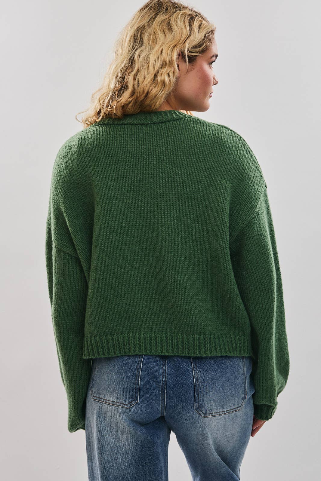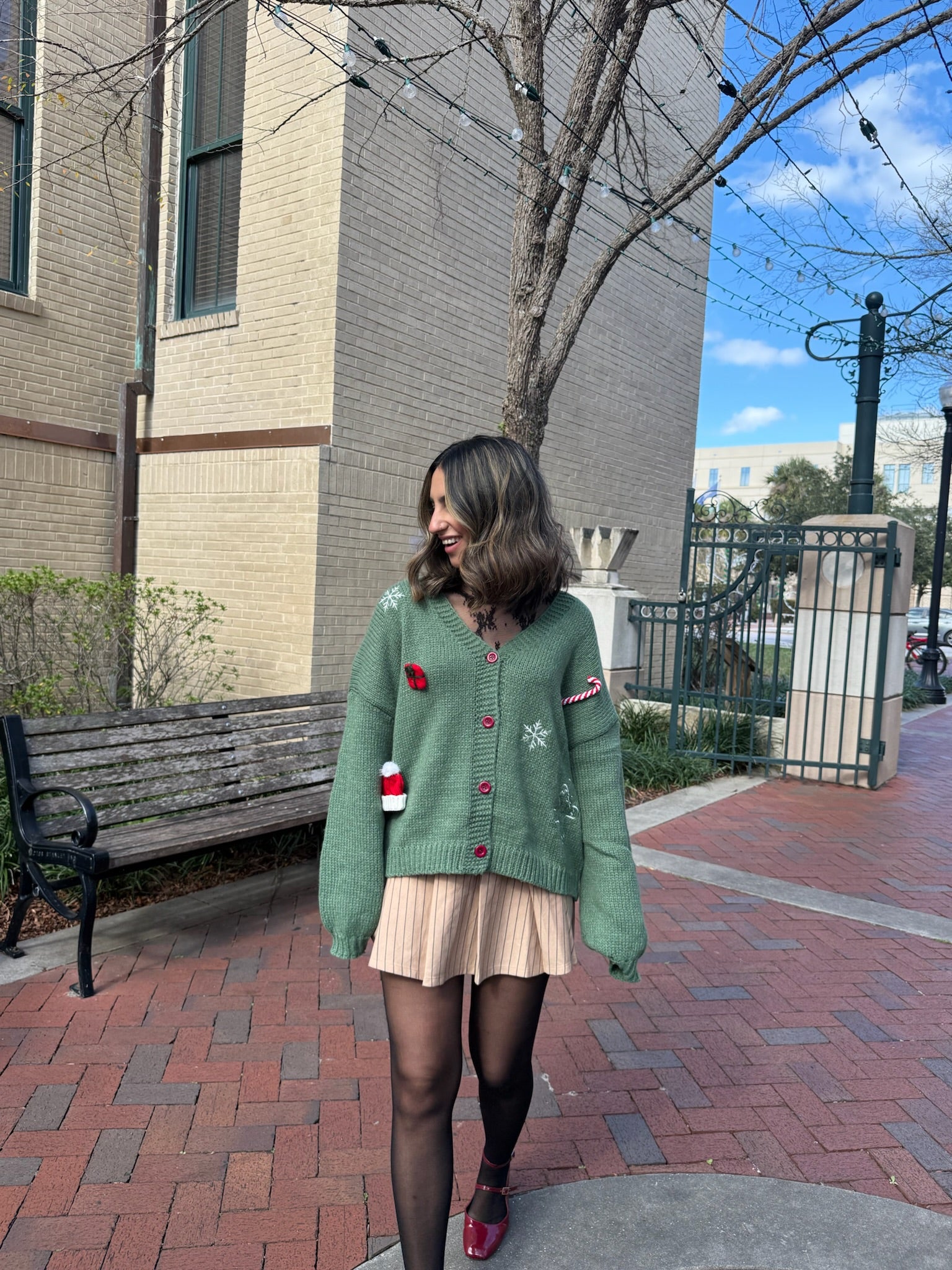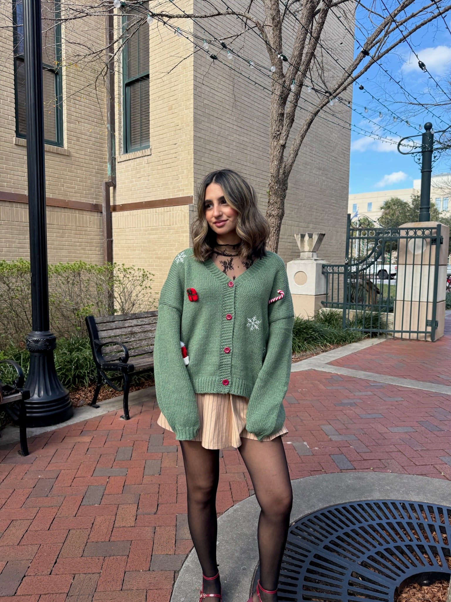 Bring cozy holiday charm to every outfit with the Holly Jolly Knit Cardigan, a cheerful green button-up that’s made for fireside nights, gift wrapping, and all things merry. This soft, medium-weight knit features playful embroidered details — from candy canes and snowflakes to tiny presents — giving it that nostalgic Christmas feel without sacrificing style. Designed with an easy, relaxed fit, dropped shoulders, and red button accents, it’s perfect for layering over your favorite tee or turtleneck. Style it with denim and fuzzy socks for a cozy day in or dress it up with a mini skirt and boots for your next holiday party.