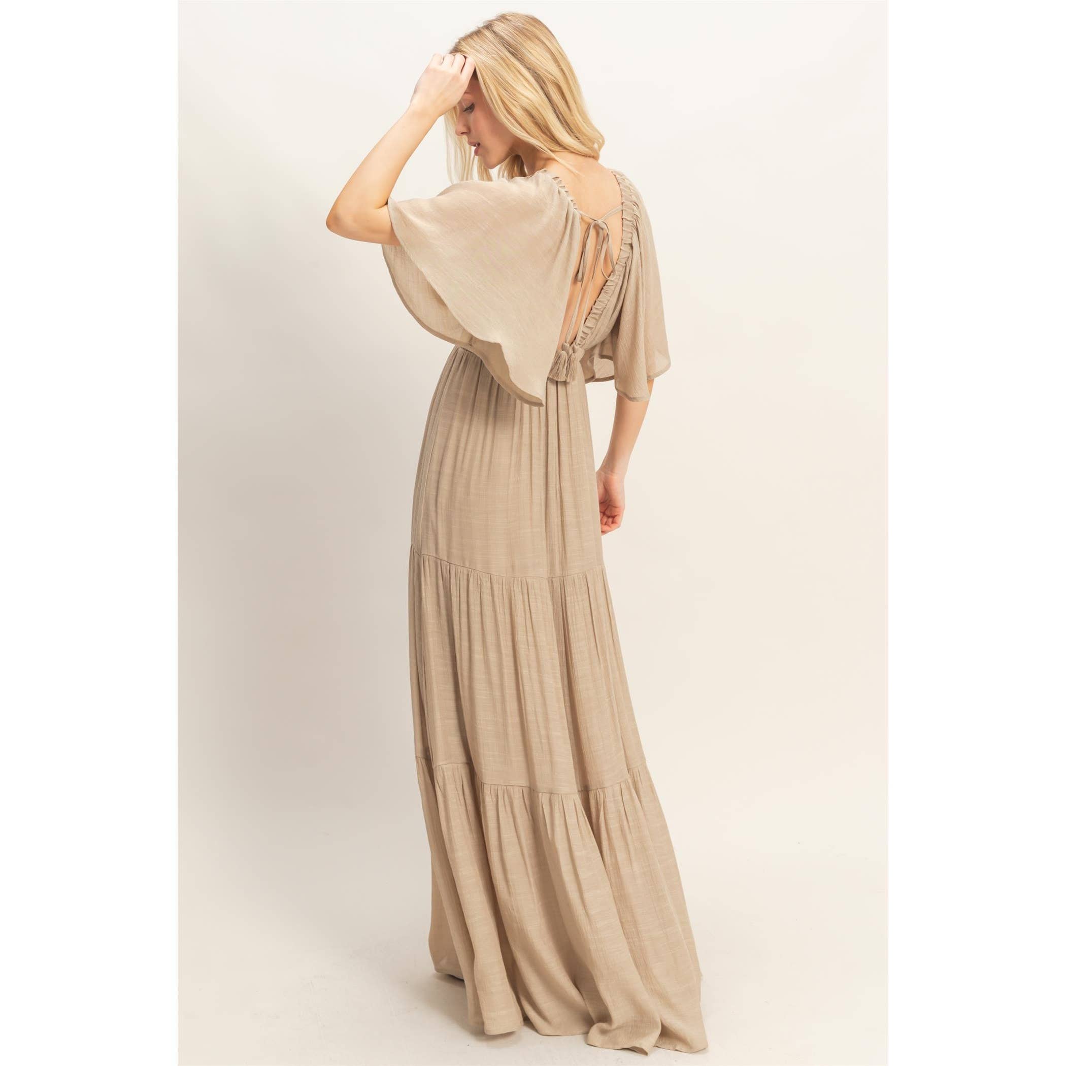 Romantic, airy, and effortlessly elegant, the Kelly Flutter Sleeve Tiered Maxi Dress is made for those dreamy warm-weather moments. Featuring a flattering V-neckline and soft flutter sleeves, this dress is designed with an empire waist that flows into a breezy tiered maxi skirt. The lightweight fabric creates beautiful movement with every step, making it perfect for brunch, vacation evenings, or special events.