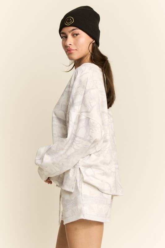 Soft, cozy, and effortlessly cool — the Cloud Marble Lounge Sweatshirt is your new go-to for elevated lounging. Designed in plush terry fabric with a dreamy marble print, this relaxed pullover features a classic round neckline, long sleeves, and a flattering split hem for easy movement and styling. The slightly oversized fit and buttery-soft feel make it perfect for slow mornings, travel days, or pairing with the matching shorts for a chic lounge set moment.