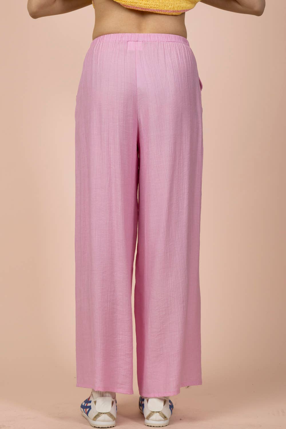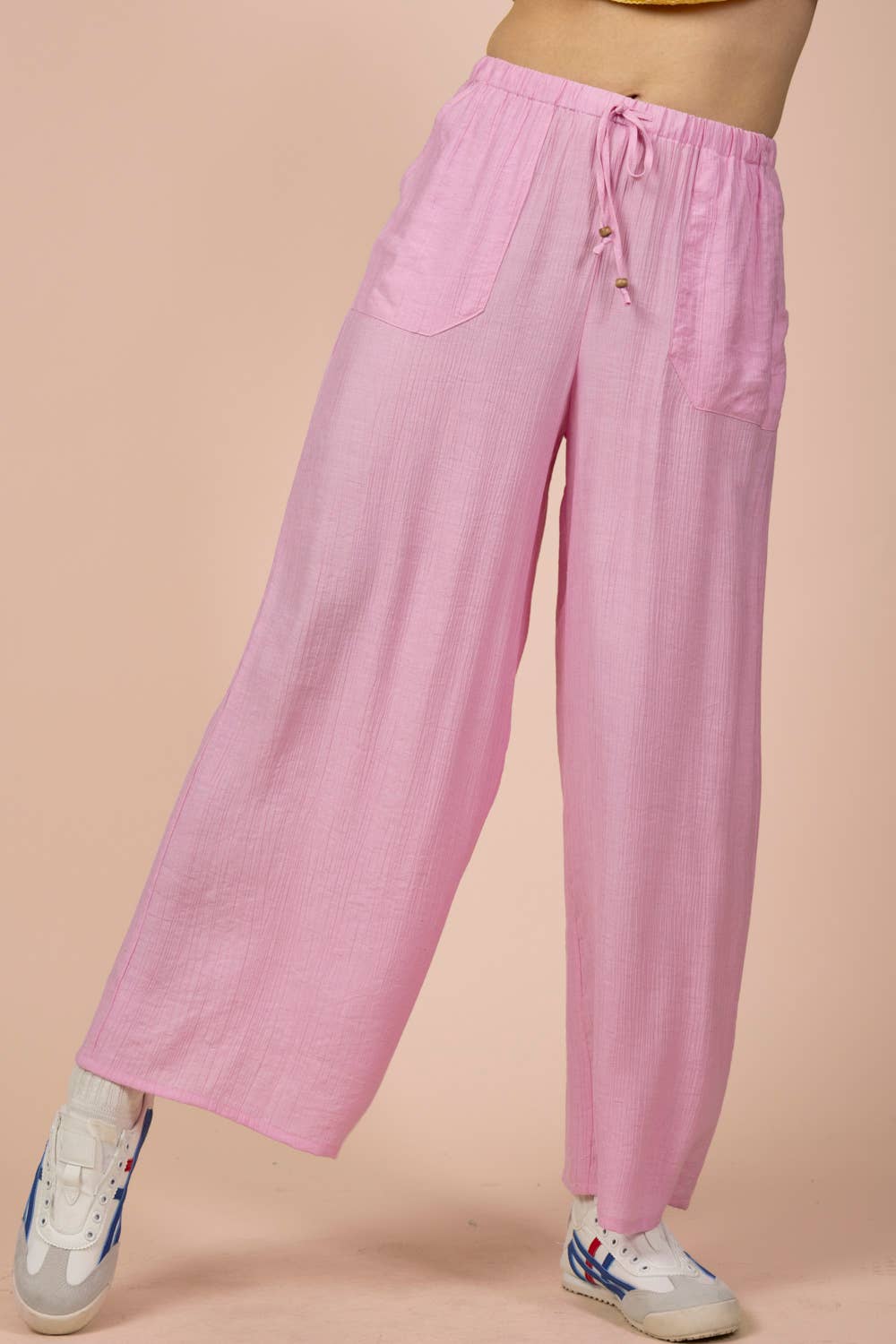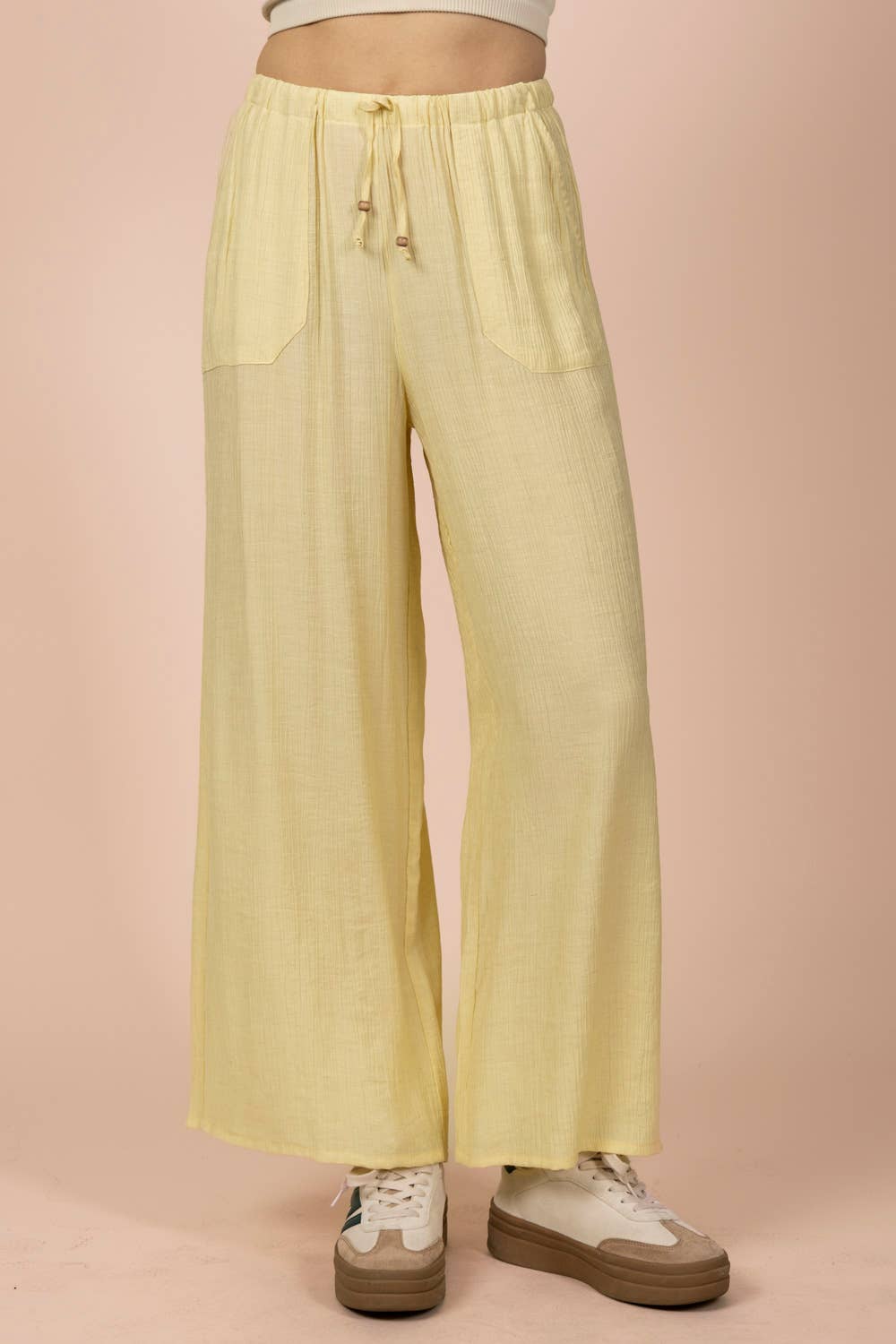 Easy, airy, and endlessly wearable, the East Coast Wide-Leg Woven Pants are your go-to for laid-back days with a polished feel. Designed in a breathable woven fabric with a soft textured finish, these pants feature a relaxed wide-leg silhouette that moves effortlessly with you. The elastic waistband with an adjustable tie offers all-day comfort, while functional side pockets add practicality. Dress them up with a fitted tank and sandals or keep it casual with sneakers and a tee—these are made to live in.