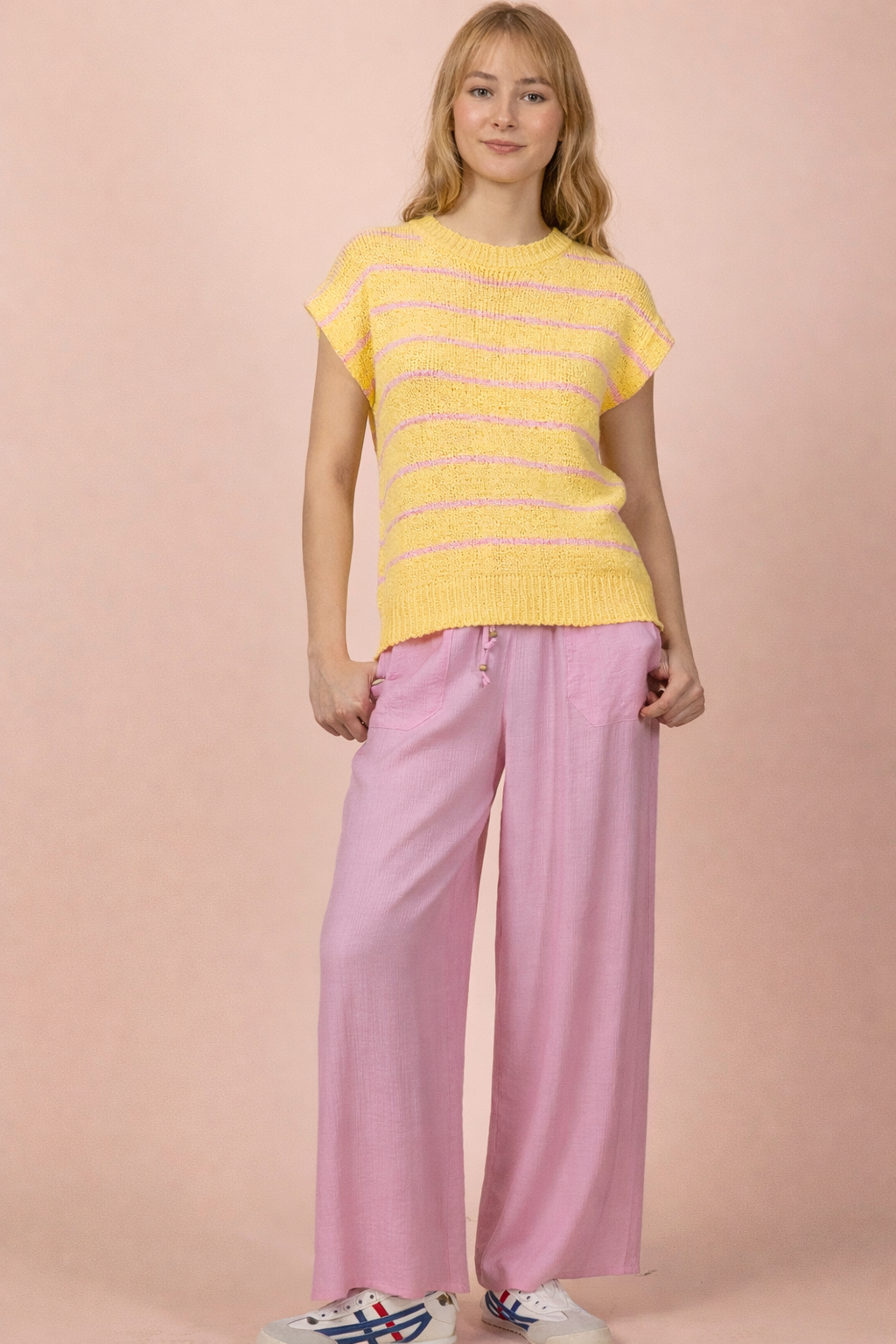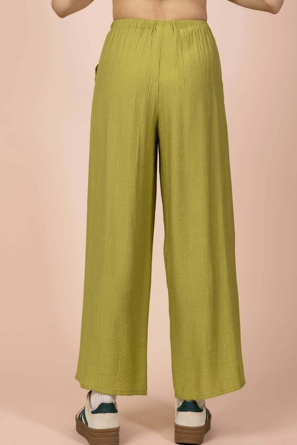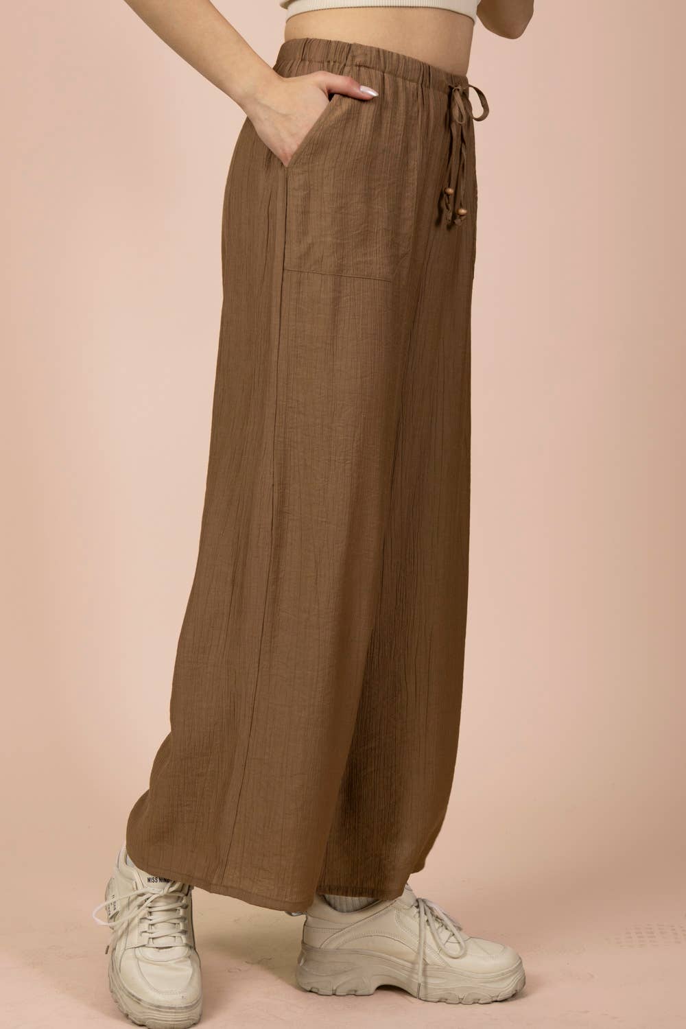 Easy, airy, and endlessly wearable, the East Coast Wide-Leg Woven Pants are your go-to for laid-back days with a polished feel. Designed in a breathable woven fabric with a soft textured finish, these pants feature a relaxed wide-leg silhouette that moves effortlessly with you. The elastic waistband with an adjustable tie offers all-day comfort, while functional side pockets add practicality. Dress them up with a fitted tank and sandals or keep it casual with sneakers and a tee—these are made to live in.