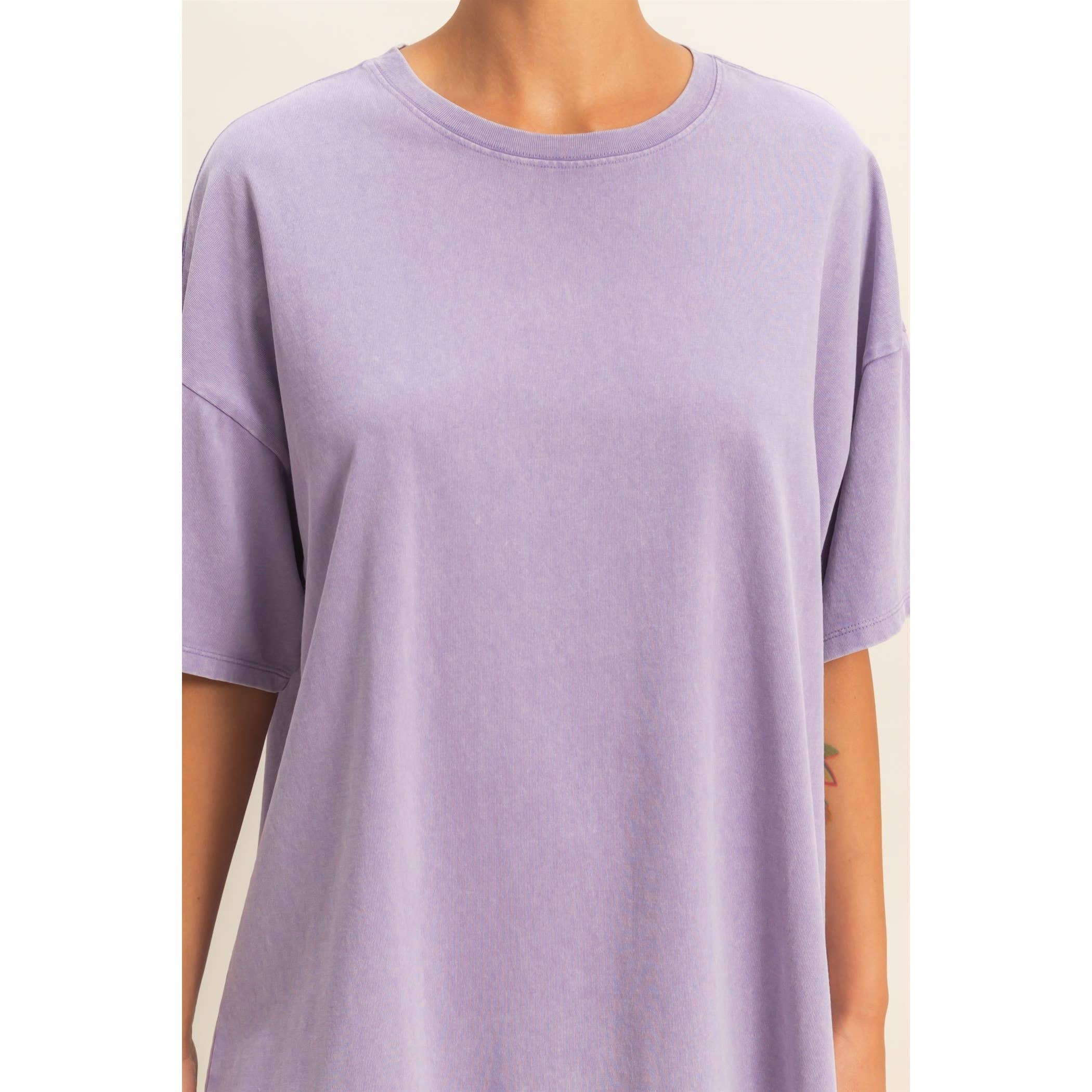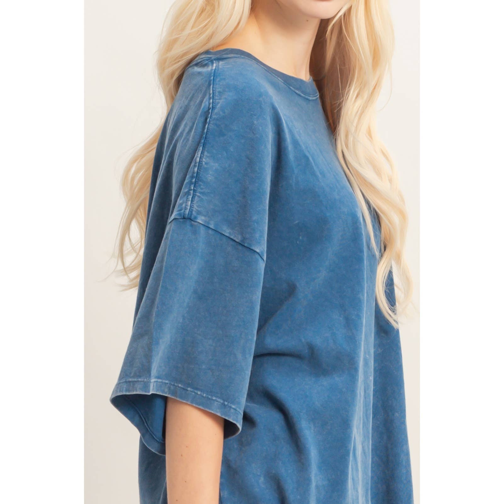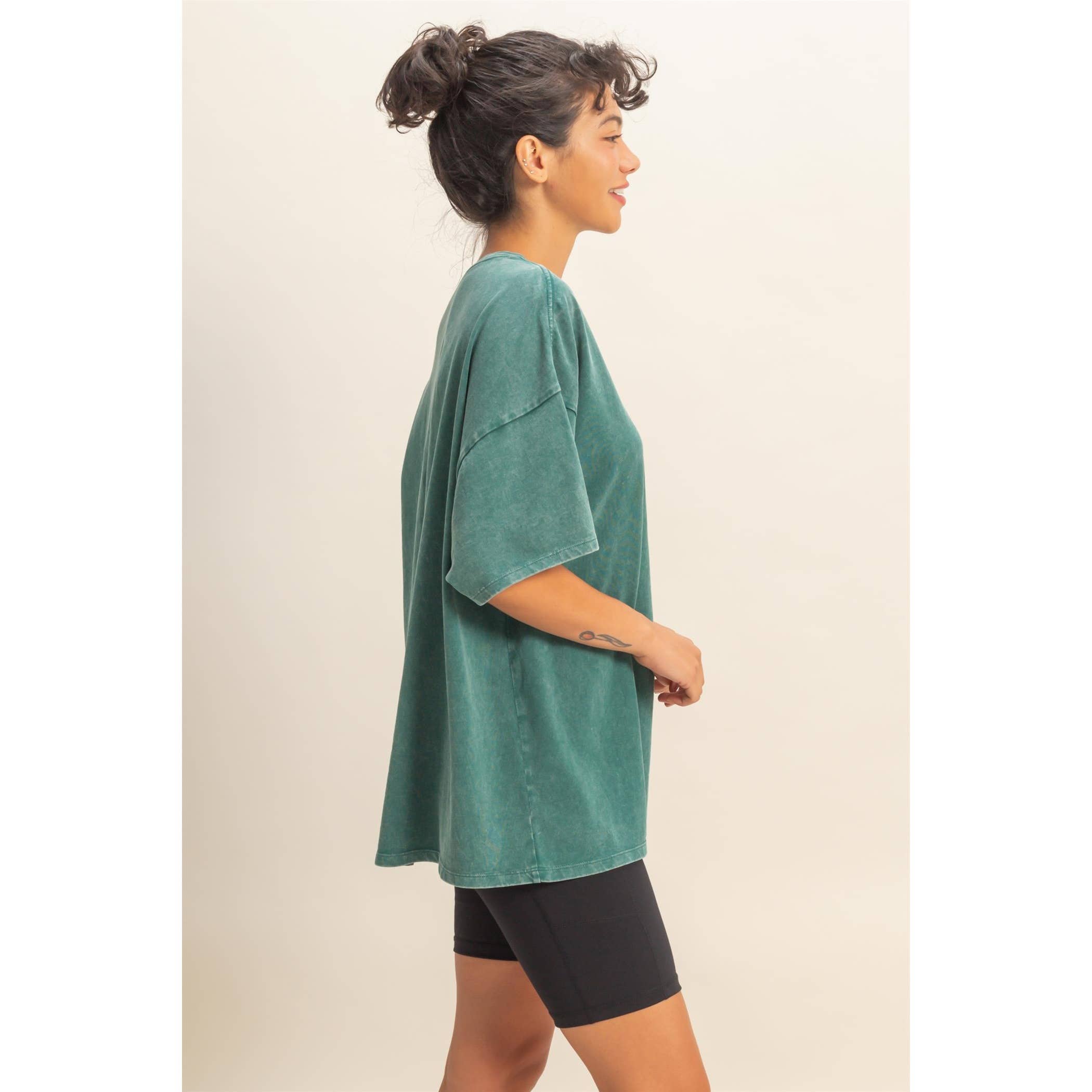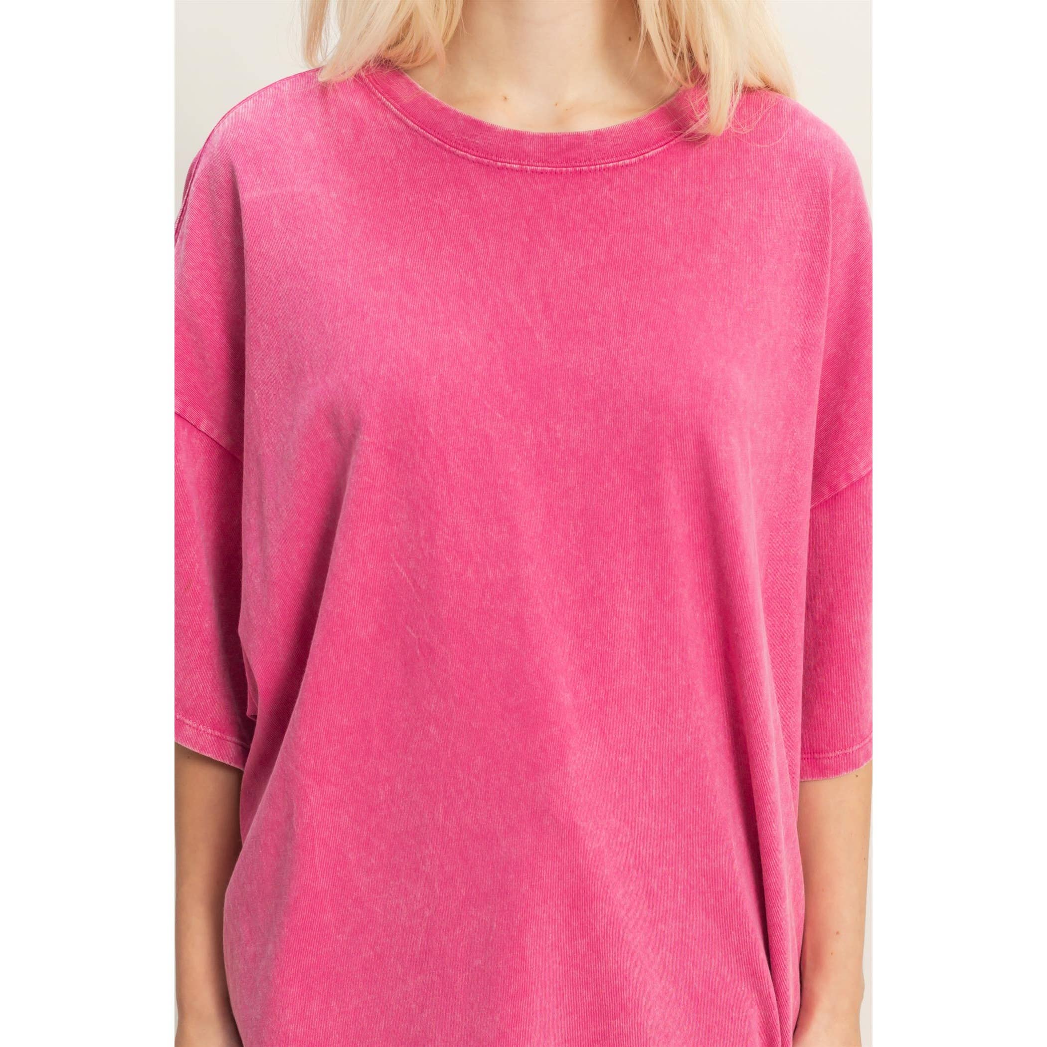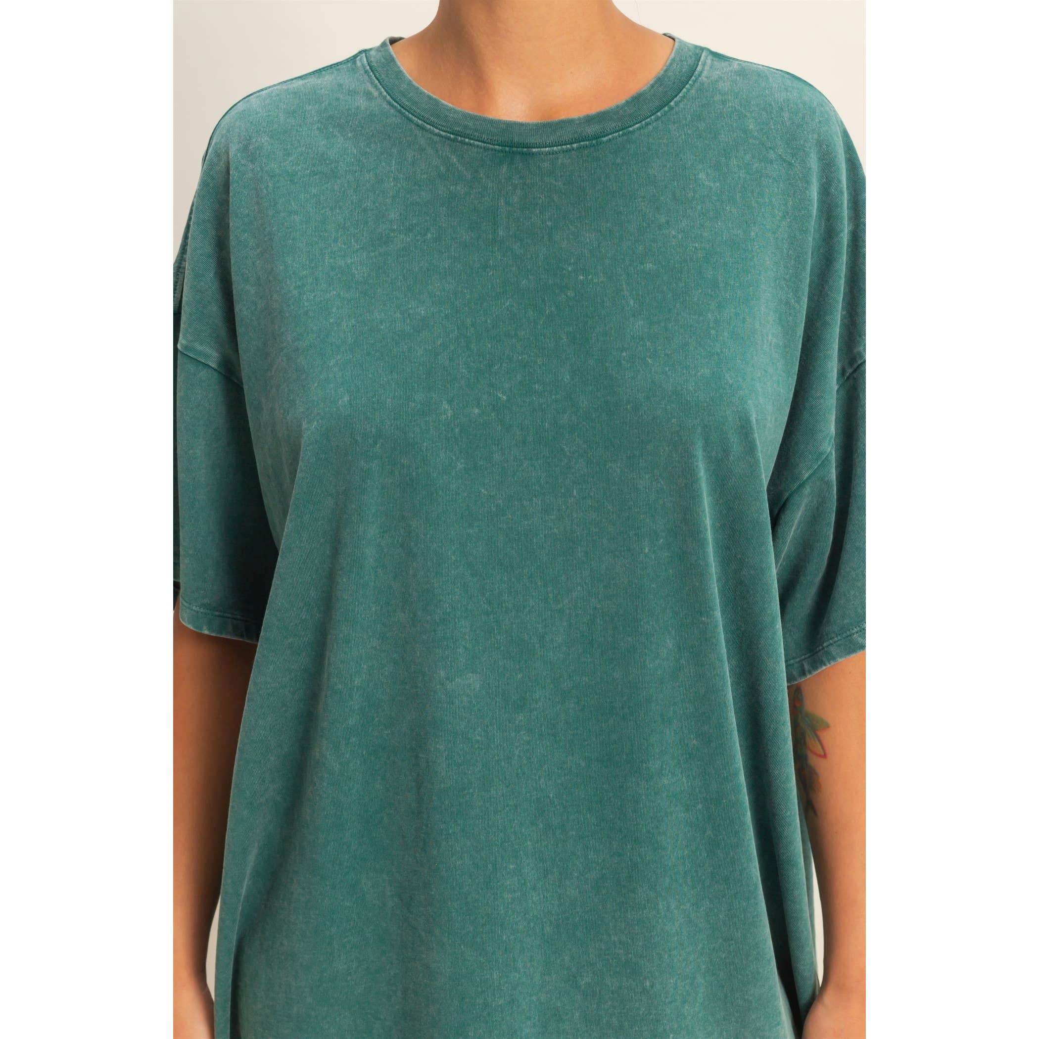 This oversized tee features a classic crew neckline and boxy drop shoulders with wide, relaxed sleeves. It is crafted for an authentic, vintage feel, enhanced by a unique mineral wash finish that lends a faded, lived-in look. Perfect for a relaxed outing, pair with distressed denim shorts and sneakers for a laid-back vibe.