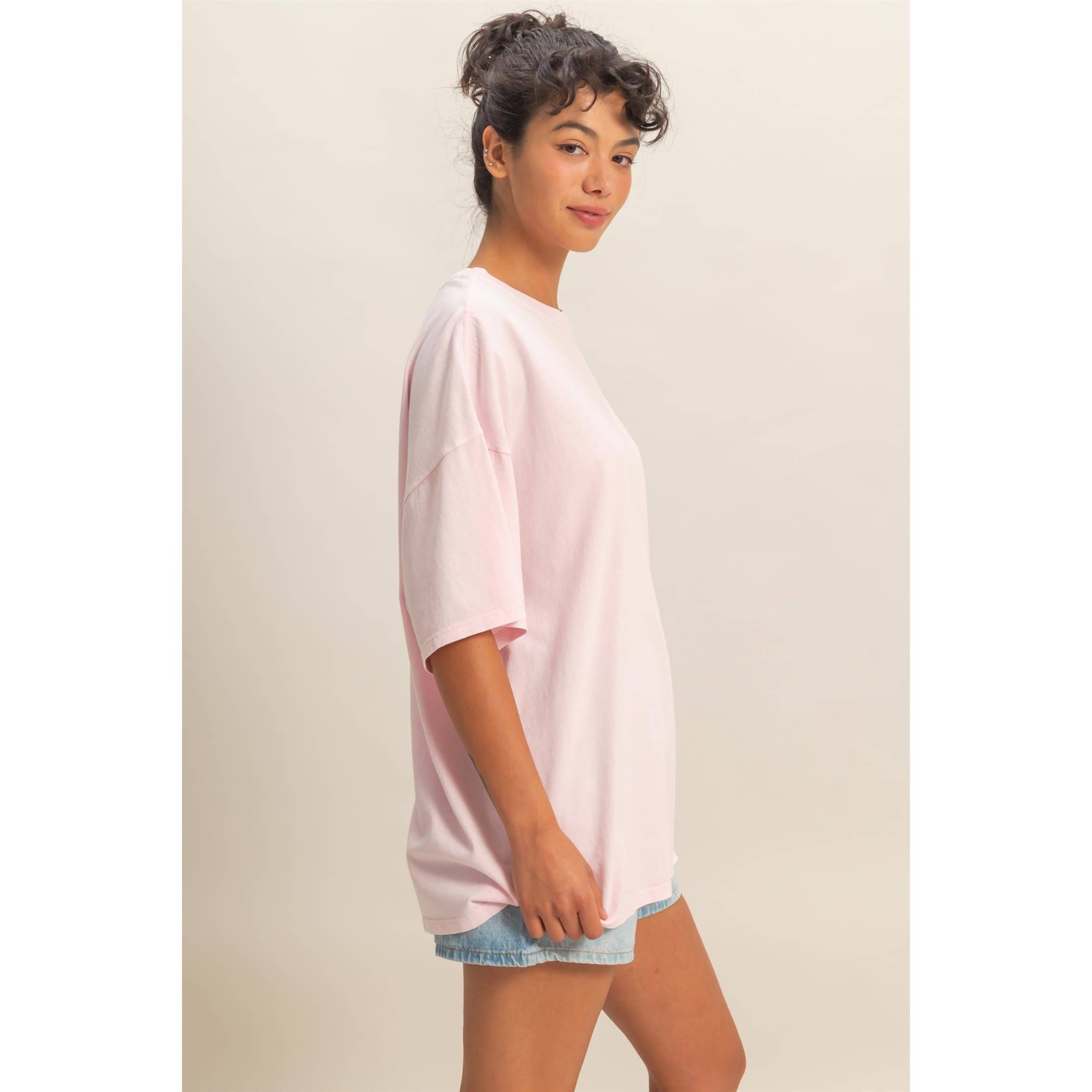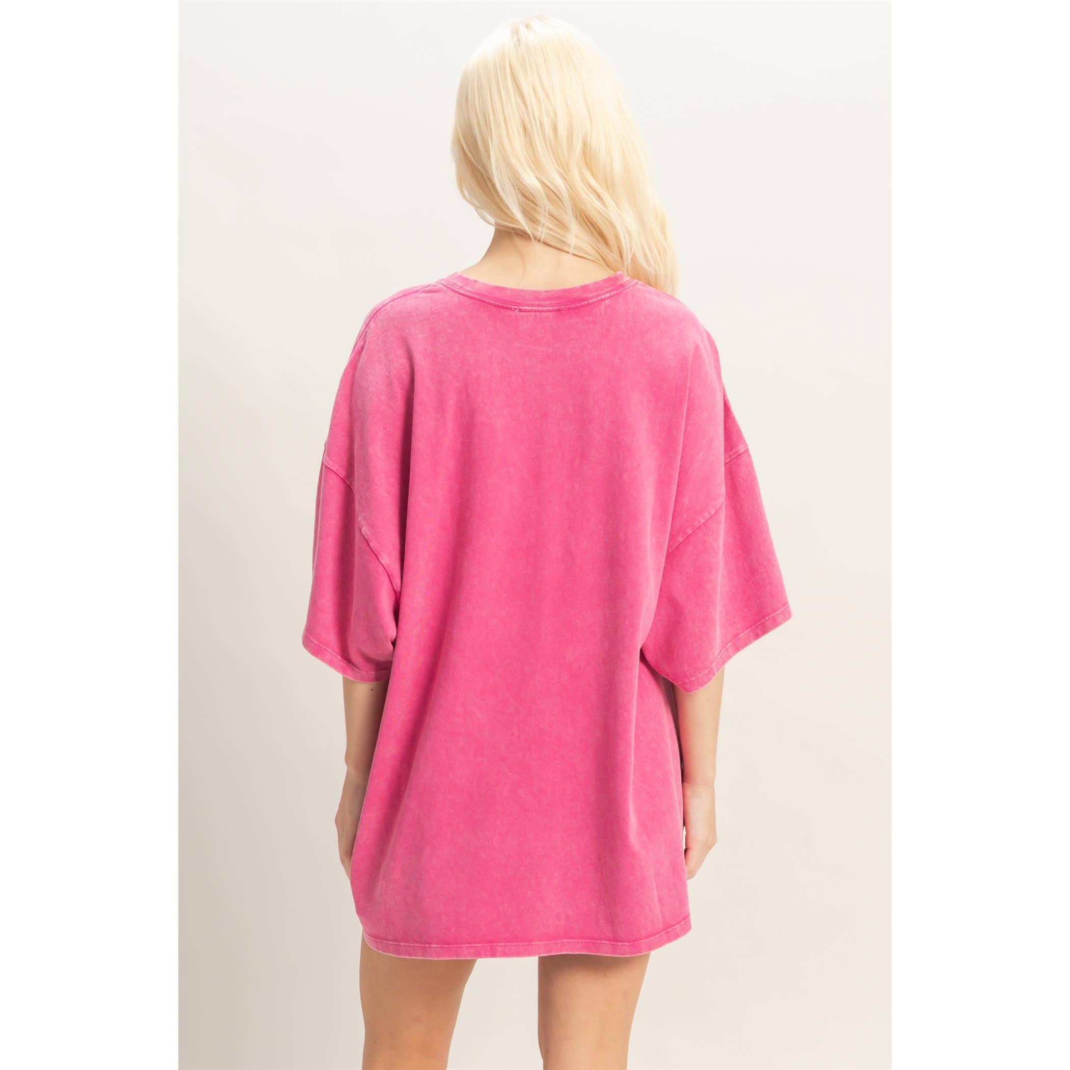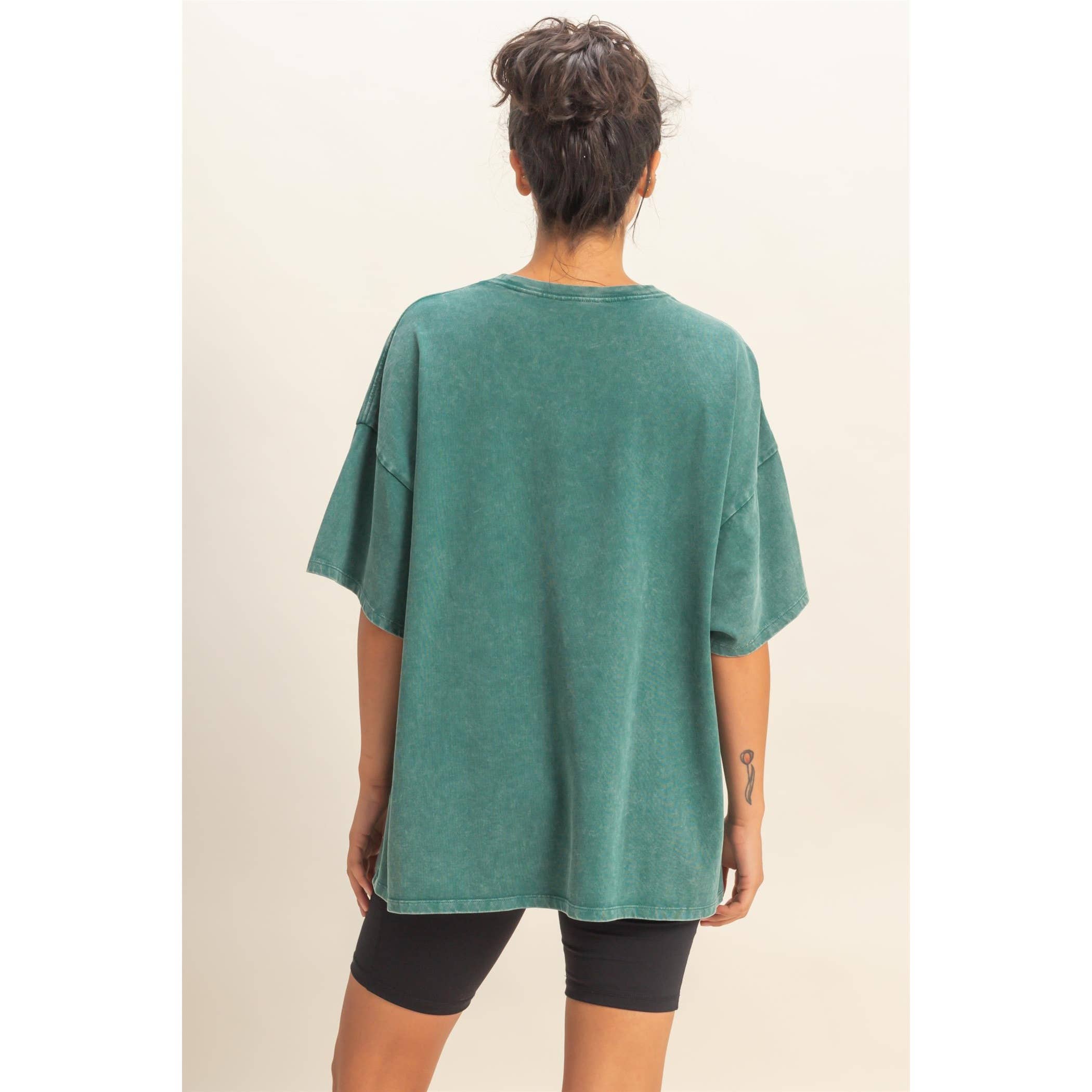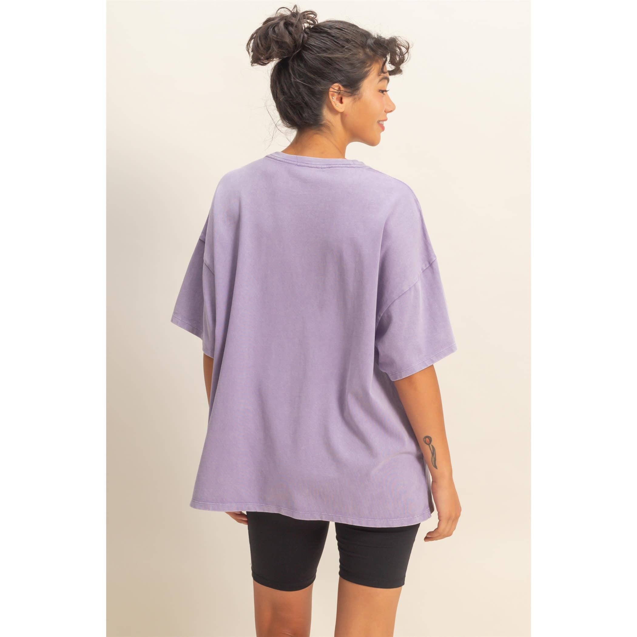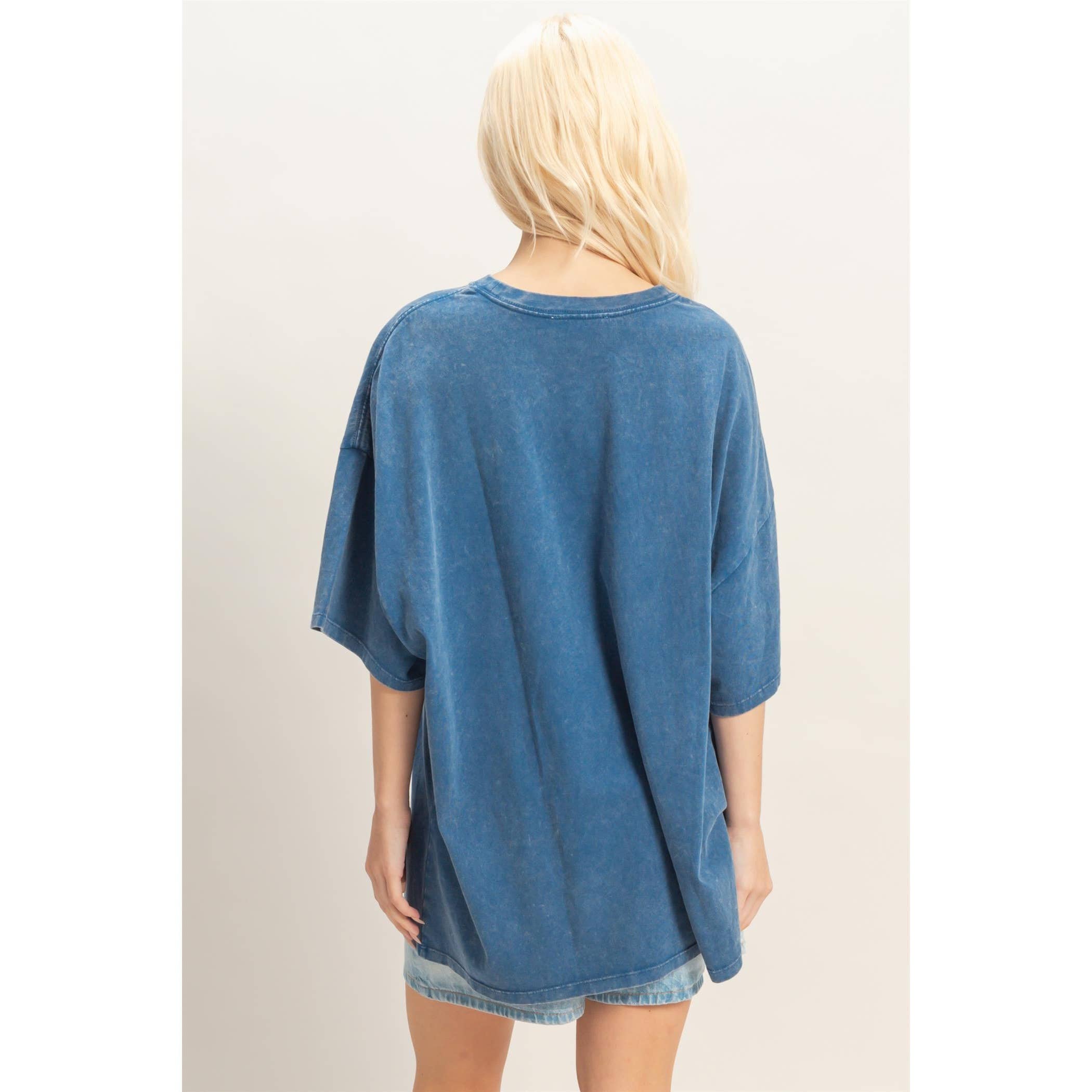 This oversized tee features a classic crew neckline and boxy drop shoulders with wide, relaxed sleeves. It is crafted for an authentic, vintage feel, enhanced by a unique mineral wash finish that lends a faded, lived-in look. Perfect for a relaxed outing, pair with distressed denim shorts and sneakers for a laid-back vibe.