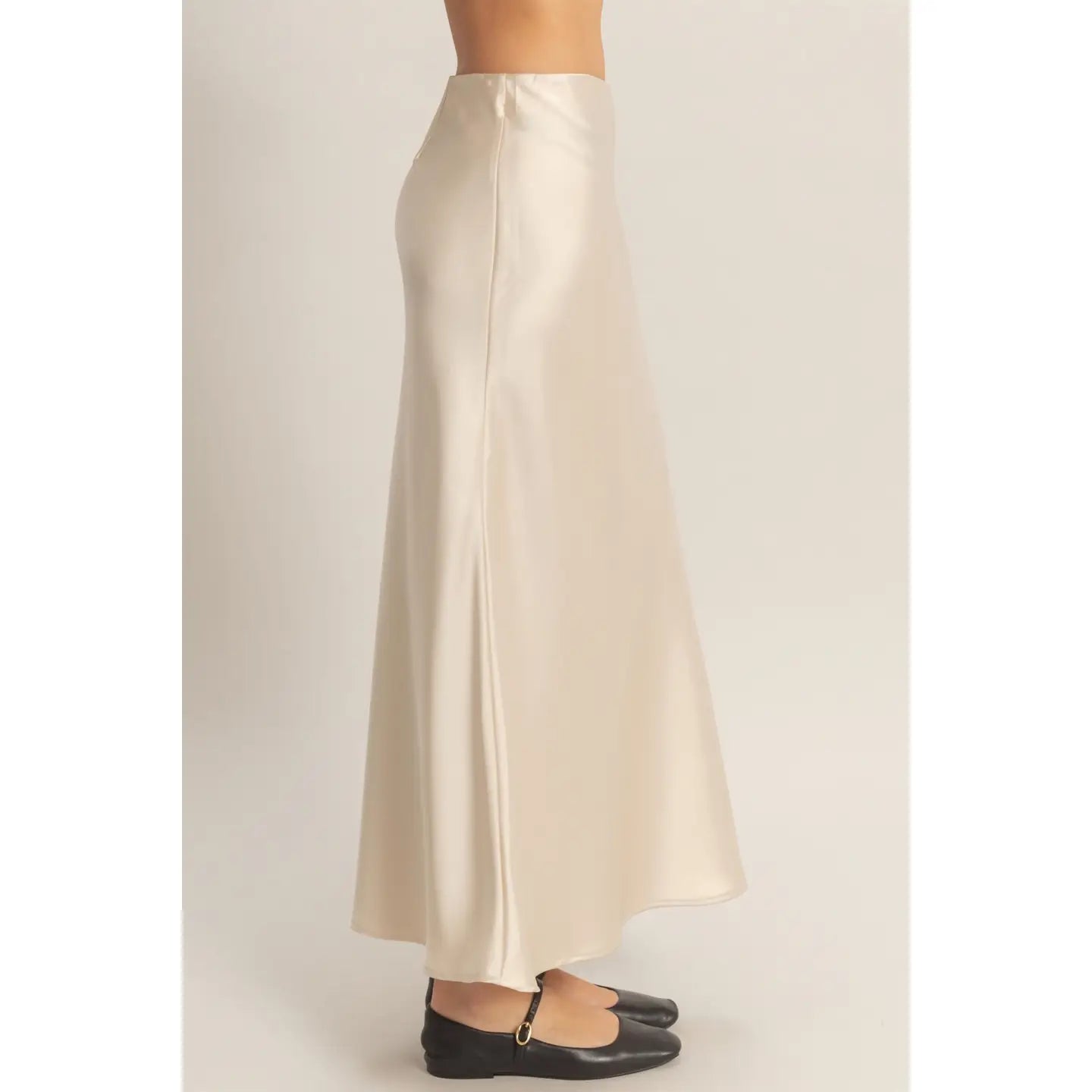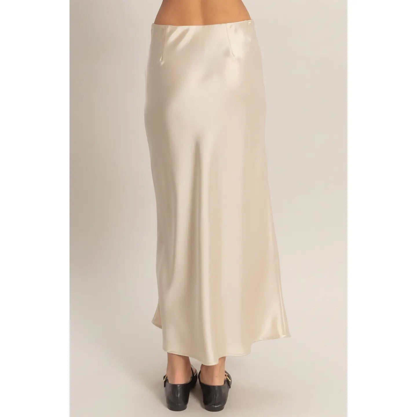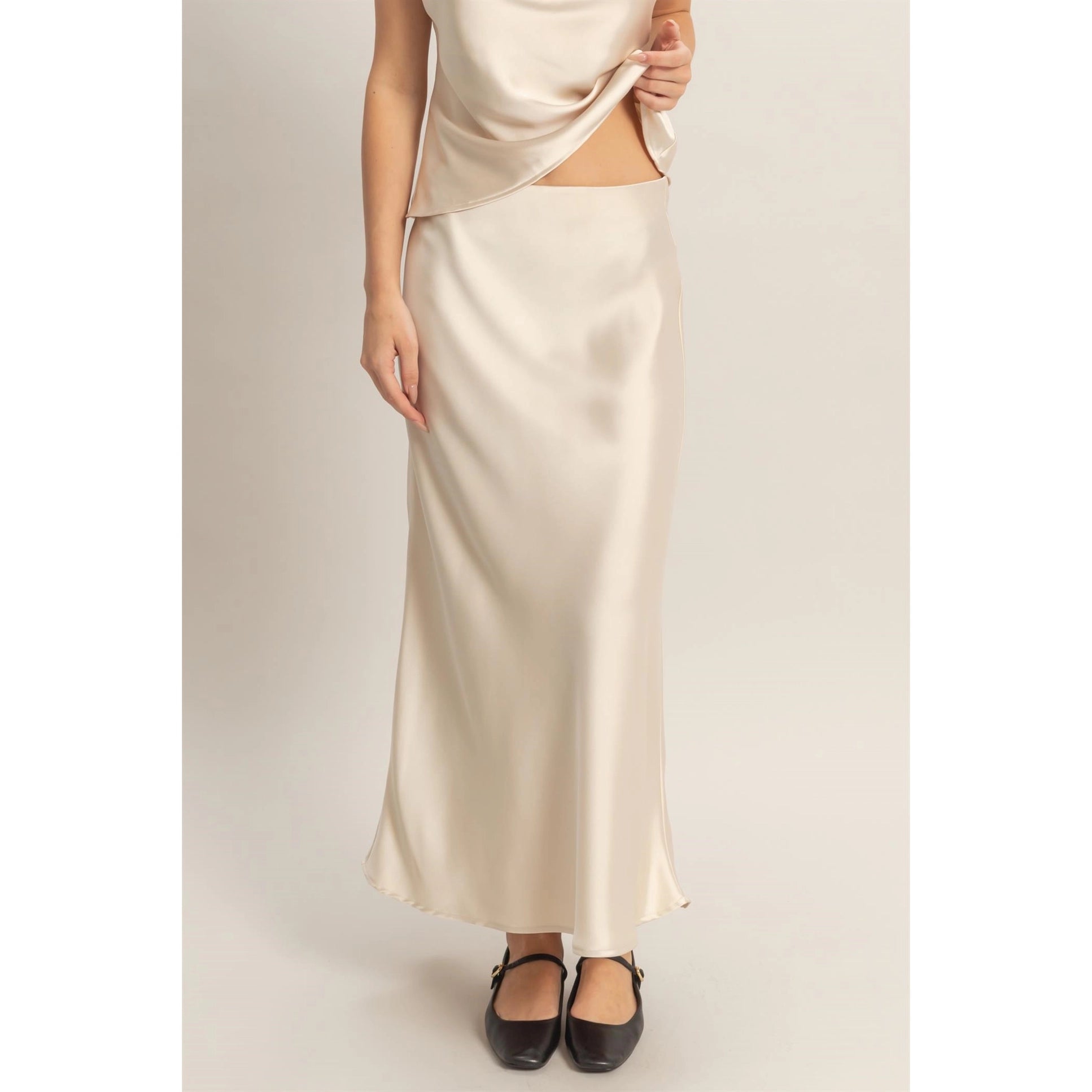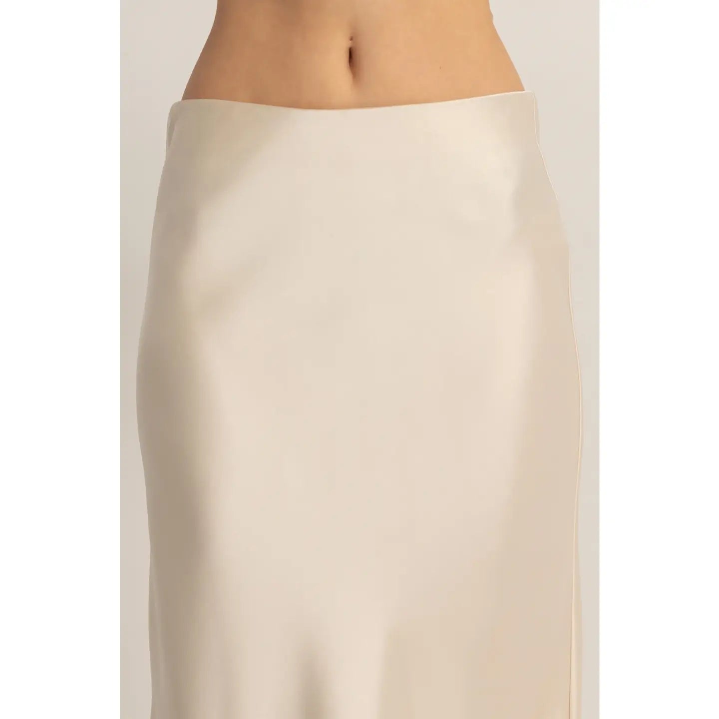 Soft shimmer meets effortless elegance in the Piper Satin Midi Skirt. Designed in a luminous cream satin with a subtle high-shine finish, this midi features a flattering high-rise elastic waistband and a bias-cut silhouette that skims the body beautifully. The silky, fluid drape creates an easy, feminine shape that moves with you — perfect for dressing up or styling casually.
