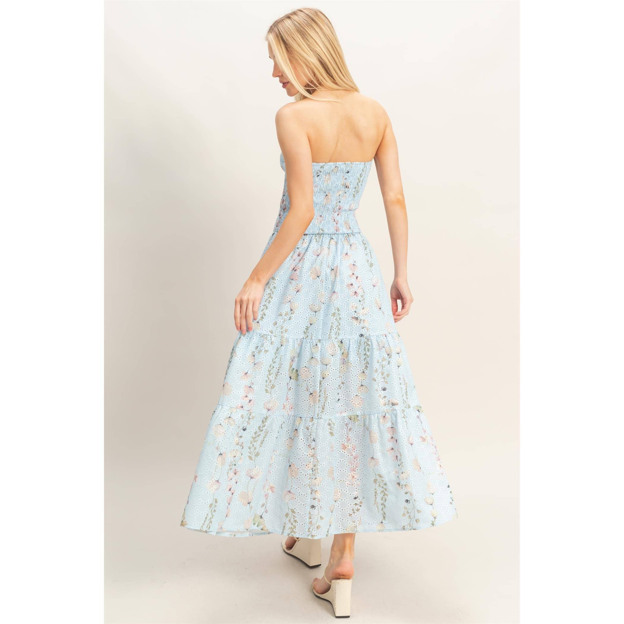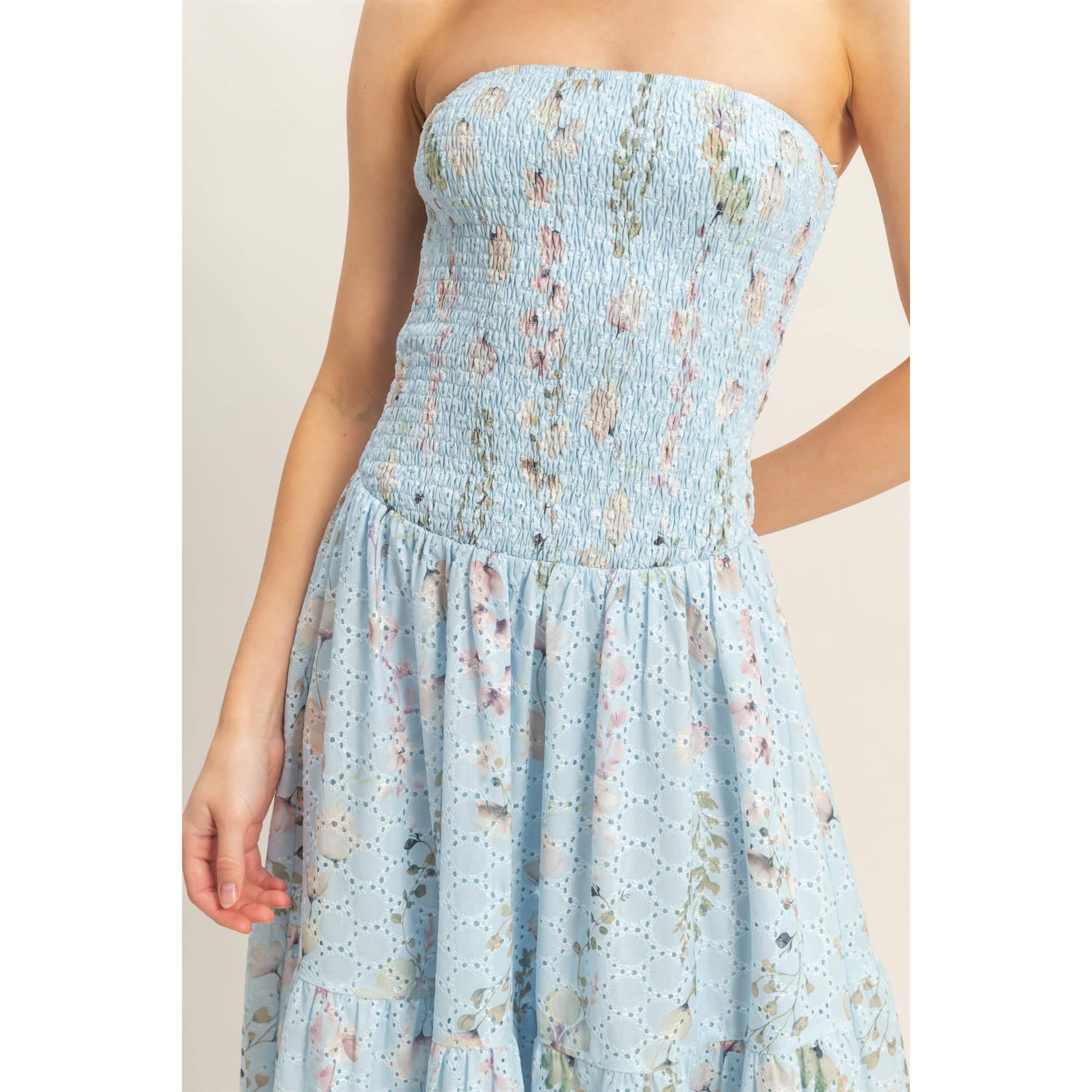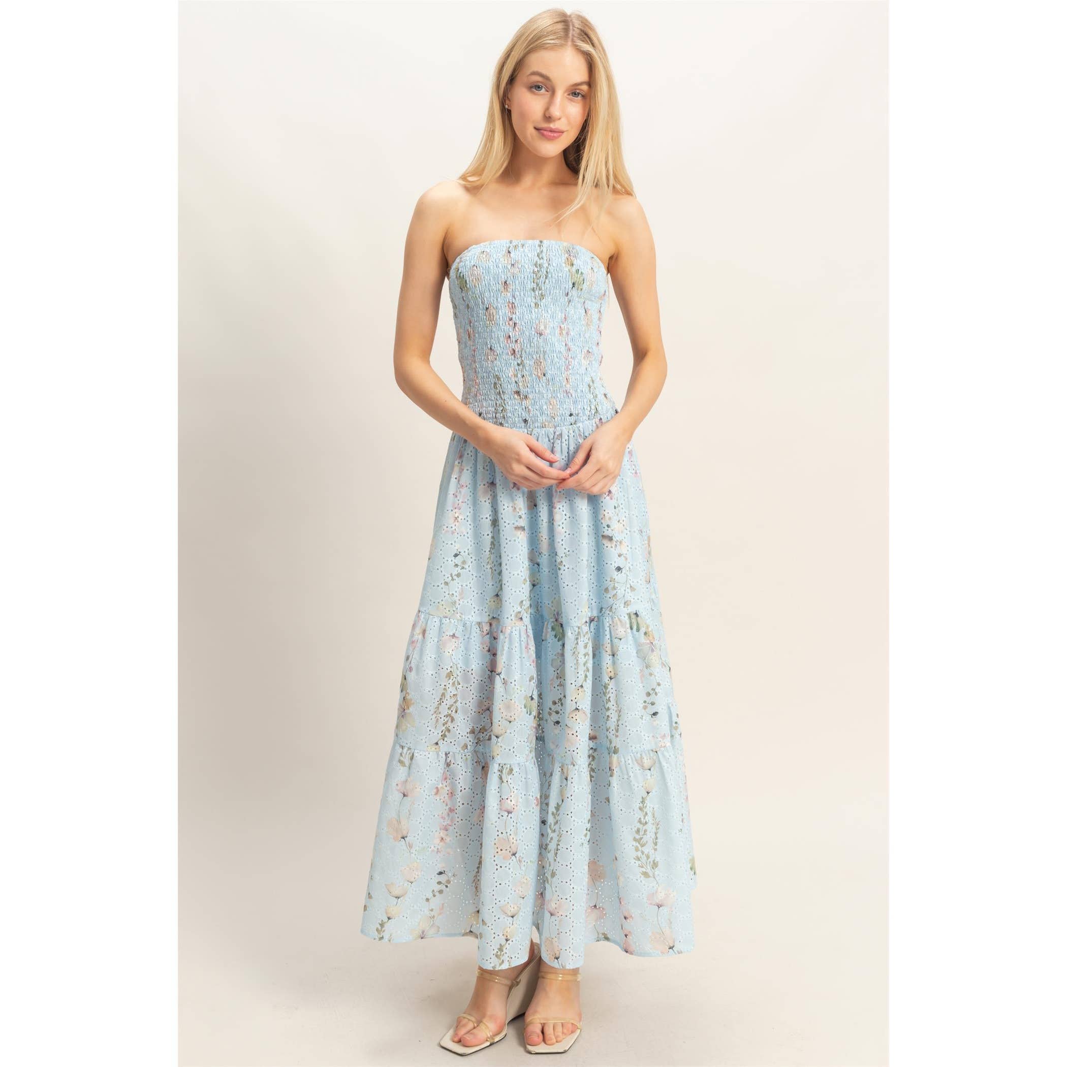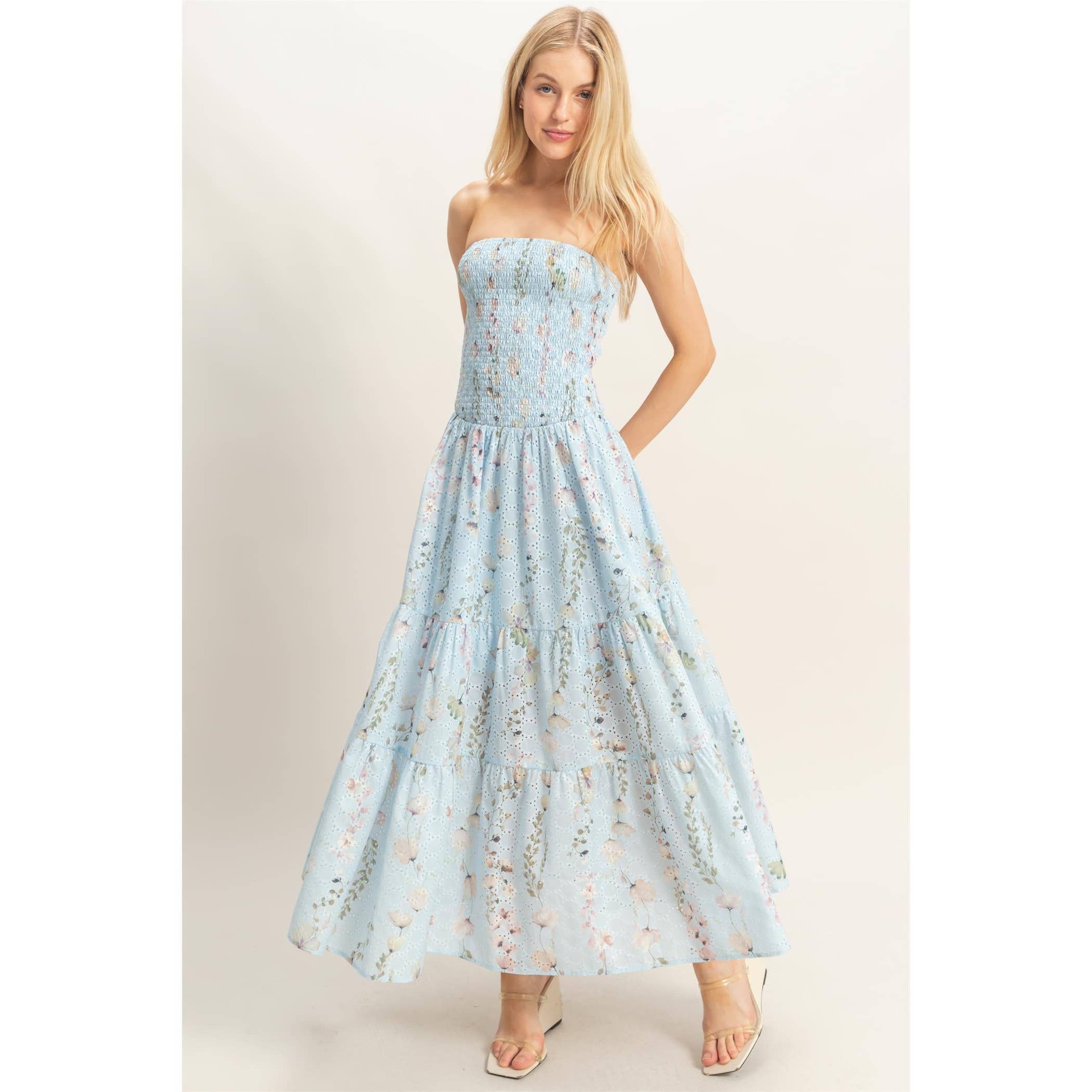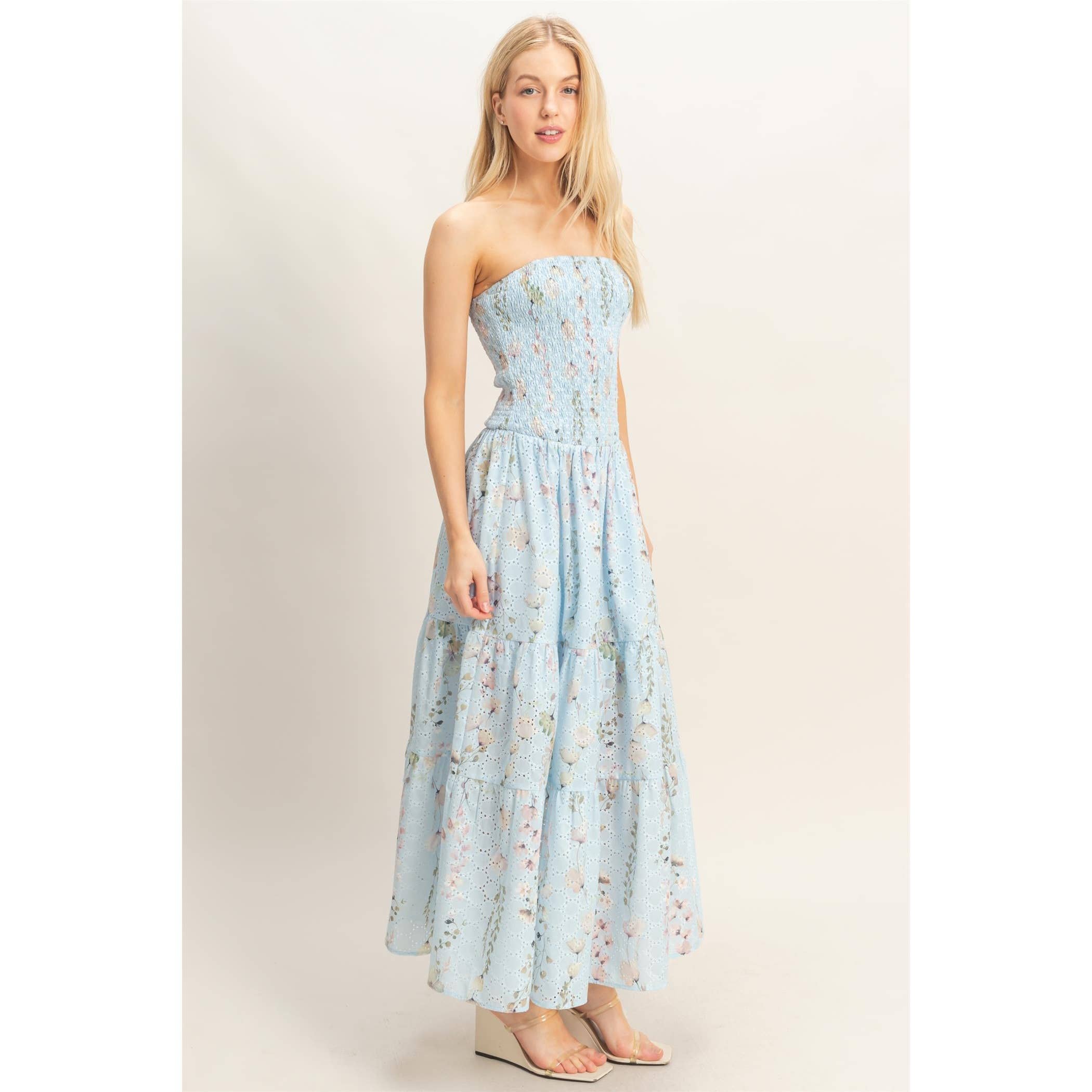 Twirl into sunshine with this adorable strapless maxi dress! Featuring a sweetly smocked bodice and cheerful floral print in gorgeous yellow tones, it's the perfect pick for carefree summer days. The lightweight, flowy fabric and playful tiered skirt create an effortlessly charming silhouette that dances with every step. Slip on your favorite espadrille wedges and you're ready for all your warm-weather adventures!