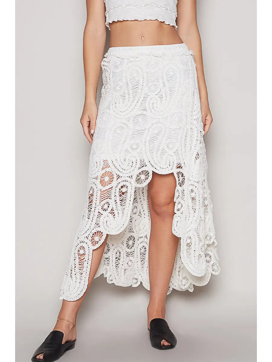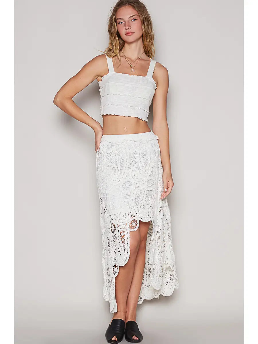 Romantic and effortlessly chic, the Valerie Crochet Skirt is all about dreamy details. Designed with an intricate lace overlay and scalloped hem, she flows with every step in a flattering high-low silhouette. Perfect for brunch, beachside dinners, or dressed-up summer nights, Maribel adds a touch of elegance to any look.