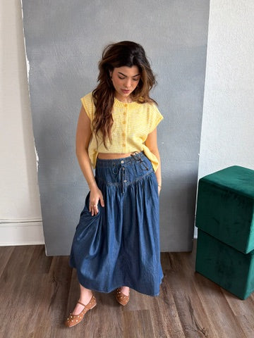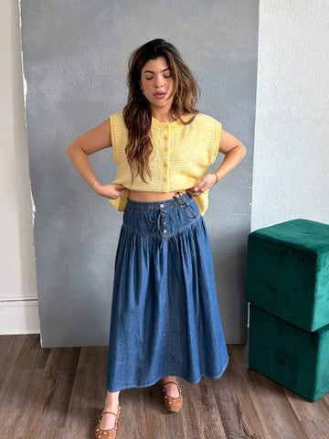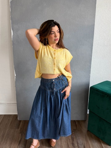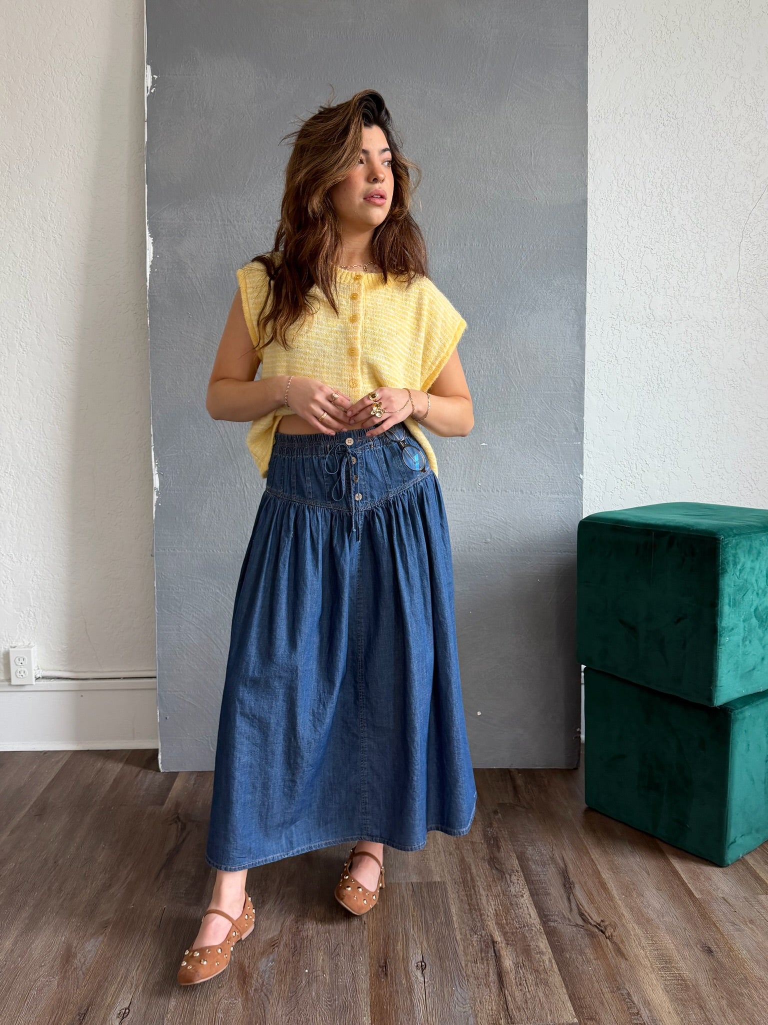 Effortless, feminine, and made for everyday styling — the Bluebell Coast Denim Maxi Skirt is a timeless staple with thoughtful detail. Designed in soft 100% cotton denim, this A-line silhouette features an elastic waistband for comfort, mock button-front detailing, and a pintuck yoke that adds subtle structure. The front tie detail gives it that extra touch of charm, while the flowy maxi length keeps it easy and flattering.
