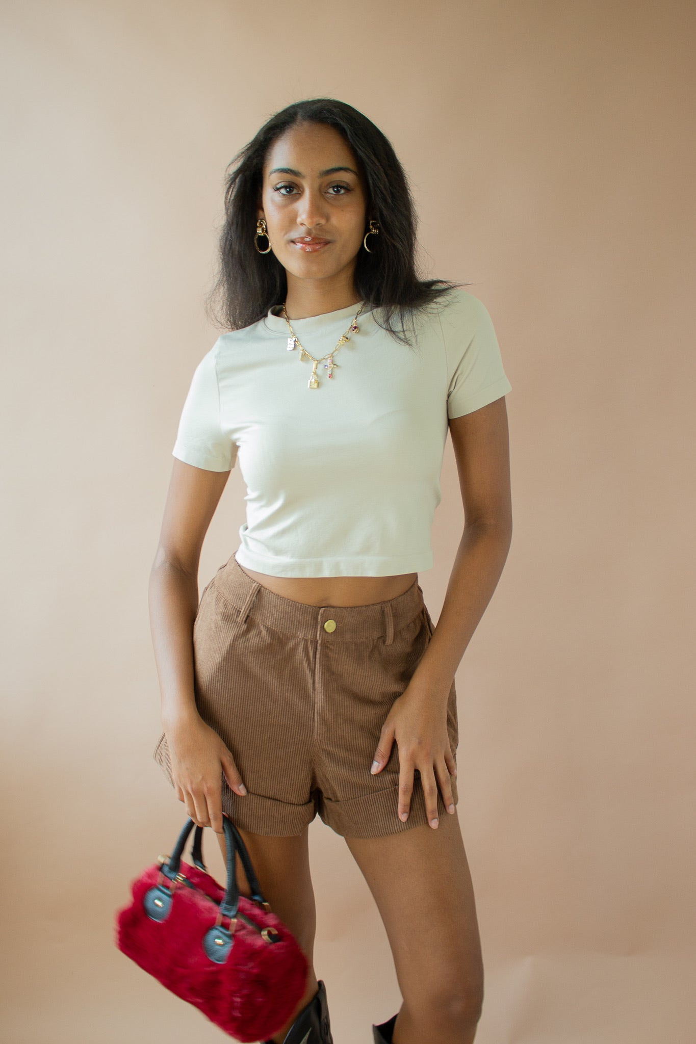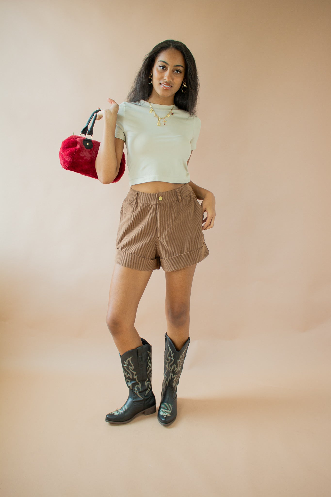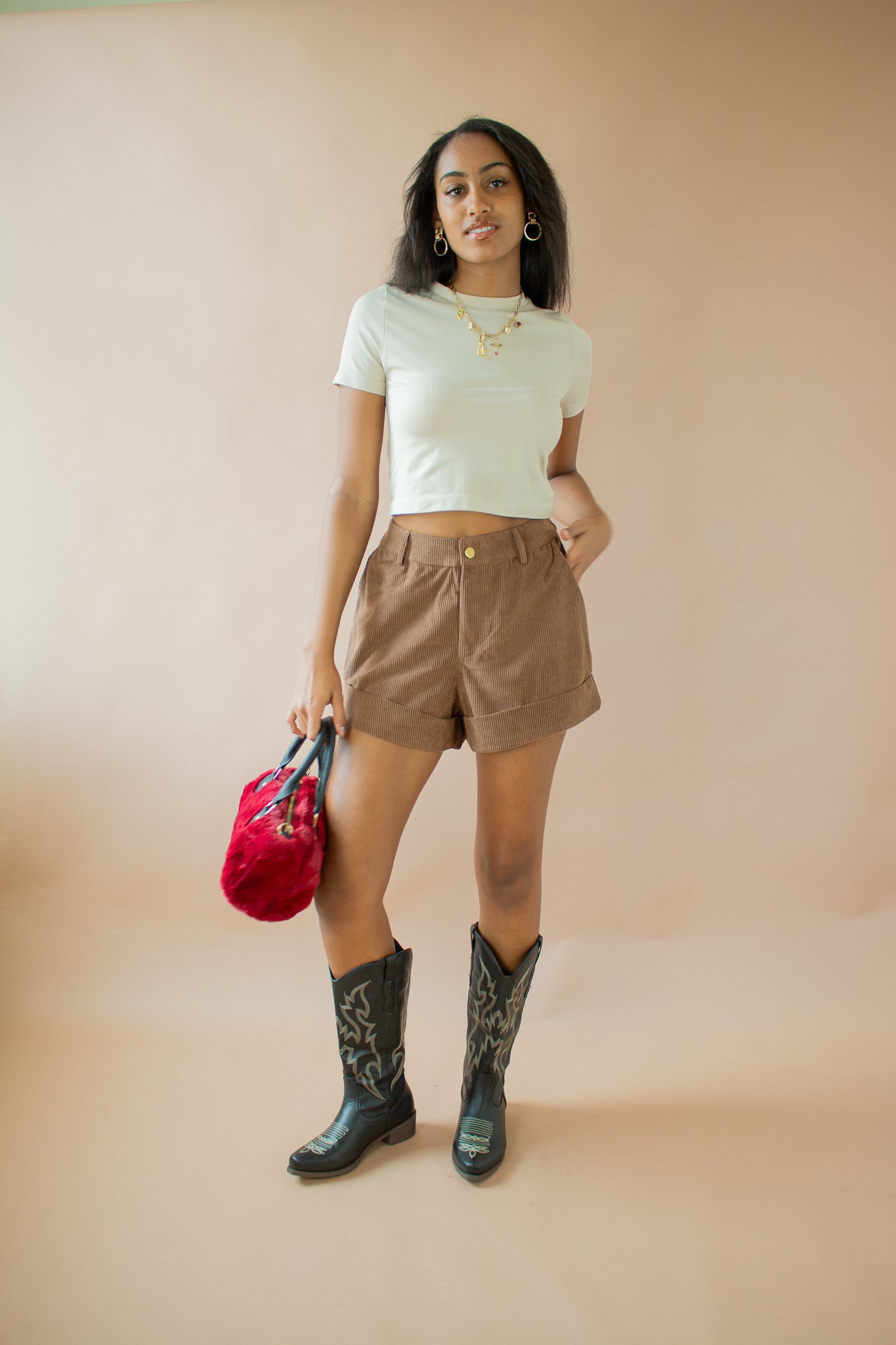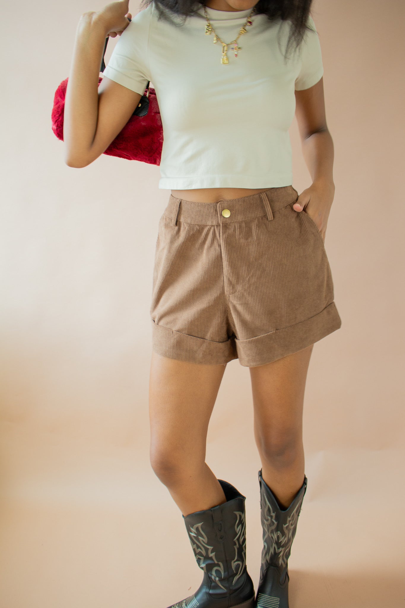 Our go-to favorites for fall styling! Meet the Zoey Corduroy Shorts in brown. Featuring an elastic waistband for a comfortable fit, front and back pockets and button closure. It has a folded trim detail for a polished look and did we mention how soft they are to touch? Style these with your favorite tee or oversized sweater.